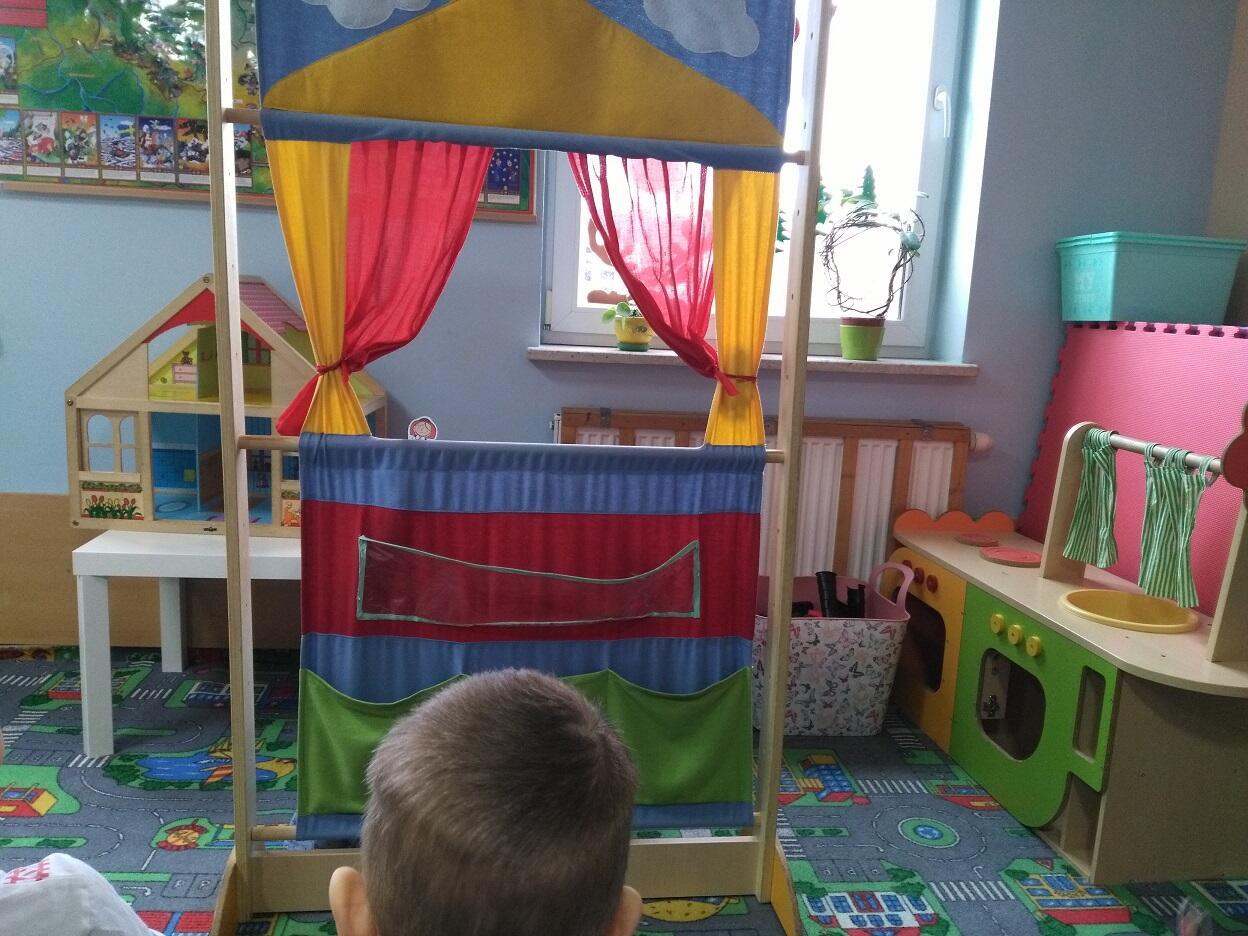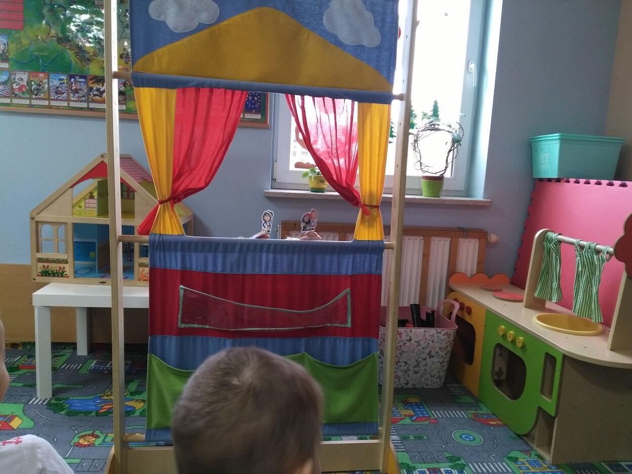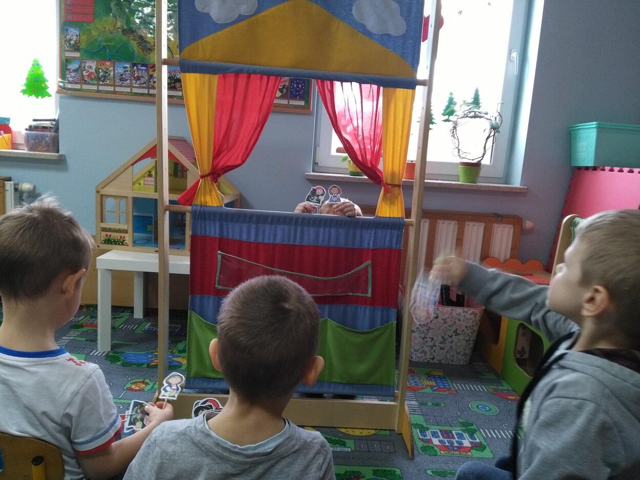 Podczas naszego odpoczynku poobiedniego postanowiliśmy pobawić się w widzów i aktorów. Dzieci przygotowały podczas zajęć małe kukiełki, umieszczone na wykałaczkach, które wykorzystaliśmy do zabawy w teatr. Dzieci tworzyły dowolne dialogi dla postaci z bajek, rozwijając przy tym słownictwo i własną kreatywność. Każde z dzieci przygotowało w małych grupach swoje role, które odegrali na "deskach" naszego przedszkolnego teatrzyku. Bawiliśmy się wspaniale, niektóre role rozbawiły nas niemal do łez.