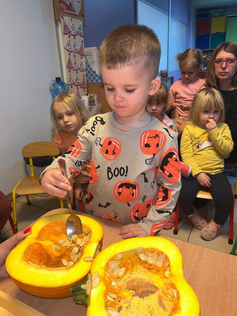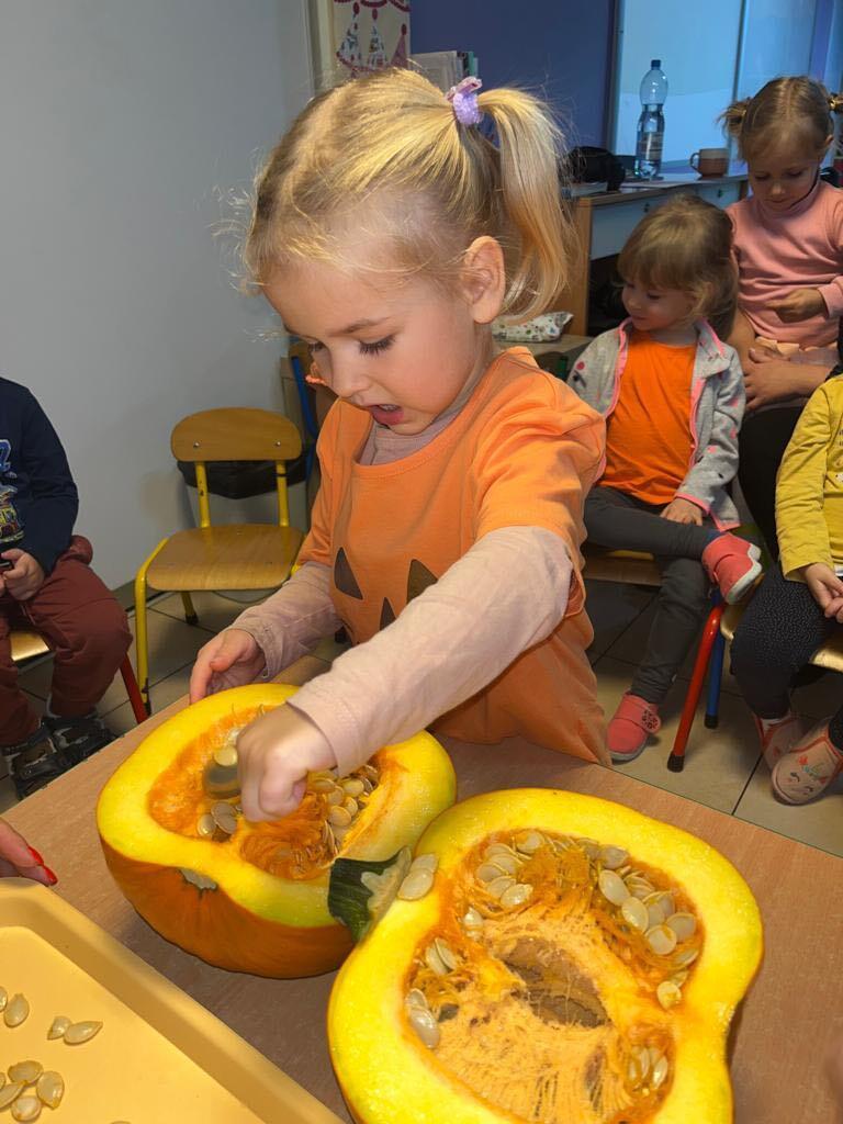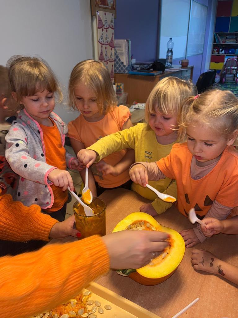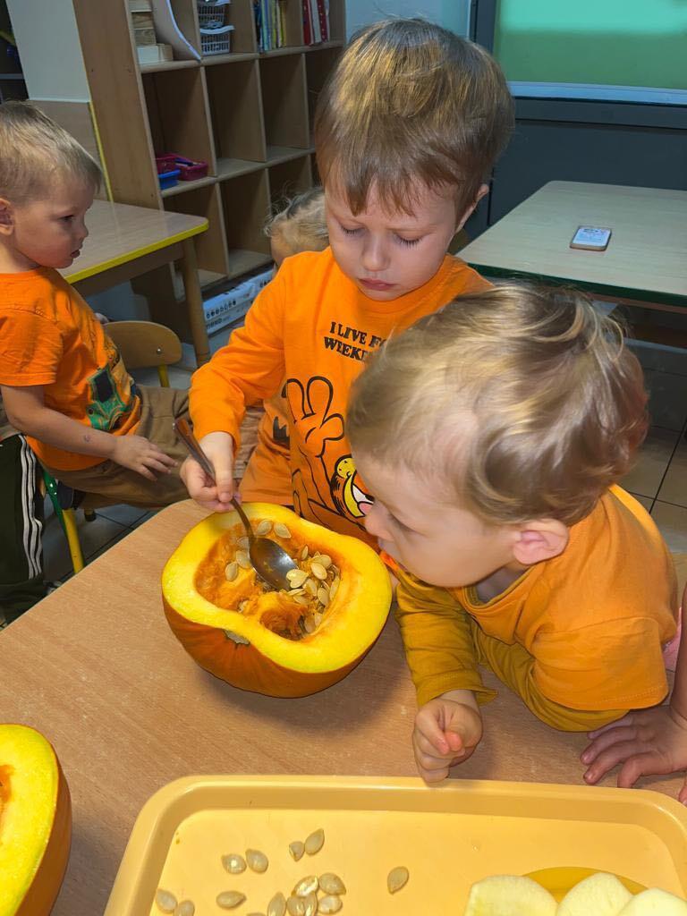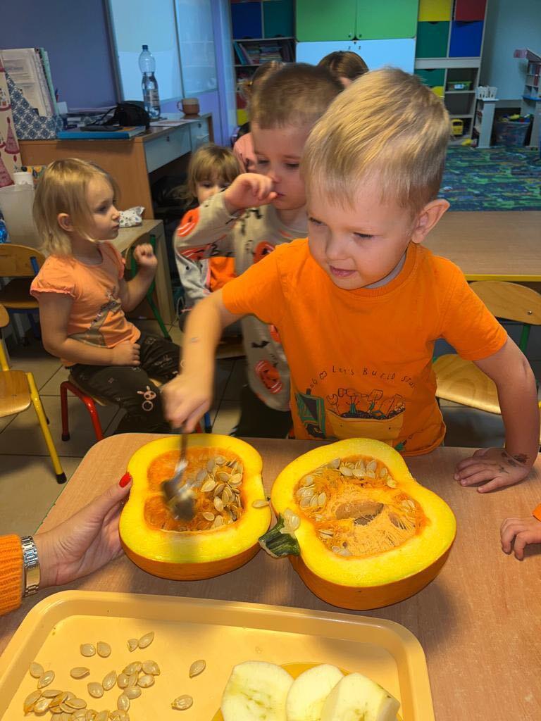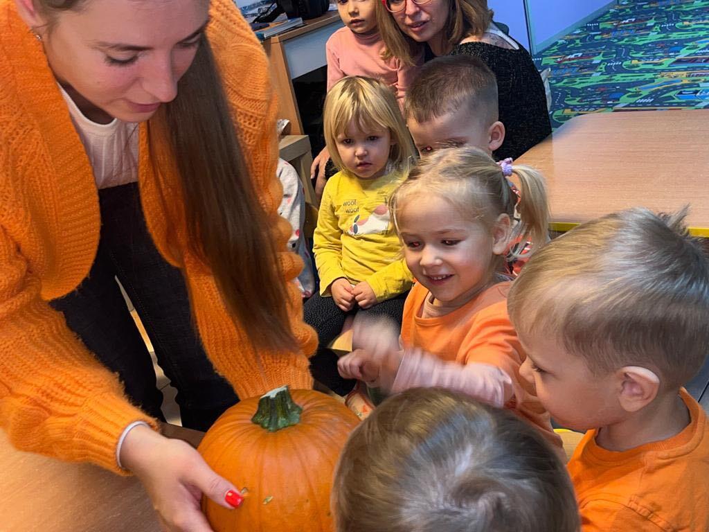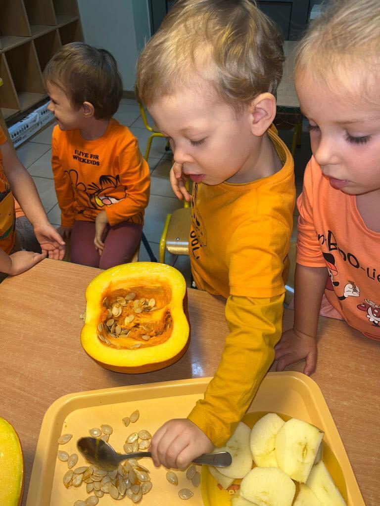 W ostatnim tygodniu października we wszystkich grupach w naszym przedszkolu dzieciaki poznawały walory warzyw z rodziny dyniowatych. W tym dni obowiązywał kolor pomarańczowy na naszych ubraniach. Dzieci wraz paniami przecinały dynie na pół by zobaczyć jak wygląda ona w środku. Przedszkolaki mogły oglądać, dotykać różnej wielkości i różnego ubarwienia dynie.