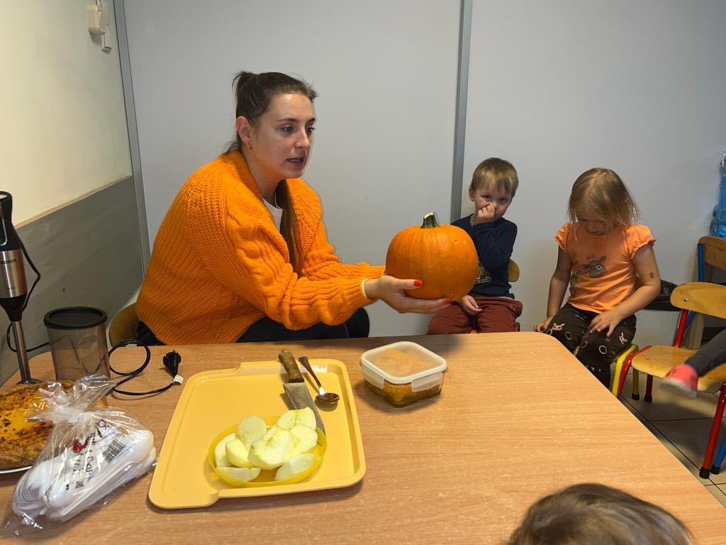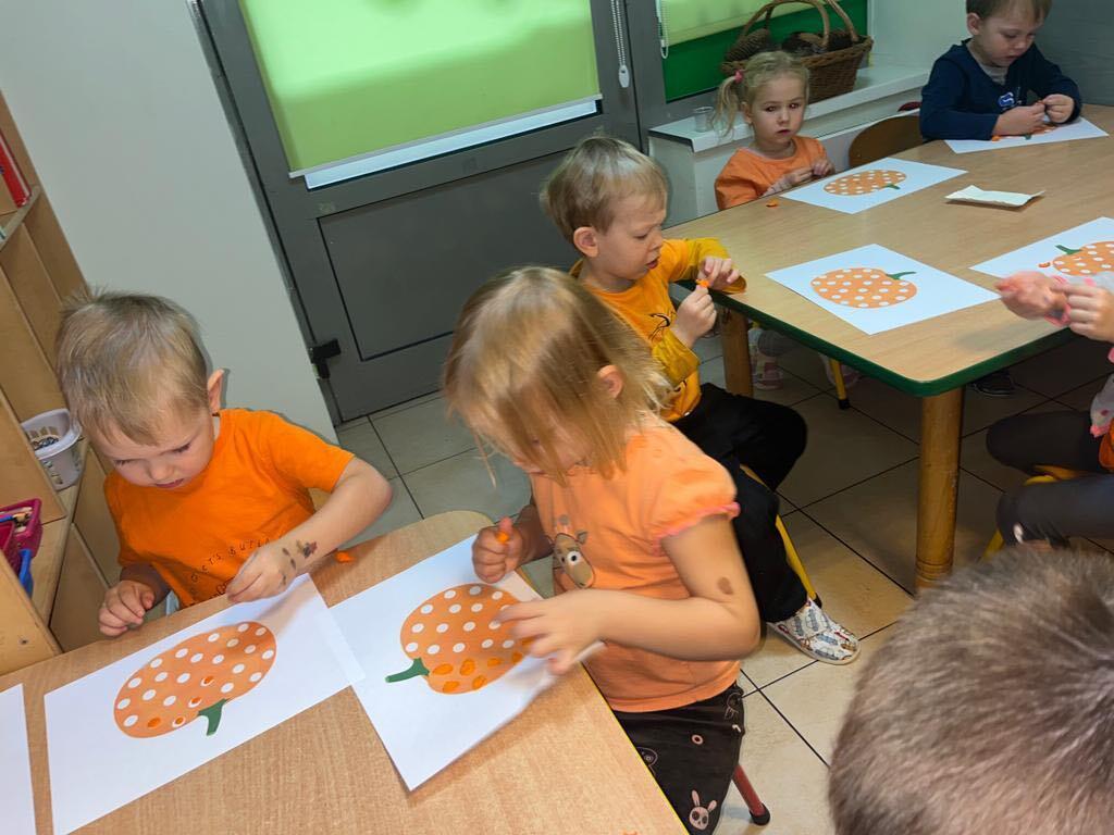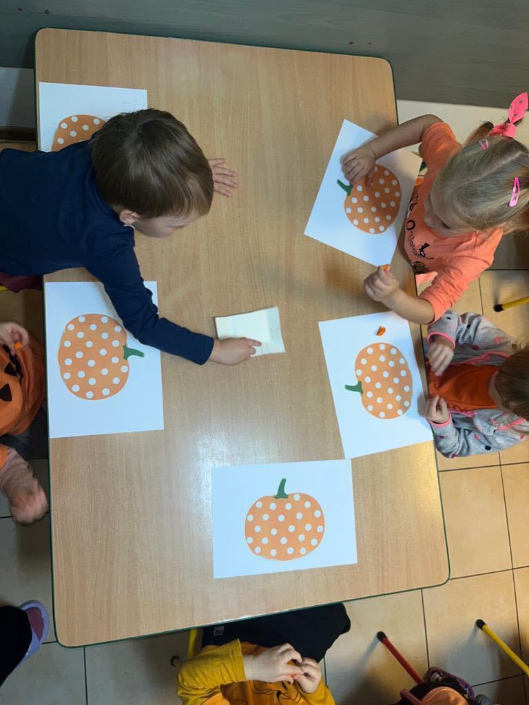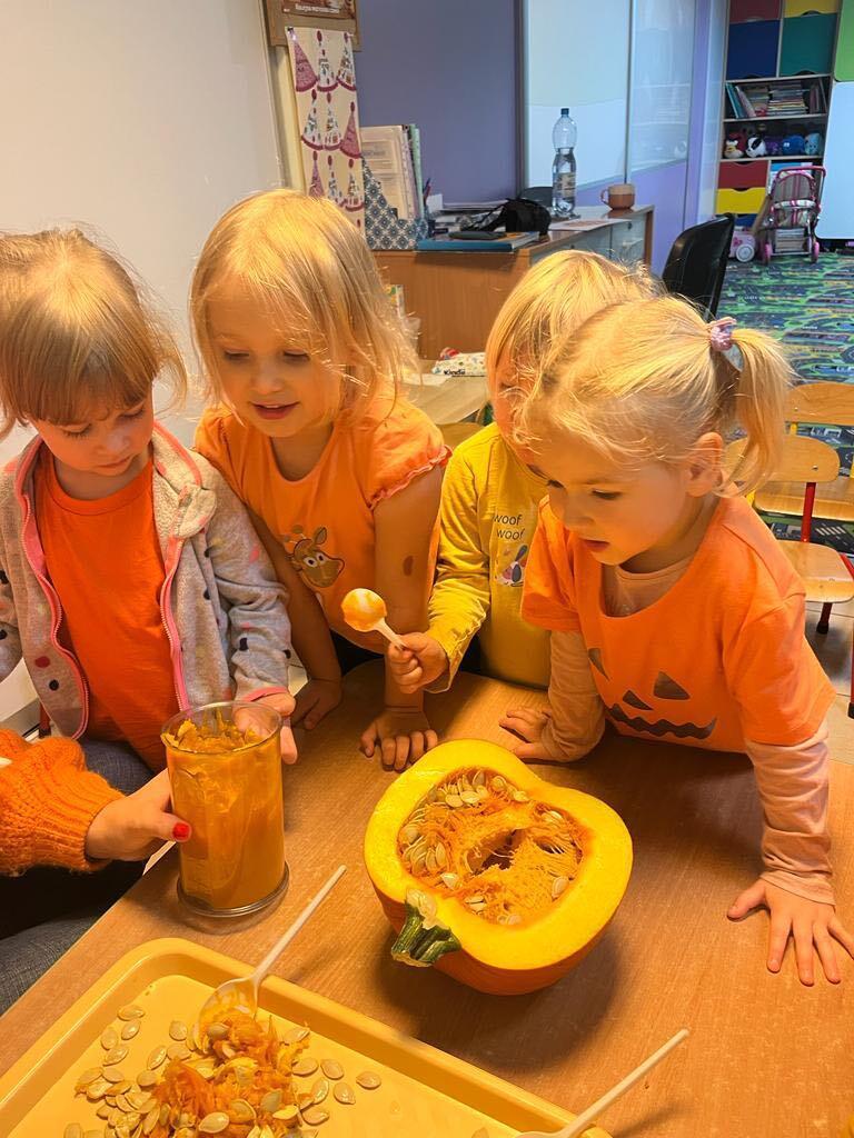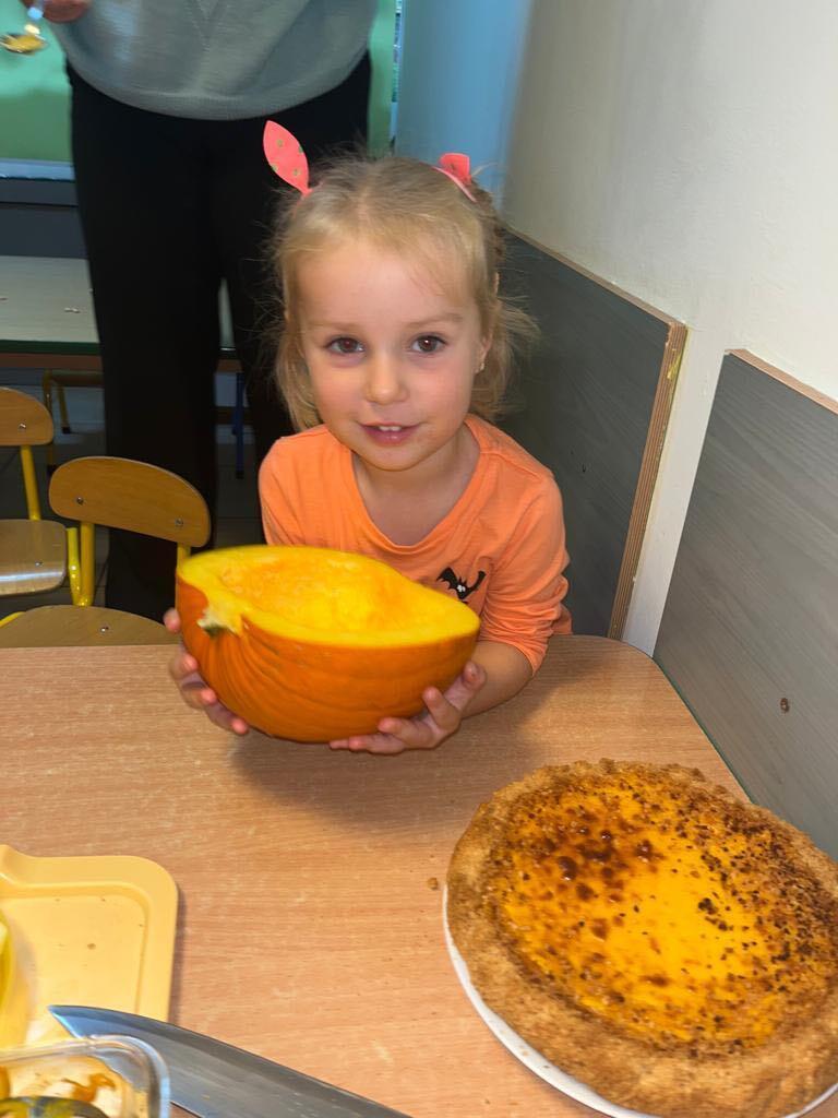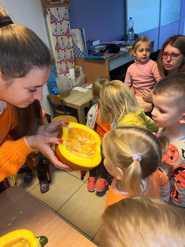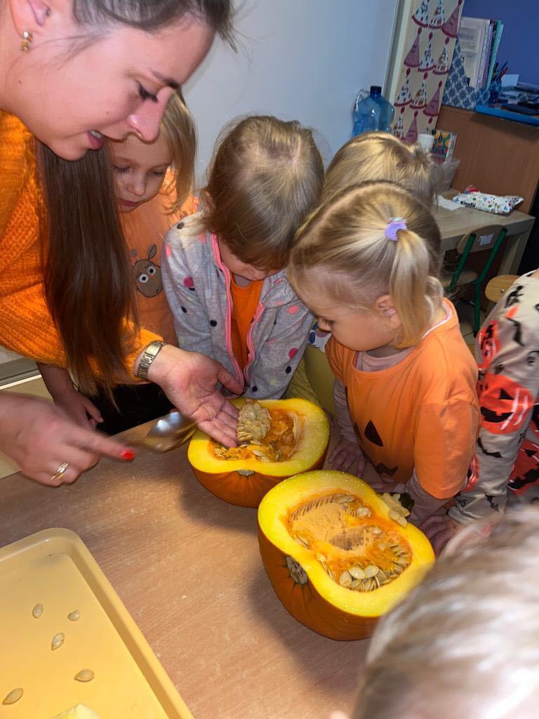 W ostatnim tygodniu października we wszystkich grupach w naszym przedszkolu dzieciaki poznawały walory warzyw z rodziny dyniowatych. W tym dni obowiązywał kolor pomarańczowy na naszych ubraniach. Dzieci wraz paniami przecinały dynie na pół by zobaczyć jak wygląda ona w środku. Przedszkolaki mogły oglądać, dotykać różnej wielkości i różnego ubarwienia dynie.