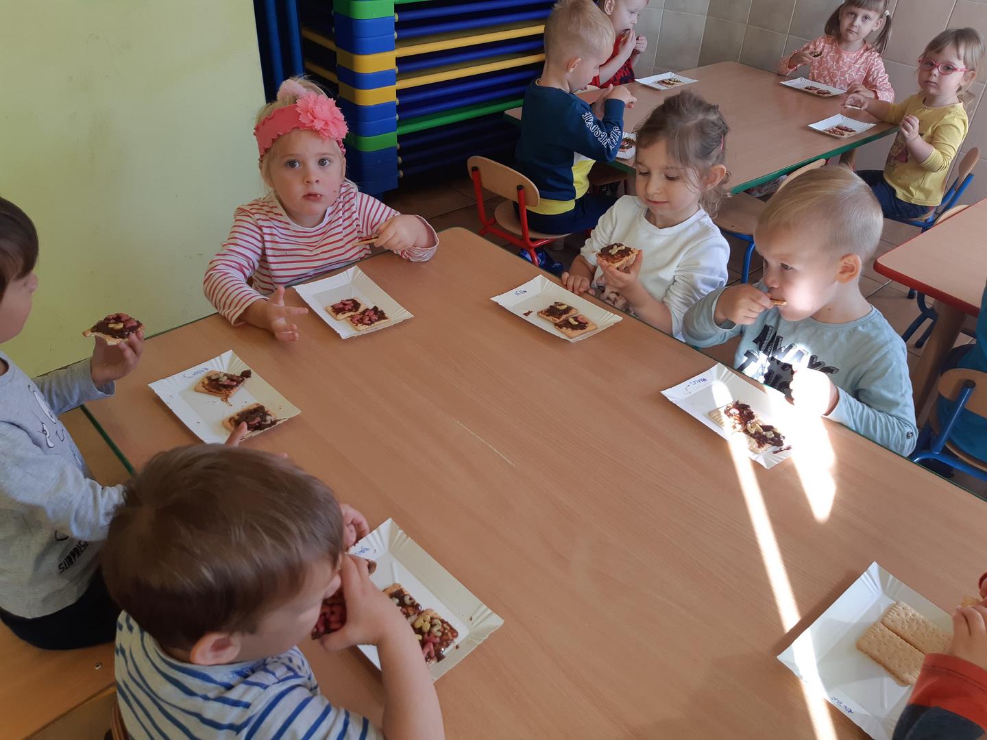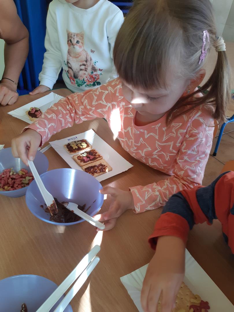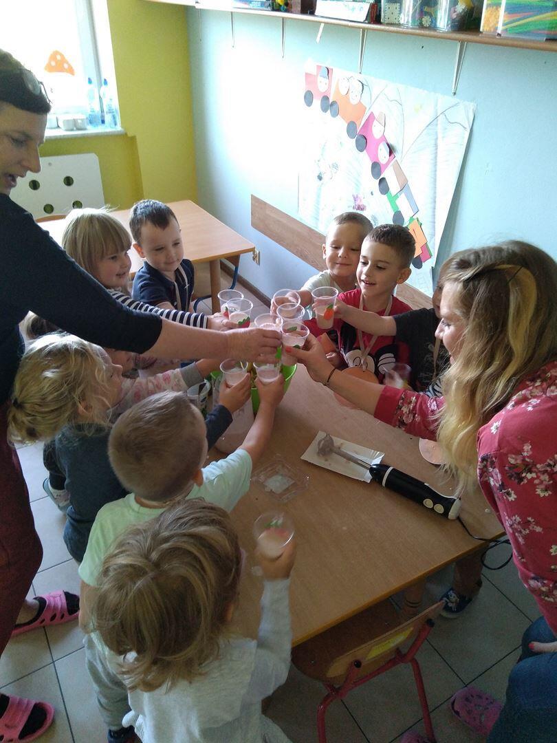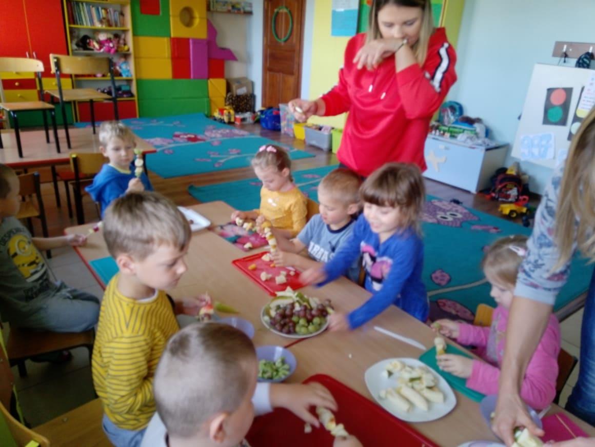 Święto przedszkolaka w naszym przedszkolu przebiegło bardzo smakowicie. Każda z grup zorganizowała warsztaty kulinarne, podczas których przygotowywała pyszne smakołyki nie tylko dla siebie, ale również dla kolegów i koleżanek z innych grup. Motylki wykonały dla nas smakowite ciasteczka ozdobione czekoladą, żółwiki postanowiły zrobić koktajl witaminowy, a tuptusie uraczyły nas owocowymi szaszłykami. Oczywiście odśpiewaliśmy symboliczne sto lat. Zapraszamy do galerii zdjęć.