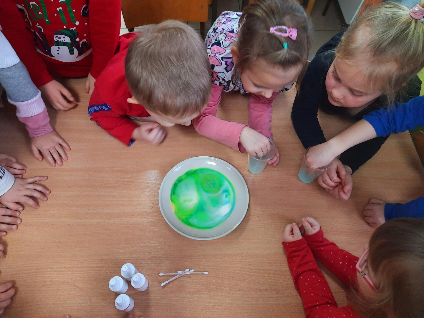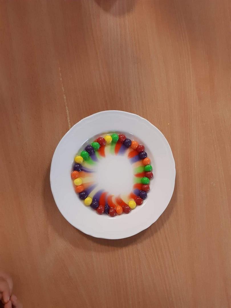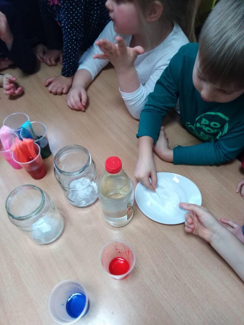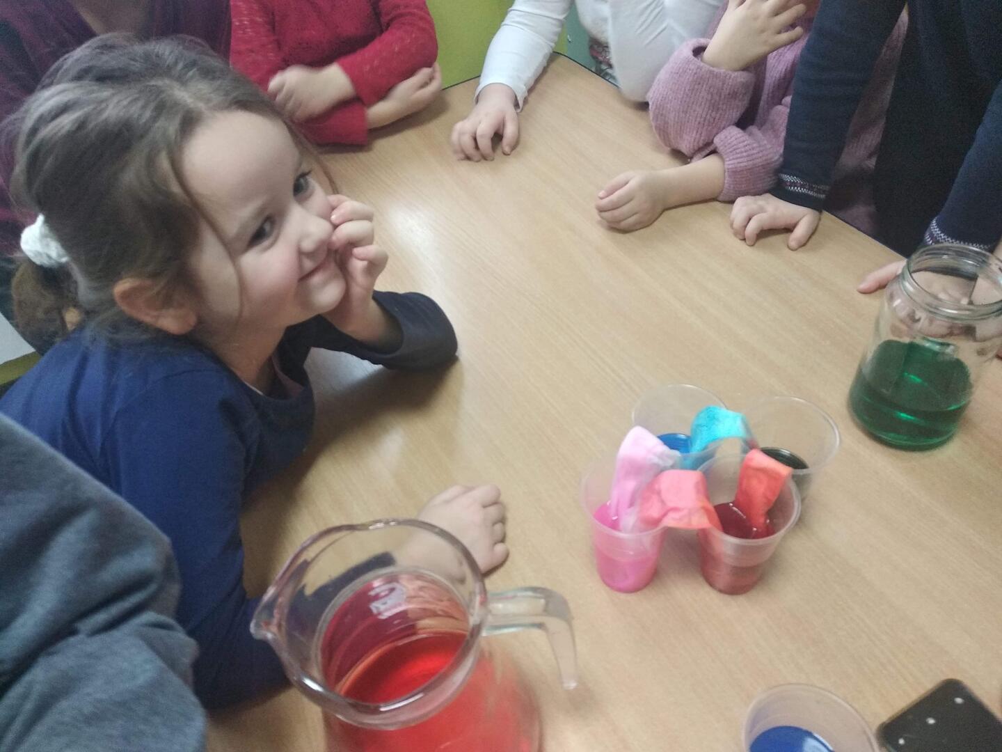 W piątek pożegnaliśmy tydzień poświęcony eksperymentom. Tego dnia dzieci bawiły się kolorami. Wspólnie z Paniami rysowały w mleku, tworzyły tęczę z kolorowych cukierków, barwiły papier, mieszały kolory tworząc nowe a nawet udało im się zrobić wulkan. W tym tygodniu nie tylko dobrze się bawiliśmy, mieliśmy też okazję zaobserwować wiele ciekawych zjawisk. Ciekawe co czeka nas od poniedziałku? :)