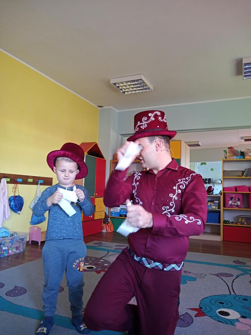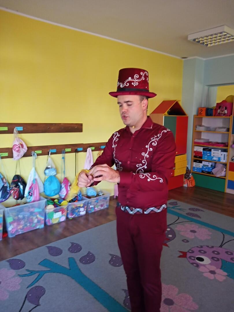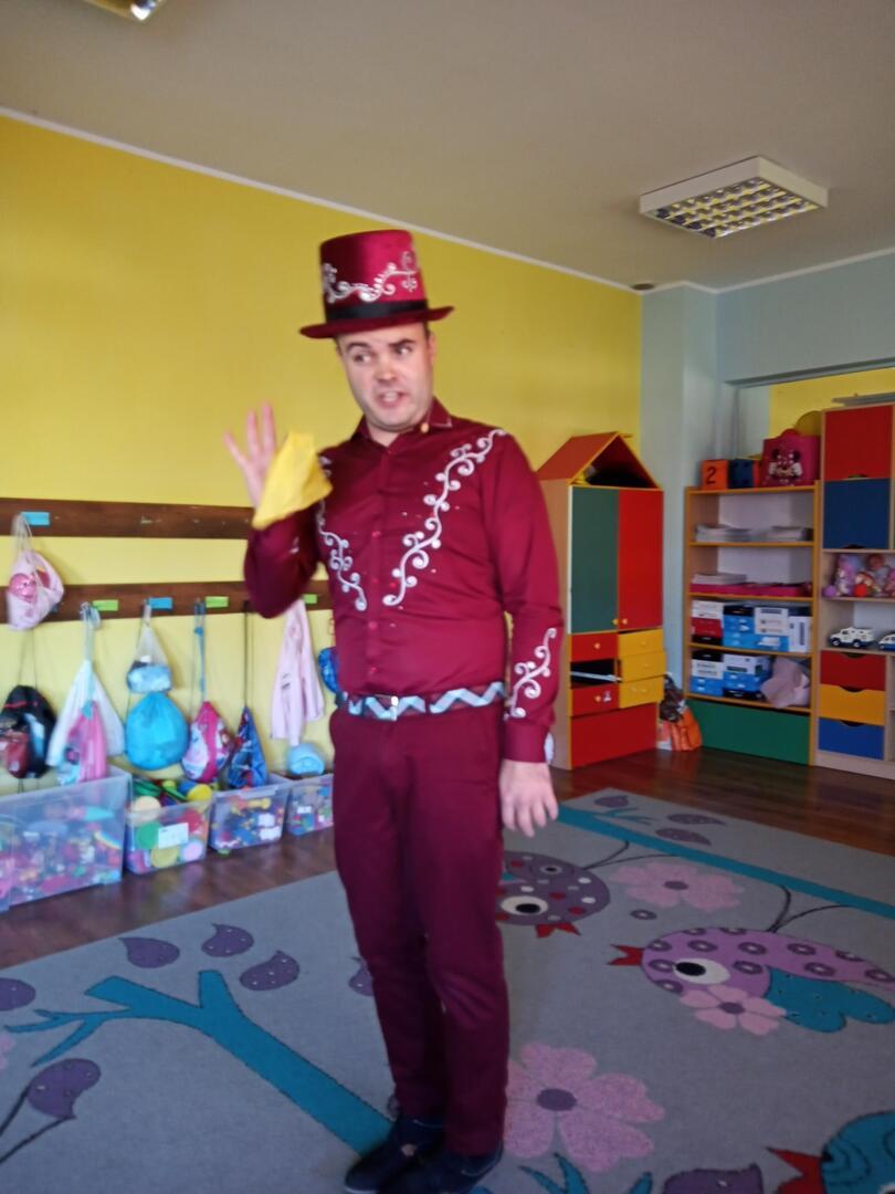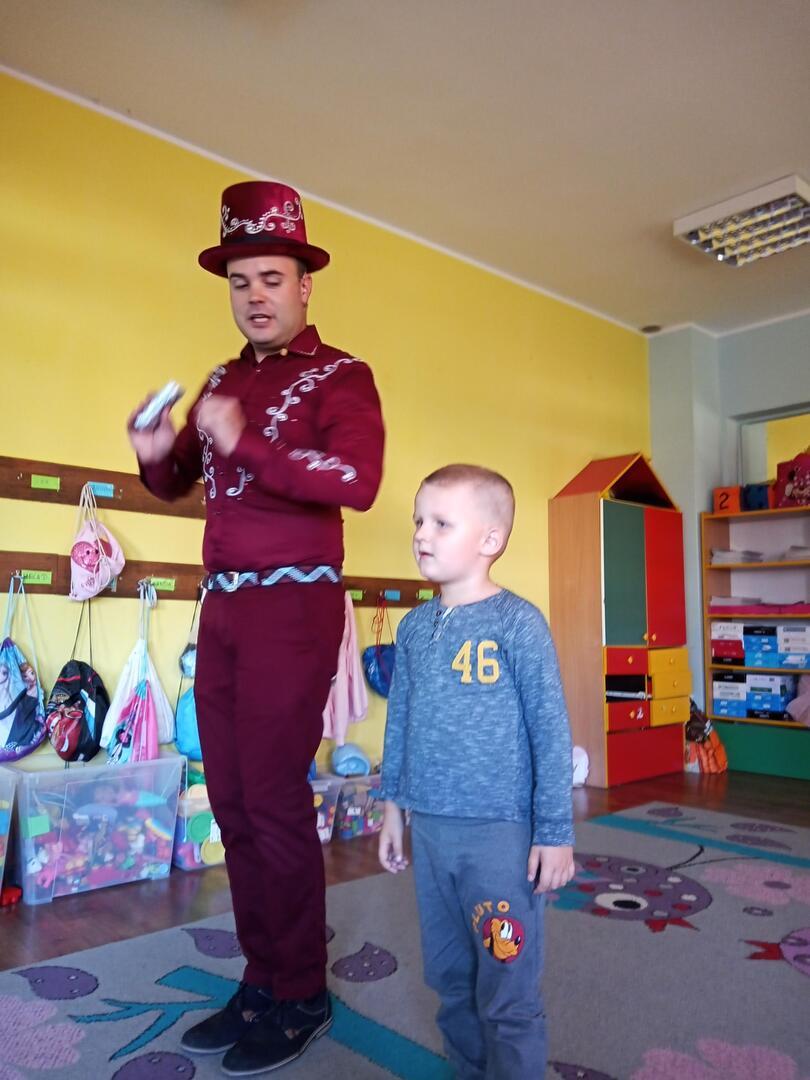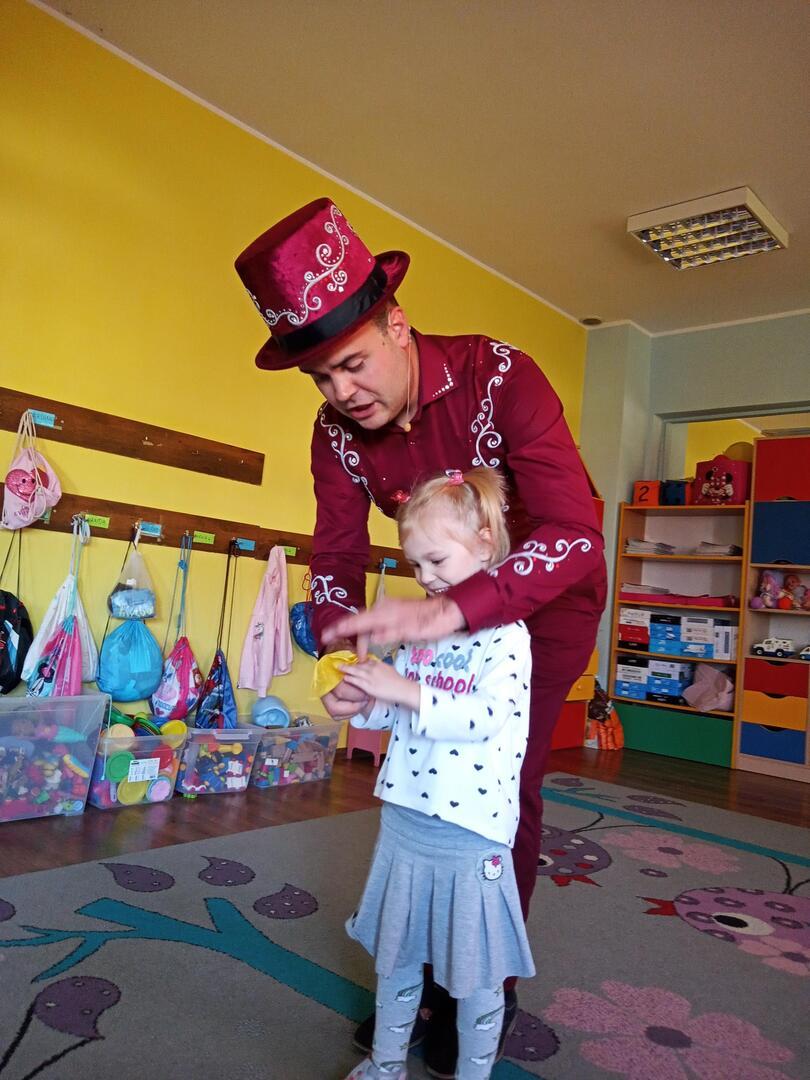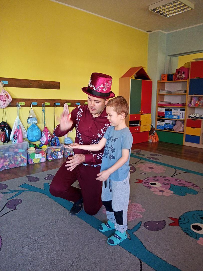 Dzisiaj gościliśmy w naszym przedszkolu iluzjonistę, który swoimi czarami przeniósł dzieci w świat magii, dobrej zabawy i wspaniałego humoru. Przedszkolaki z dużym zaangażowaniem obserwowały każdy ruch iluzjonisty, aby przynajmniej nauczyć się jednej sztuczki. Każdy pokaz nagradzany był gromkimi brawami. Podczas tego niezwykłego widowiska ujawniły się też iluzjonistyczne predyspozycje przedszkolaków, które wcielając się w rolę asystenta z ogromnym zaangażowaniem próbowały zgłębić tajniki magii. Spotkanie z magikiem bardzo się wszystkim podobało. Dostarczyło dzieciom wielu niezapomnianych wrażeń, o czym świadczyły uśmiechy na twarzach oraz gromkie brawa.