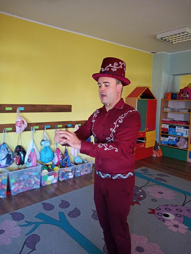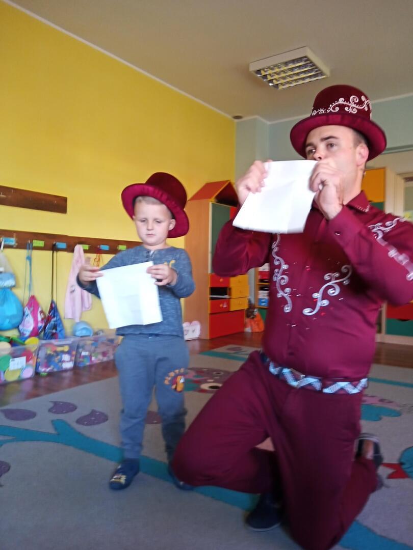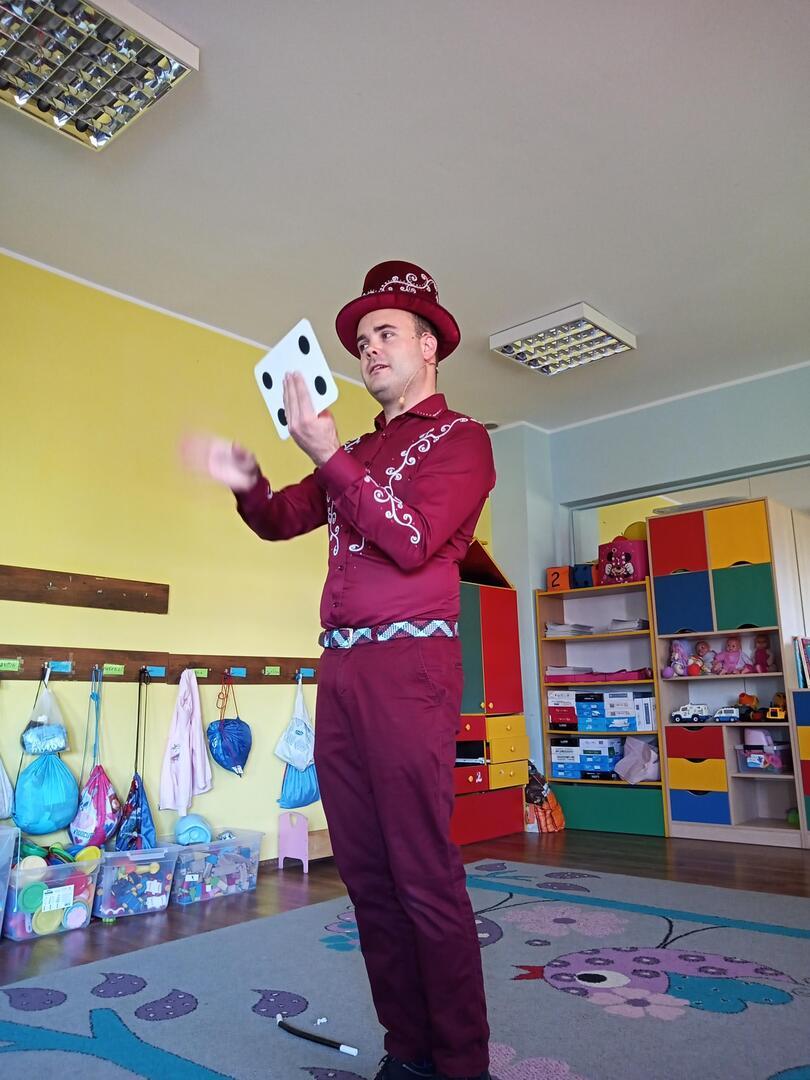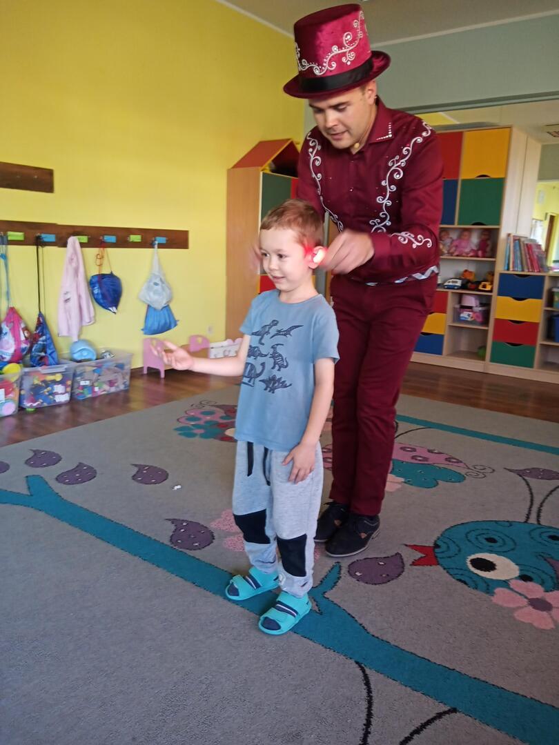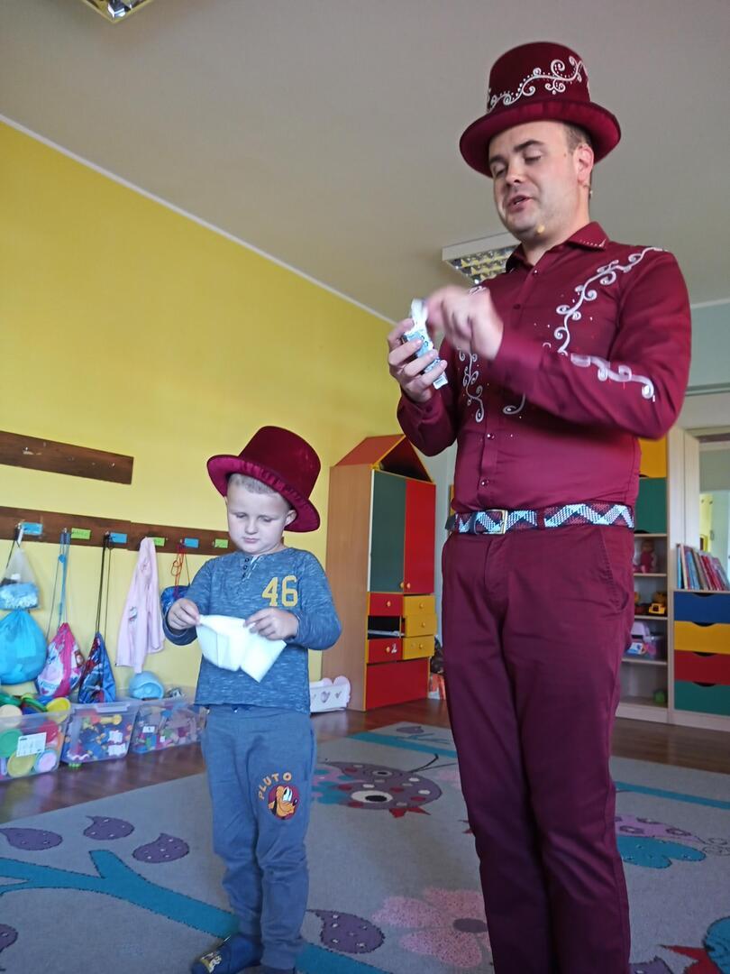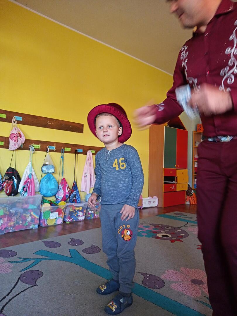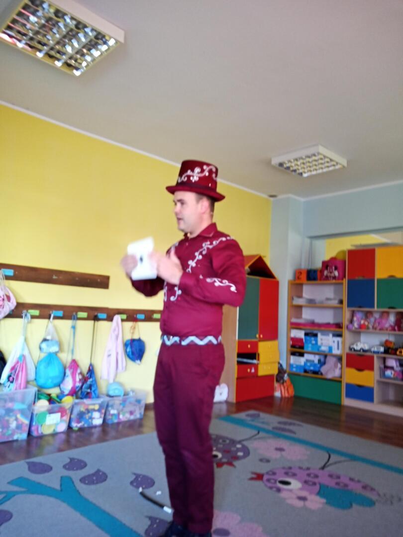 Dzisiaj gościliśmy w naszym przedszkolu iluzjonistę, który swoimi czarami przeniósł dzieci w świat magii, dobrej zabawy i wspaniałego humoru. Przedszkolaki z dużym zaangażowaniem obserwowały każdy ruch iluzjonisty, aby przynajmniej nauczyć się jednej sztuczki. Każdy pokaz nagradzany był gromkimi brawami. Podczas tego niezwykłego widowiska ujawniły się też iluzjonistyczne predyspozycje przedszkolaków, które wcielając się w rolę asystenta z ogromnym zaangażowaniem próbowały zgłębić tajniki magii. Spotkanie z magikiem bardzo się wszystkim podobało. Dostarczyło dzieciom wielu niezapomnianych wrażeń, o czym świadczyły uśmiechy na twarzach oraz gromkie brawa.
