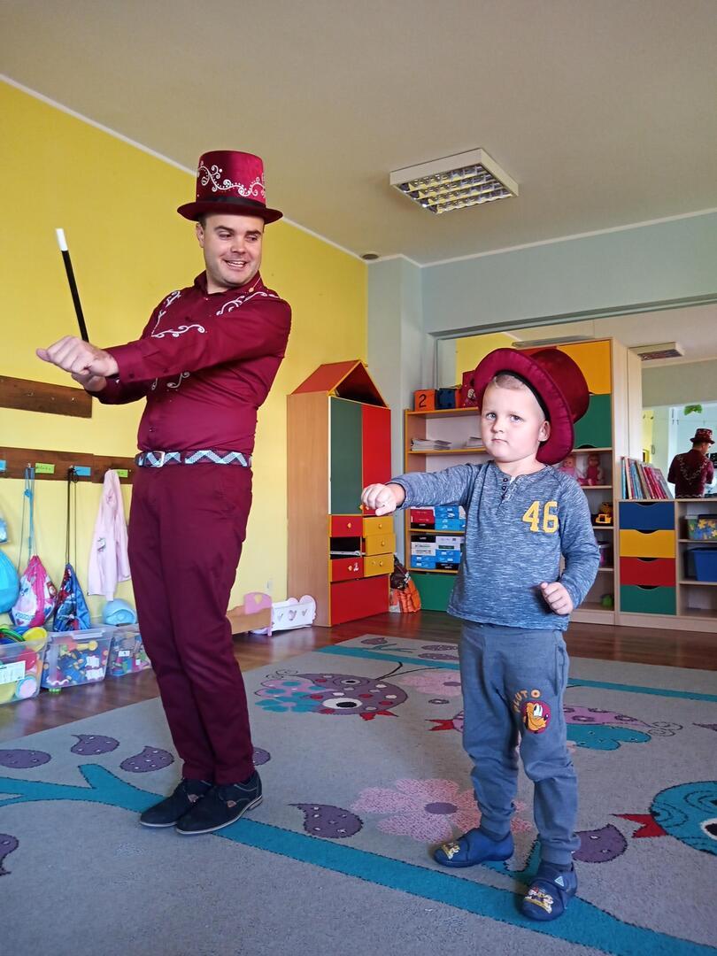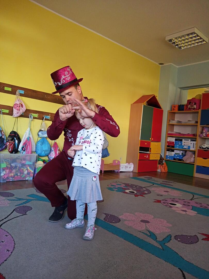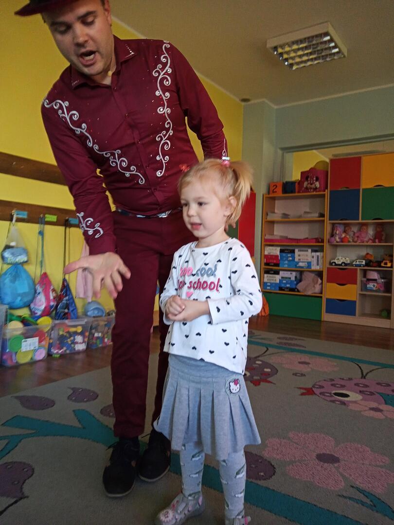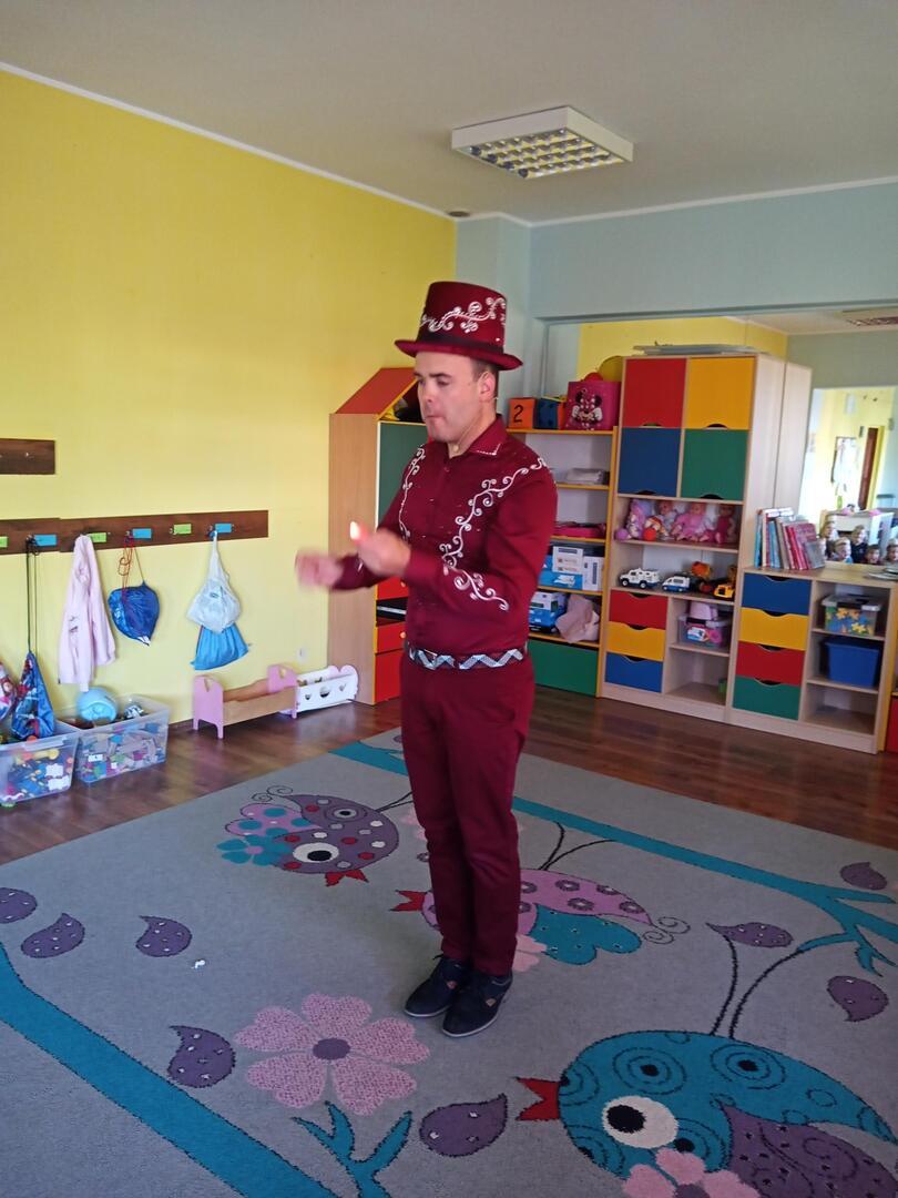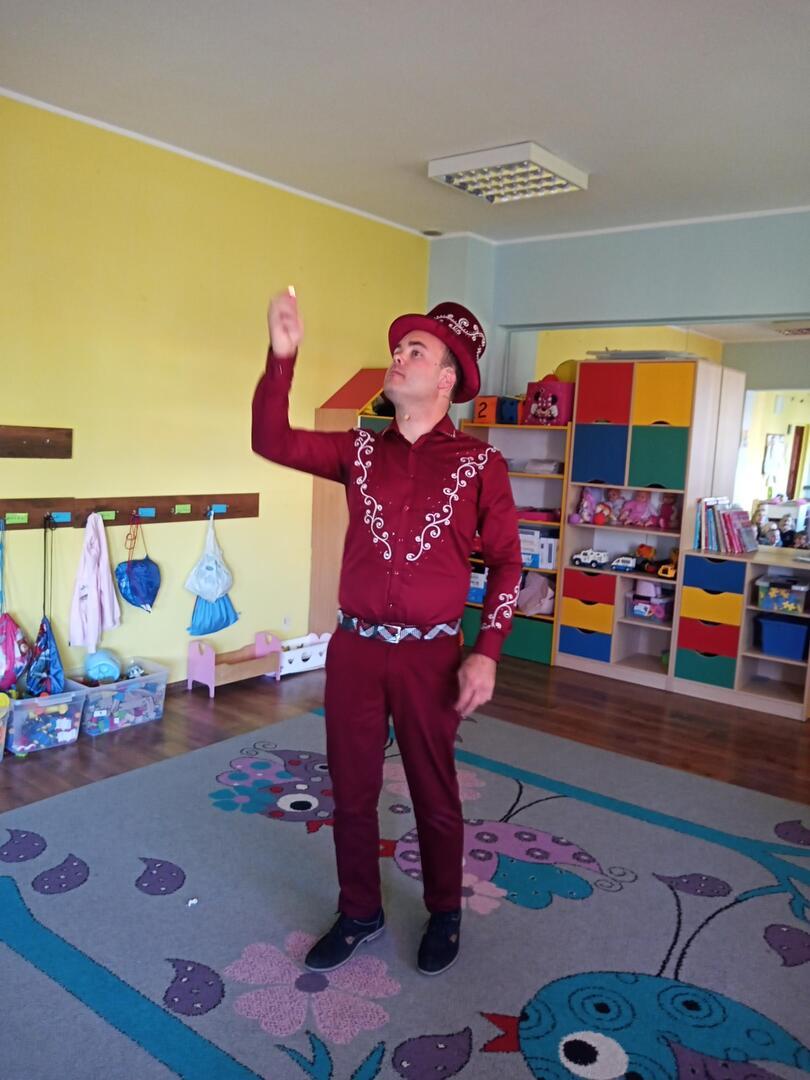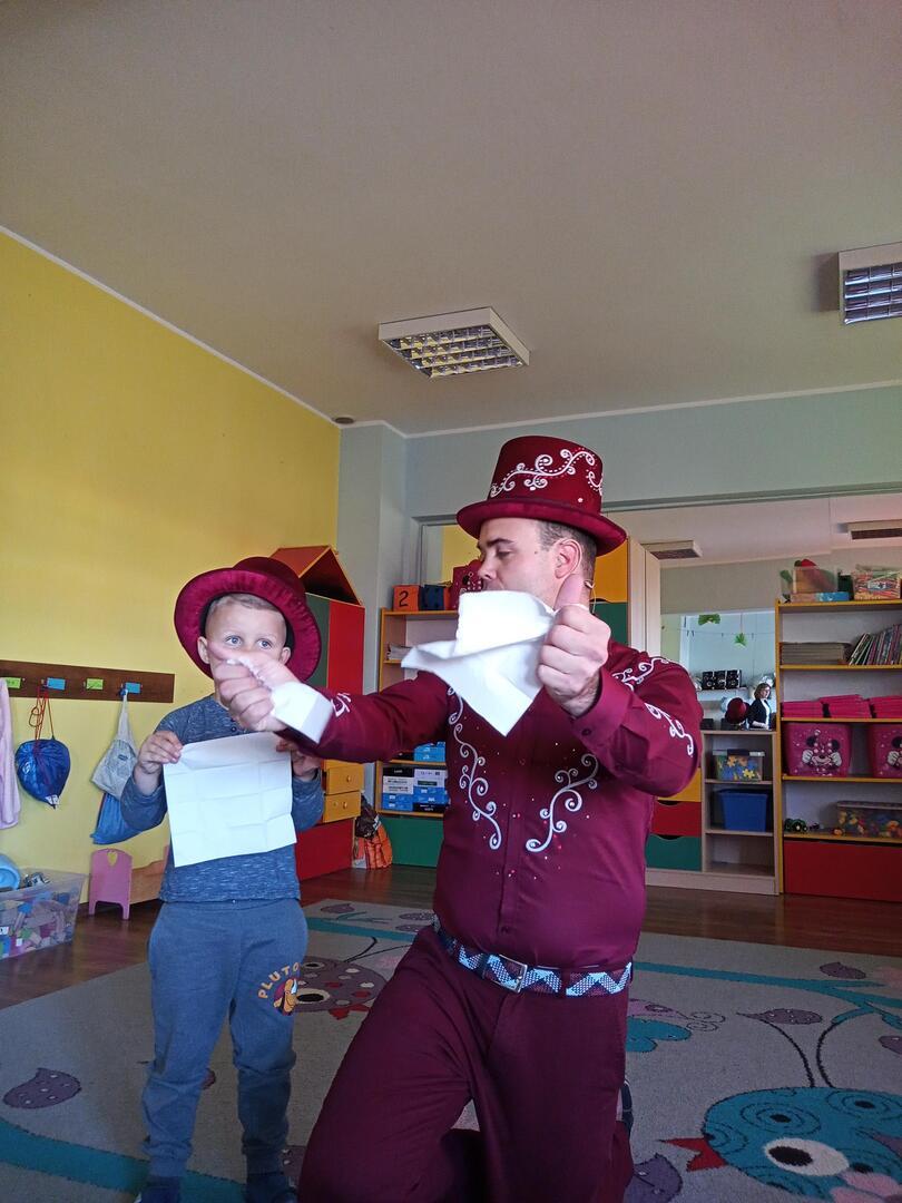 Dzisiaj gościliśmy w naszym przedszkolu iluzjonistę, który swoimi czarami przeniósł dzieci w świat magii, dobrej zabawy i wspaniałego humoru. Przedszkolaki z dużym zaangażowaniem obserwowały każdy ruch iluzjonisty, aby przynajmniej nauczyć się jednej sztuczki. Każdy pokaz nagradzany był gromkimi brawami. Podczas tego niezwykłego widowiska ujawniły się też iluzjonistyczne predyspozycje przedszkolaków, które wcielając się w rolę asystenta z ogromnym zaangażowaniem próbowały zgłębić tajniki magii. Spotkanie z magikiem bardzo się wszystkim podobało. Dostarczyło dzieciom wielu niezapomnianych wrażeń, o czym świadczyły uśmiechy na twarzach oraz gromkie brawa.