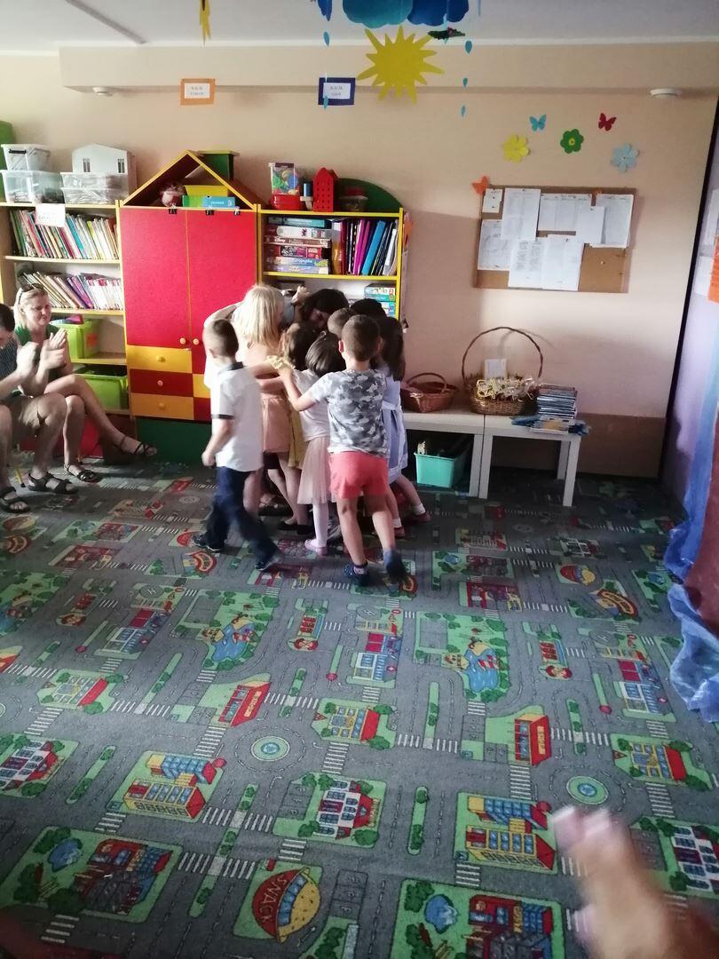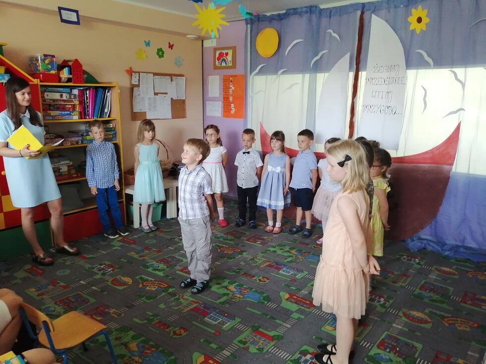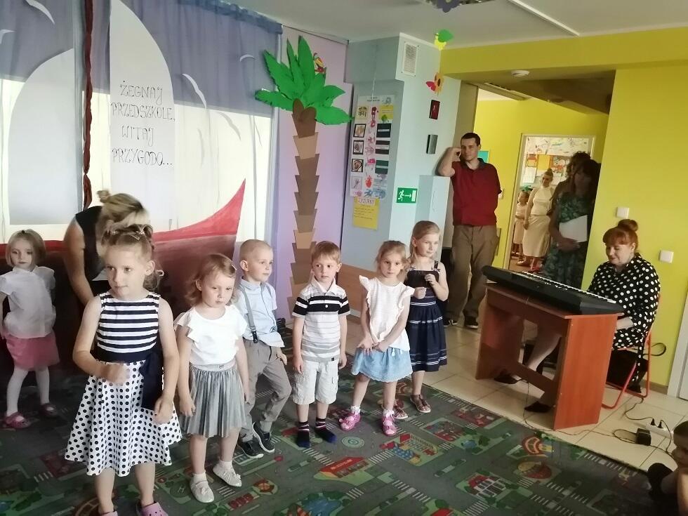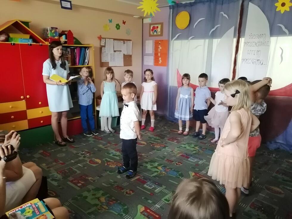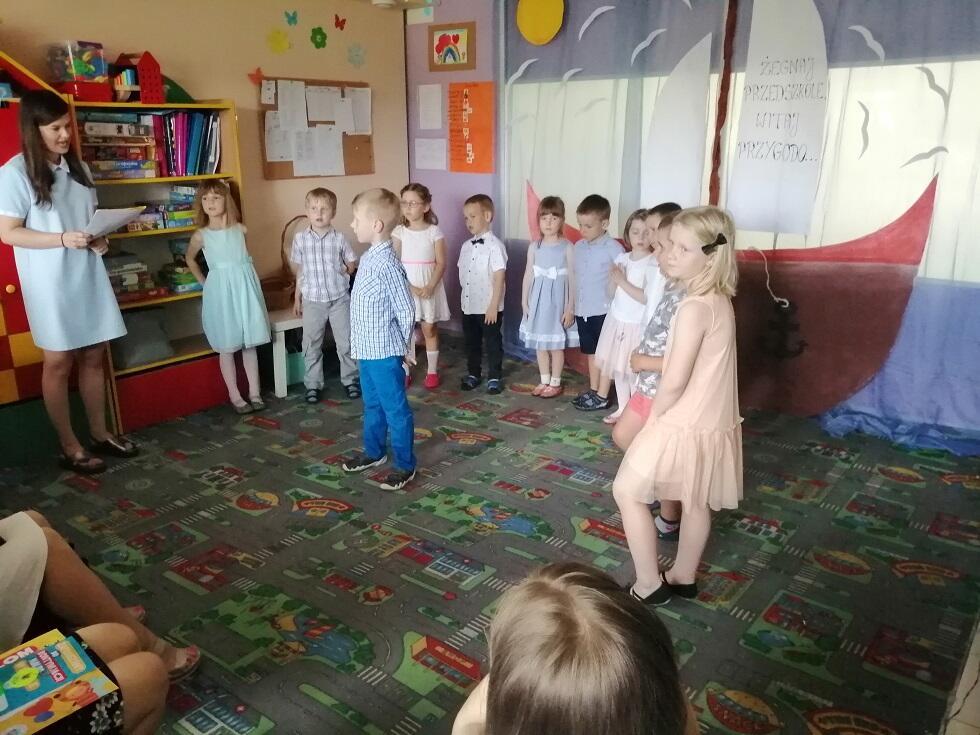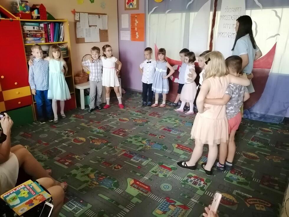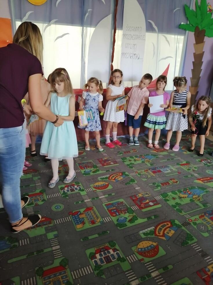 18 czerwca 2019 r. odbyła się w naszym przedszkolu uroczystość zakończenia roku przedszkolnego oraz pożegnania starszaków. W tym uroczystym dniu dzieciom towarzyszyli rodzice.  Na początku wystąpiły dzieci z grupy młodszej. Zaśpiewały piosenkę, zaprezentowały wierszyki żegnając przy tym starszych kolegów oraz wręczyły starszakom drobne upominki w postaci breloczków. Na zakończenie najważniejszy punkt uroczystości- występ 6 latków. Starszaki dostojnie prezentowały swoje umiejętności artystyczne, recytatorskie i taneczne.Na koniec dyrekcja wystosowała podziękowania w postaci dyplomów dla rodziców, którzy byli zaangażowani w działania na rzecz placówki. Po występach wszystkie dzieci otrzymały dyplomy, dedykowane książki oraz słodką niespodziankę. Uroczystość zakonczyła się słodkim poczęstunkiem z udziałem rodziców starszaków.