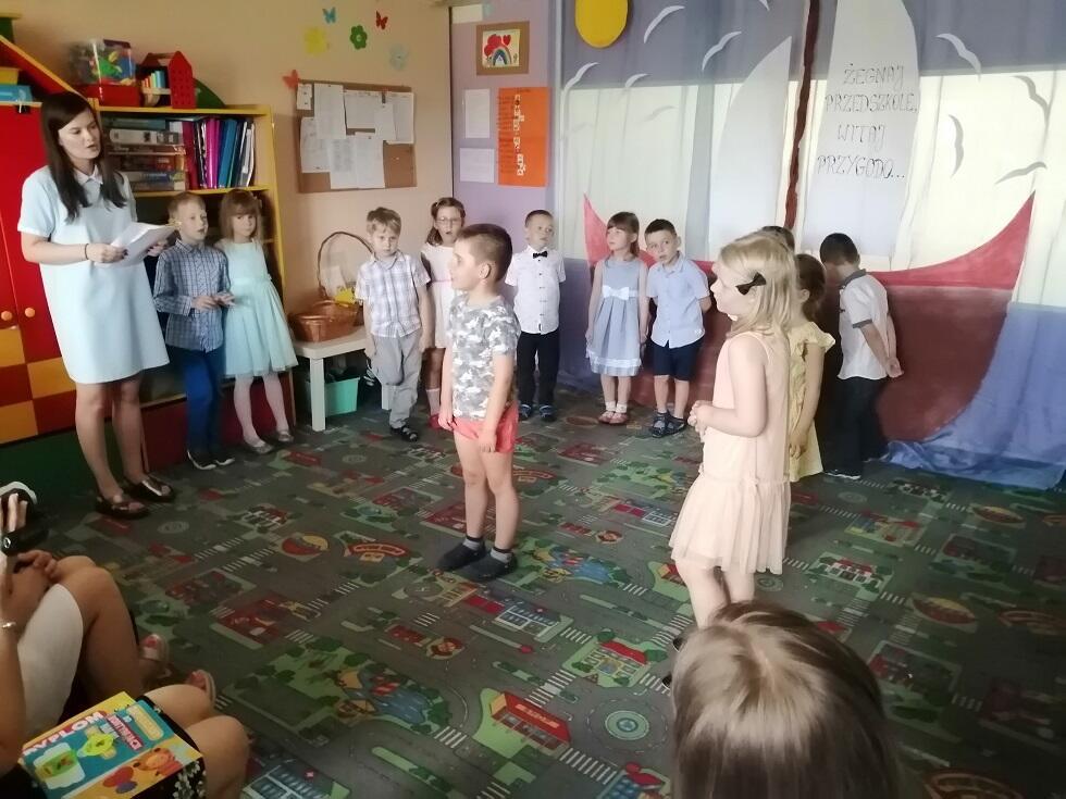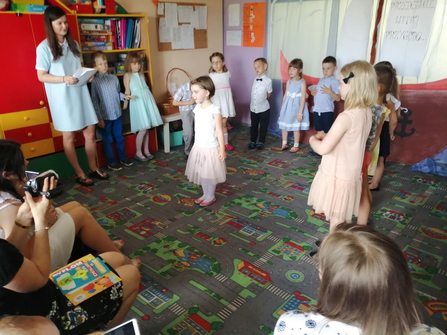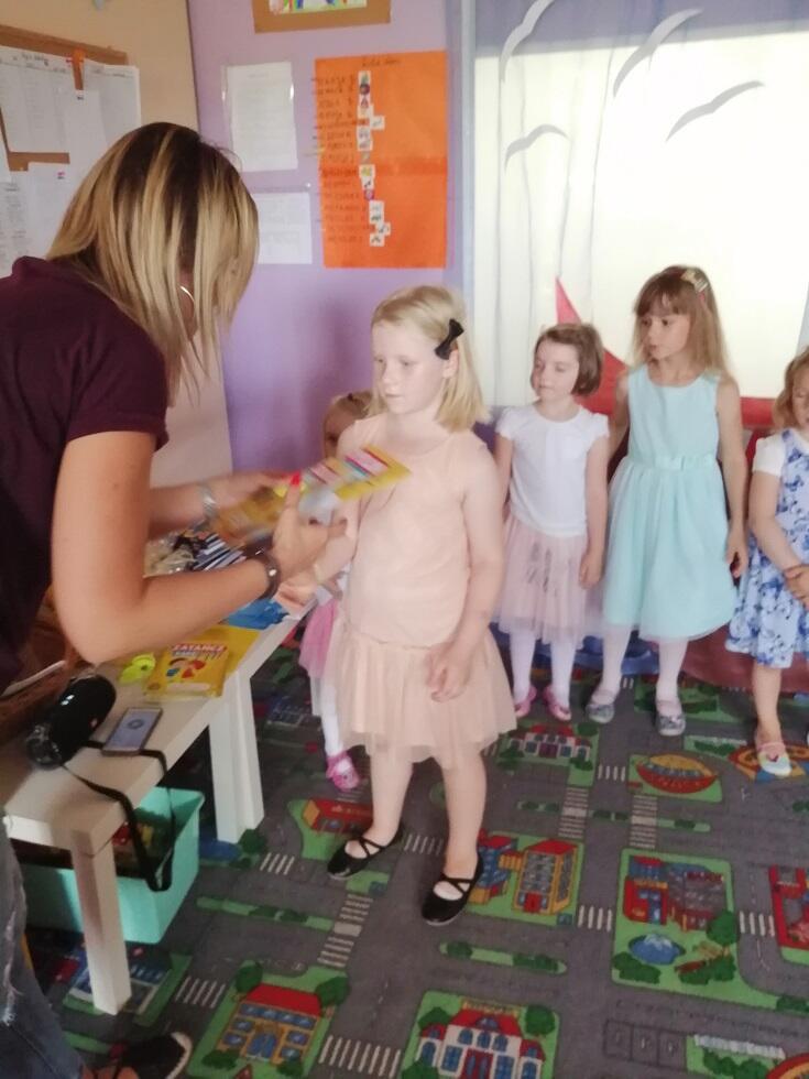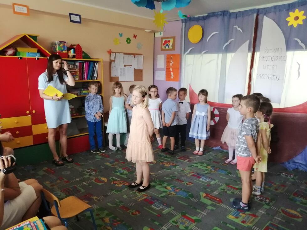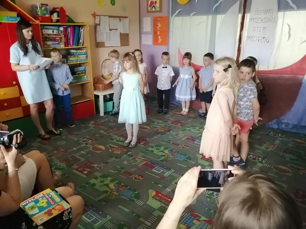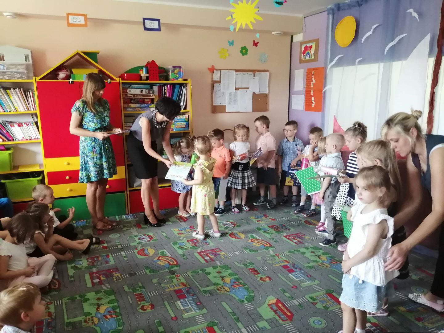 18 czerwca 2019 r. odbyła się w naszym przedszkolu uroczystość zakończenia roku przedszkolnego oraz pożegnania starszaków. W tym uroczystym dniu dzieciom towarzyszyli rodzice.  Na początku wystąpiły dzieci z grupy młodszej. Zaśpiewały piosenkę, zaprezentowały wierszyki żegnając przy tym starszych kolegów oraz wręczyły starszakom drobne upominki w postaci breloczków. Na zakończenie najważniejszy punkt uroczystości- występ 6 latków. Starszaki dostojnie prezentowały swoje umiejętności artystyczne, recytatorskie i taneczne.Na koniec dyrekcja wystosowała podziękowania w postaci dyplomów dla rodziców, którzy byli zaangażowani w działania na rzecz placówki. Po występach wszystkie dzieci otrzymały dyplomy, dedykowane książki oraz słodką niespodziankę. Uroczystość zakonczyła się słodkim poczęstunkiem z udziałem rodziców starszaków.