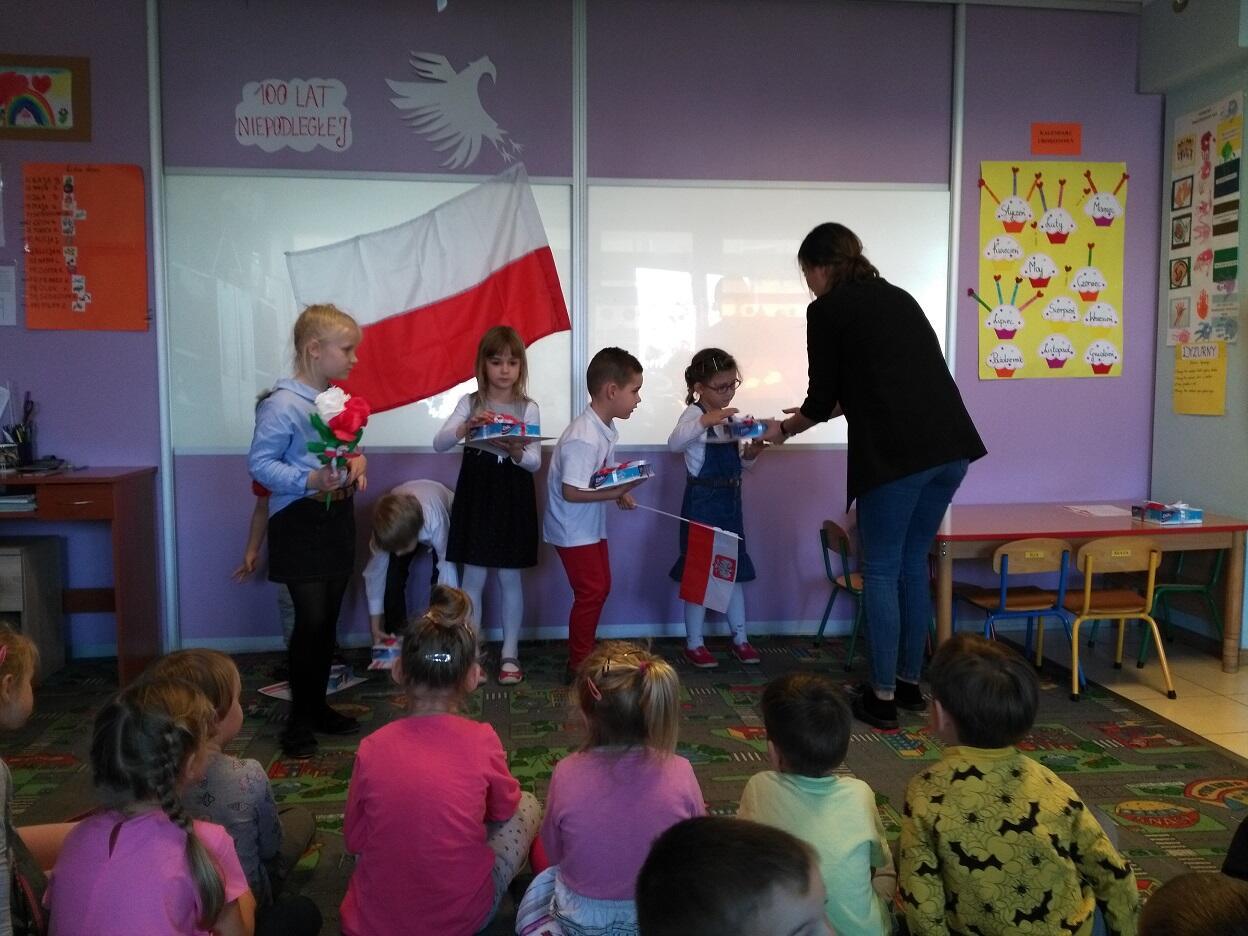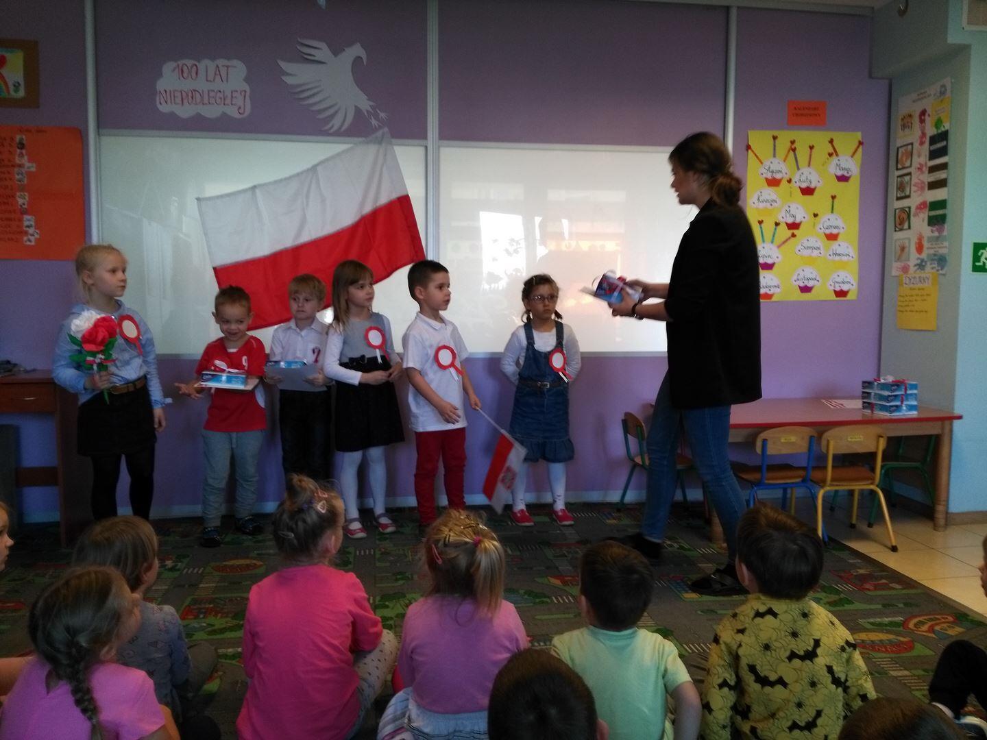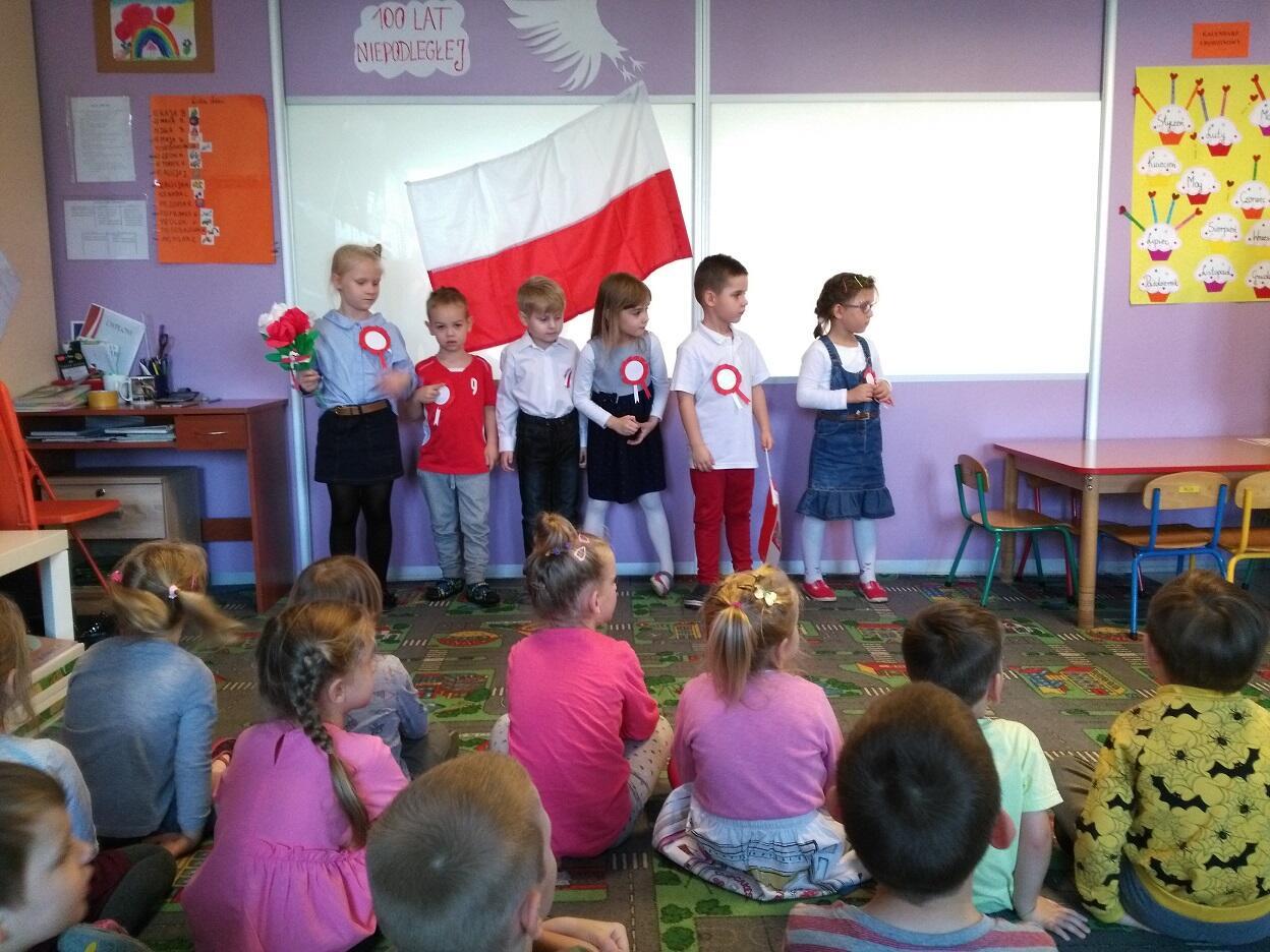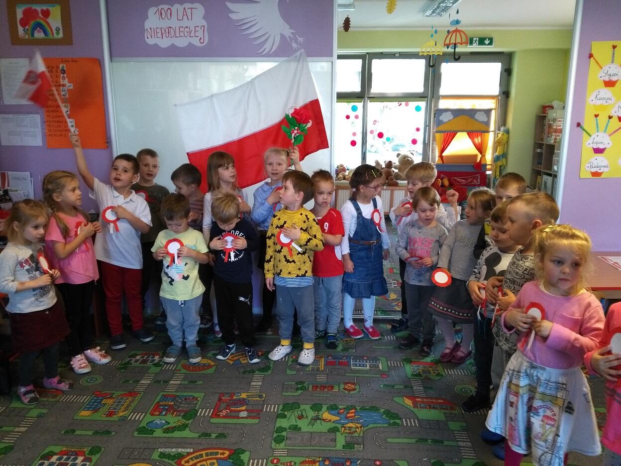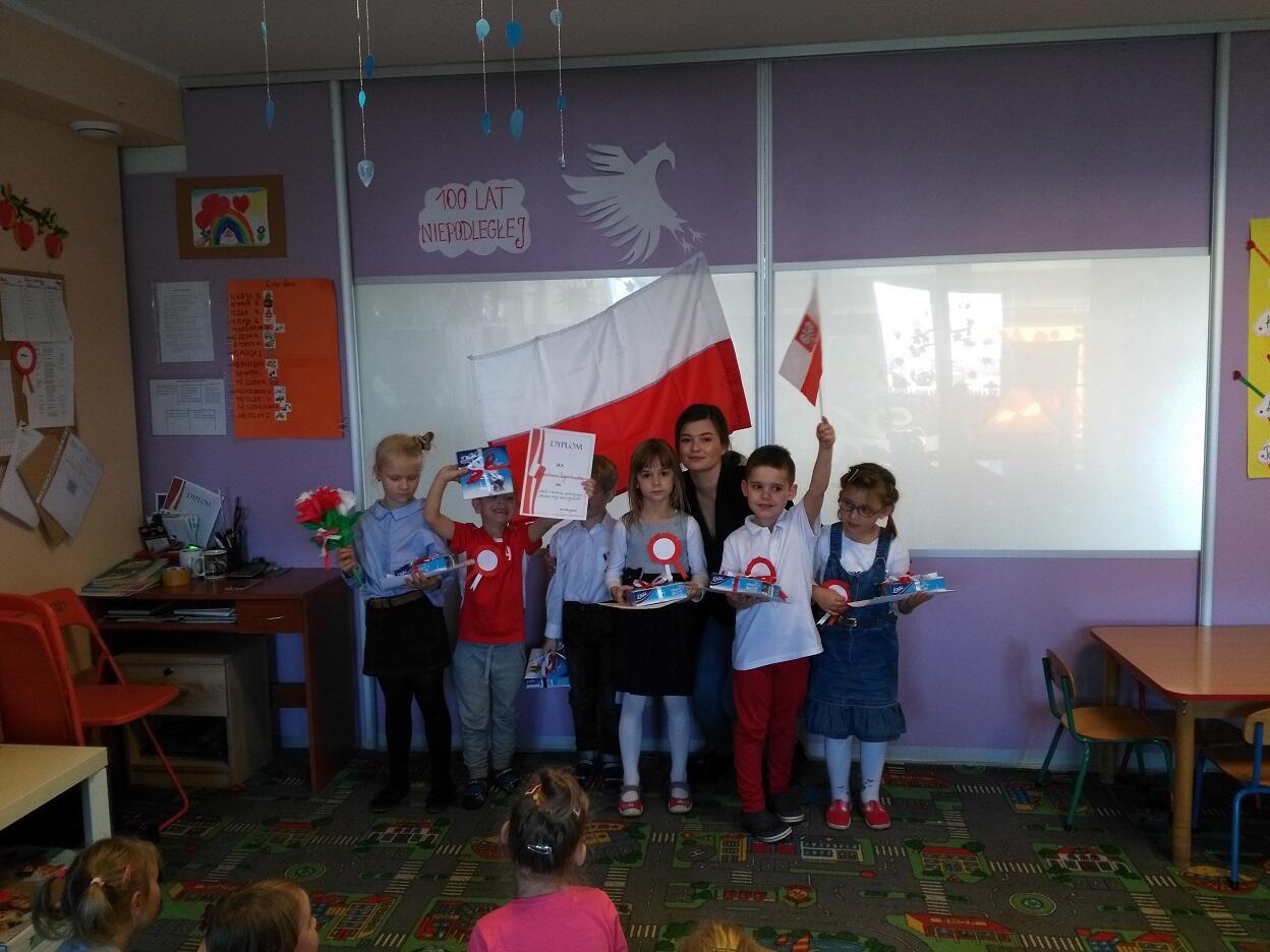 Dnia 08.11.2018 roku w naszym przedszkolu z okazji obchodów 100 rocznicy odzyskania przez Polskę niepodległości, odbył się konkurs patriotyczny pod hasłem "POLSKA MOJA MAŁA OJCZYZNA". Po wspólnym uroczystym odśpiewaniu Mazurka Dąbrowskiego, dzieci biorące udział w konkursie z dumą wyrecytowały przygotowane piosenki i wiersze o tematyce patriotycznej. Wszyscy uczestnicy otrzymali od wychowawcy grupy słodkie upominki oraz dyplomy.