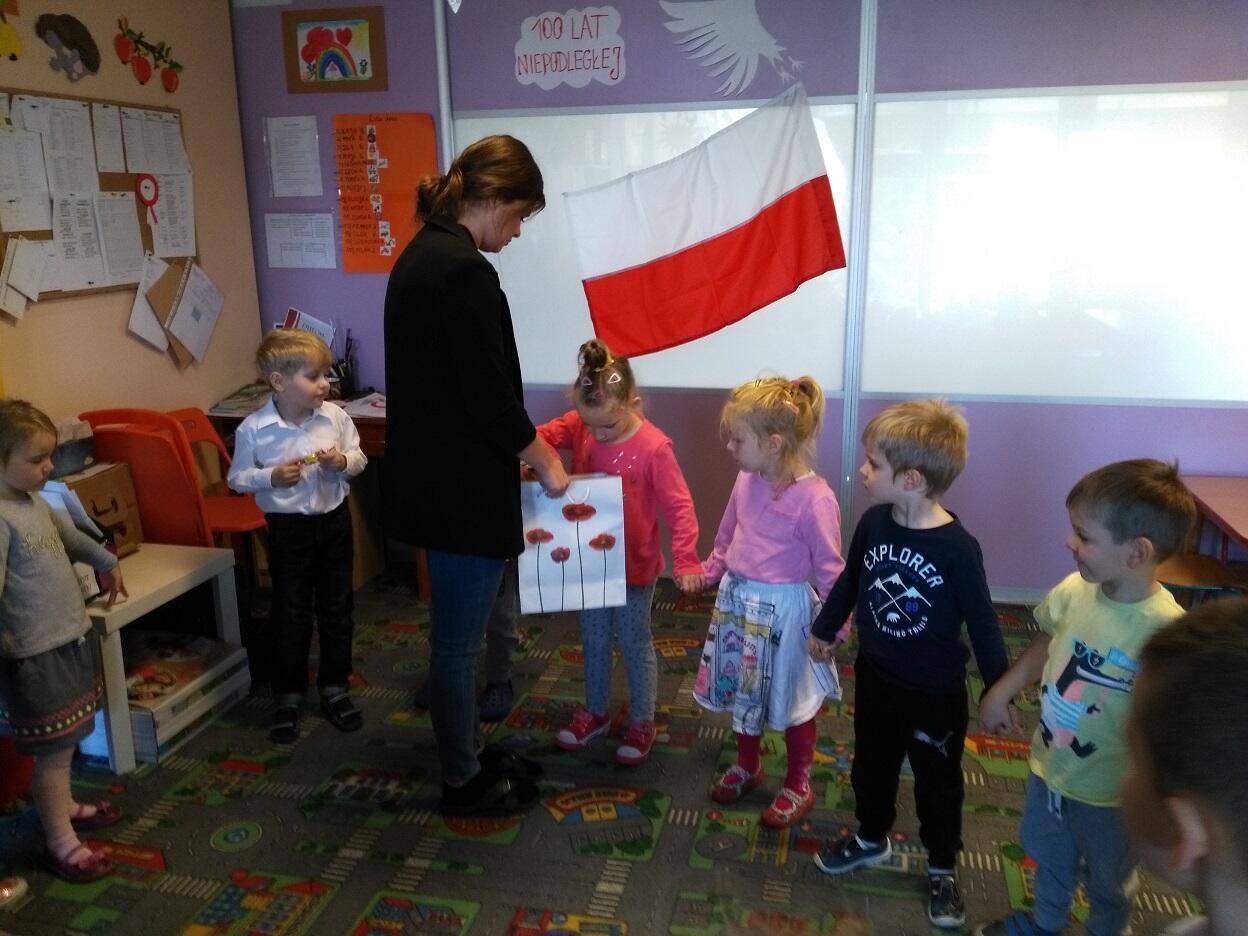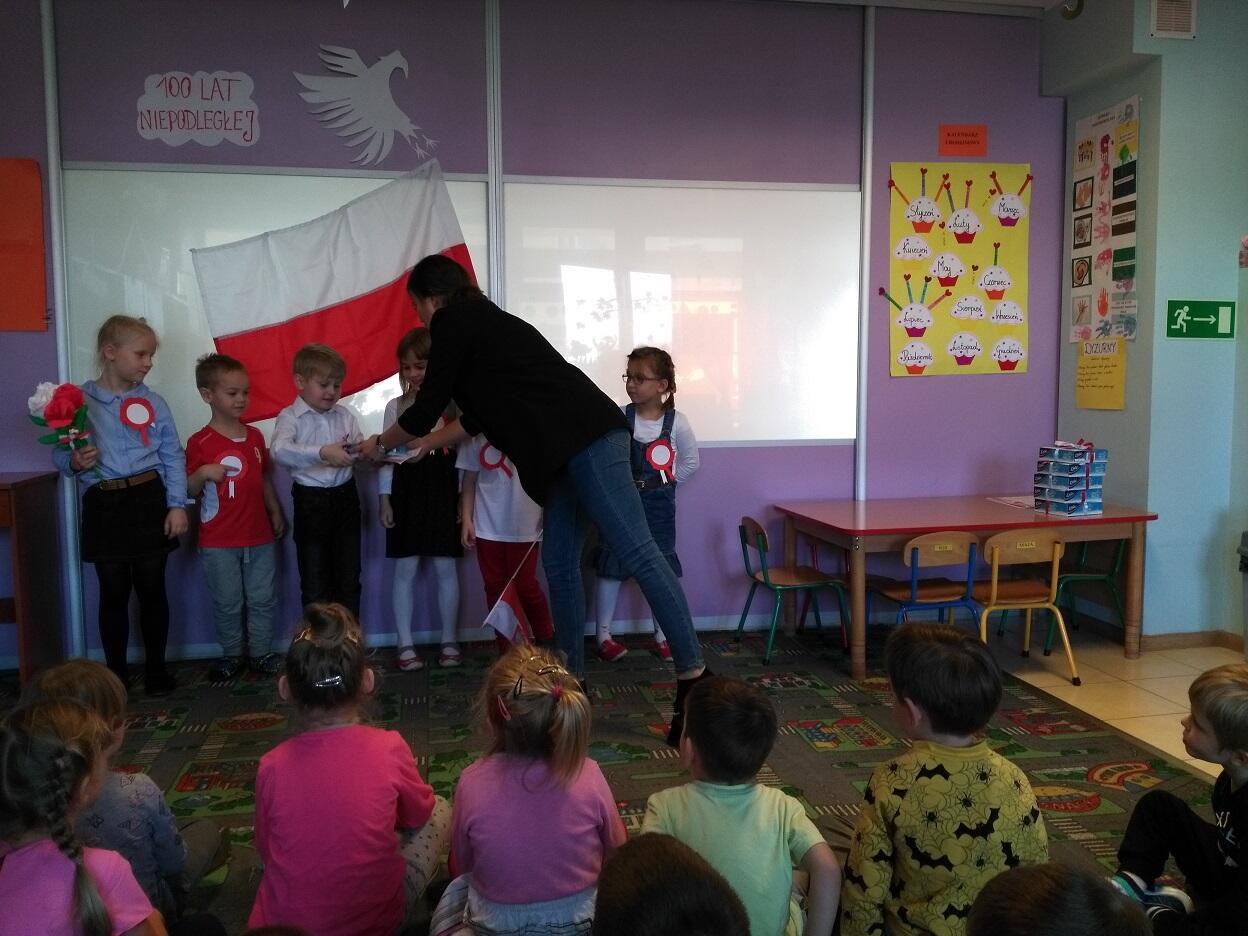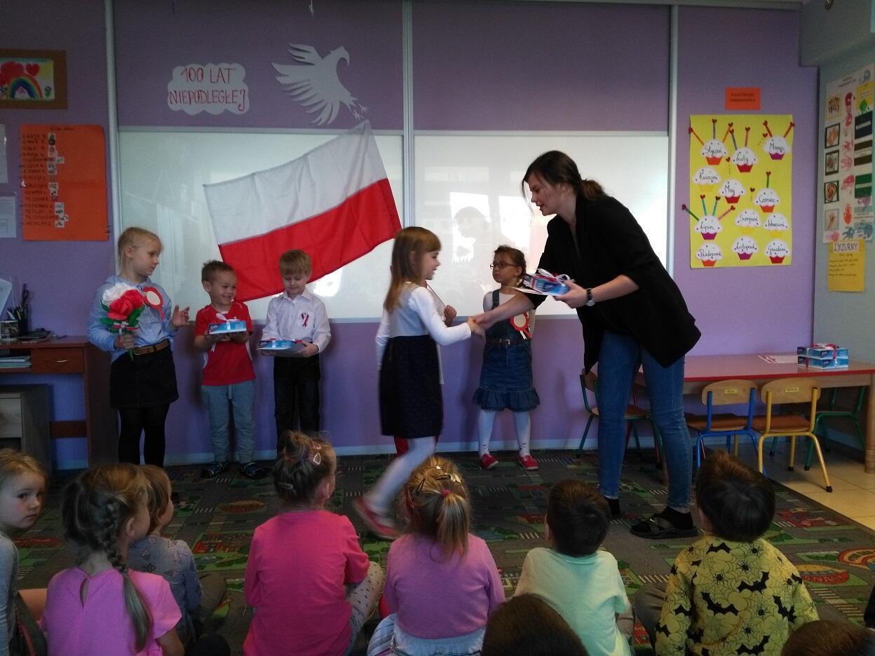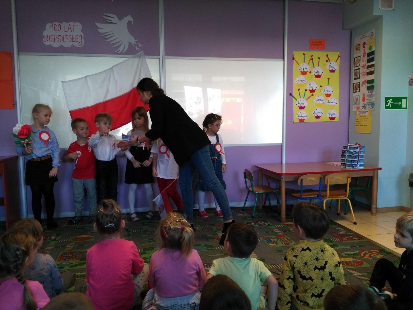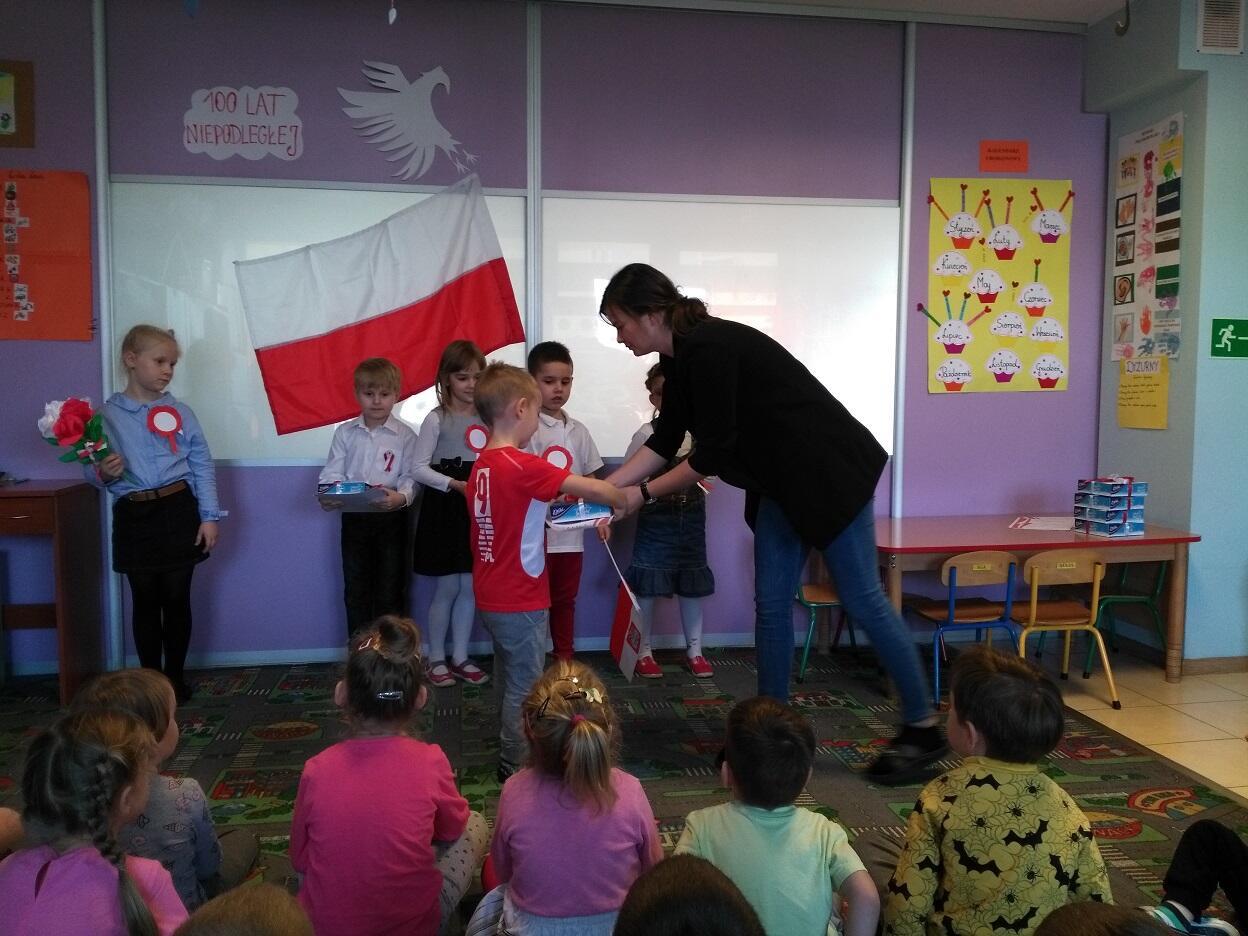 Dnia 08.11.2018 roku w naszym przedszkolu z okazji obchodów 100 rocznicy odzyskania przez Polskę niepodległości, odbył się konkurs patriotyczny pod hasłem "POLSKA MOJA MAŁA OJCZYZNA". Po wspólnym uroczystym odśpiewaniu Mazurka Dąbrowskiego, dzieci biorące udział w konkursie z dumą wyrecytowały przygotowane piosenki i wiersze o tematyce patriotycznej. Wszyscy uczestnicy otrzymali od wychowawcy grupy słodkie upominki oraz dyplomy.