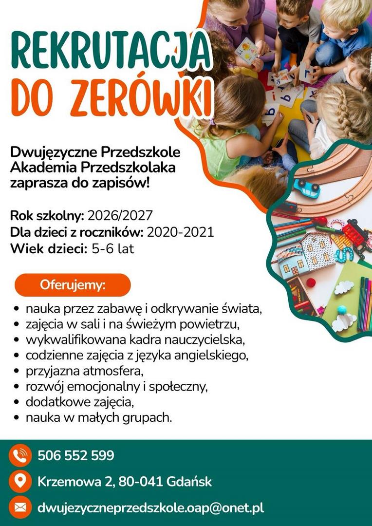 Z przyjemnością informujemy o tworzeniu nowej grupy zerówki w Przedszkolu Dwujęzycznym ul.Krzemow 2, oraz w przedszkolu przy ul. Sosnkowskiego 1. Serdecznie zapraszamy do rekrutacji! Więcej informacji pod numerem telefonu: 506 552 599.