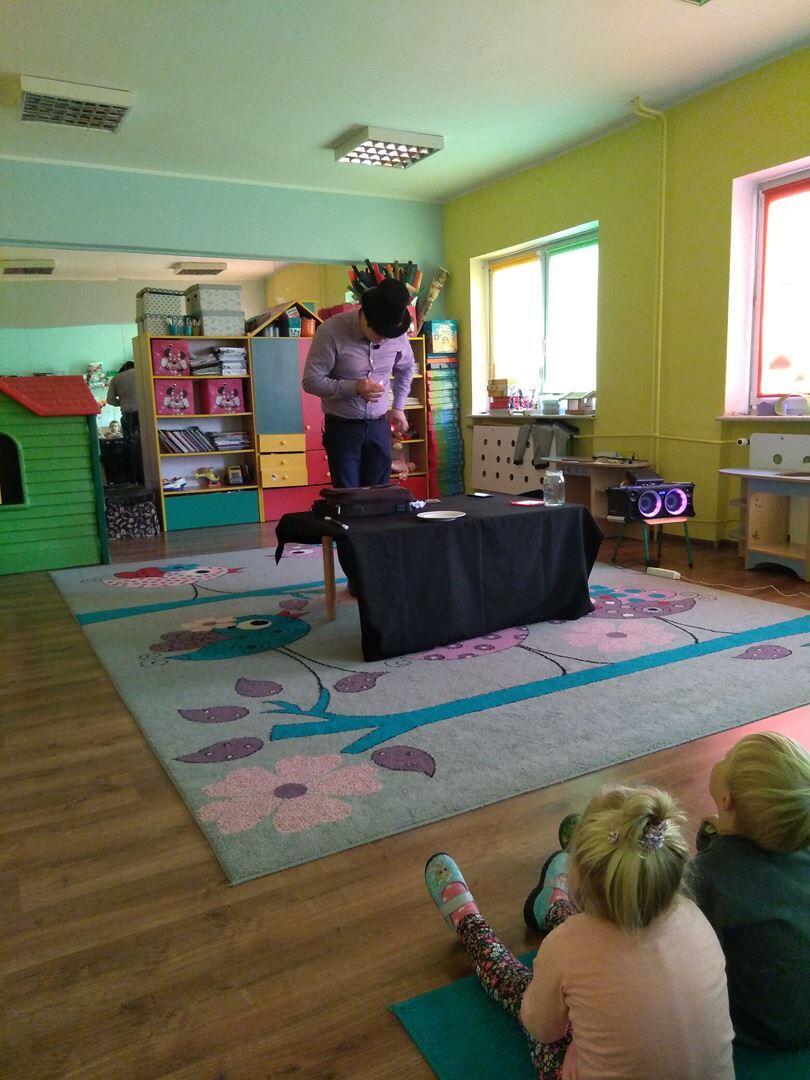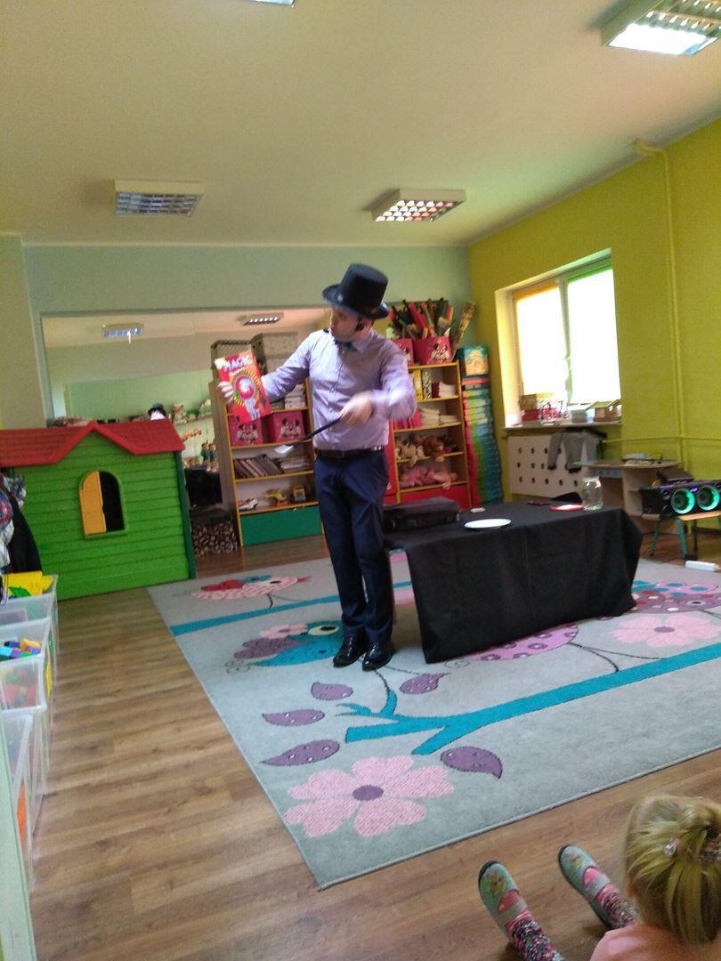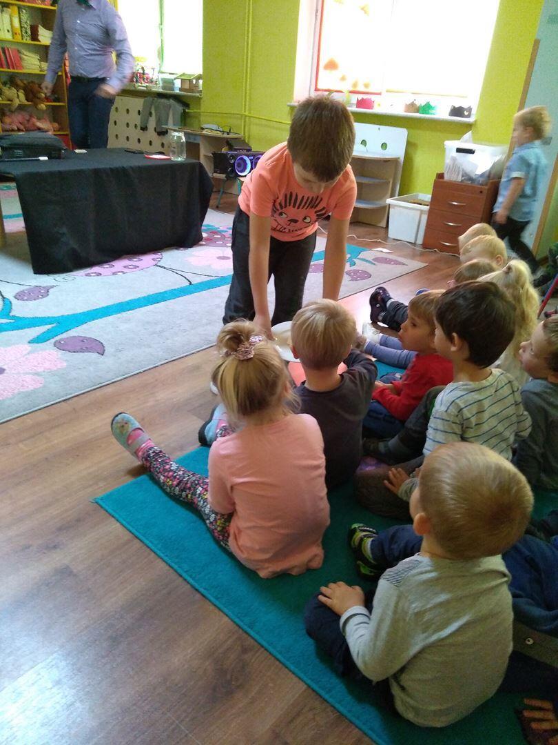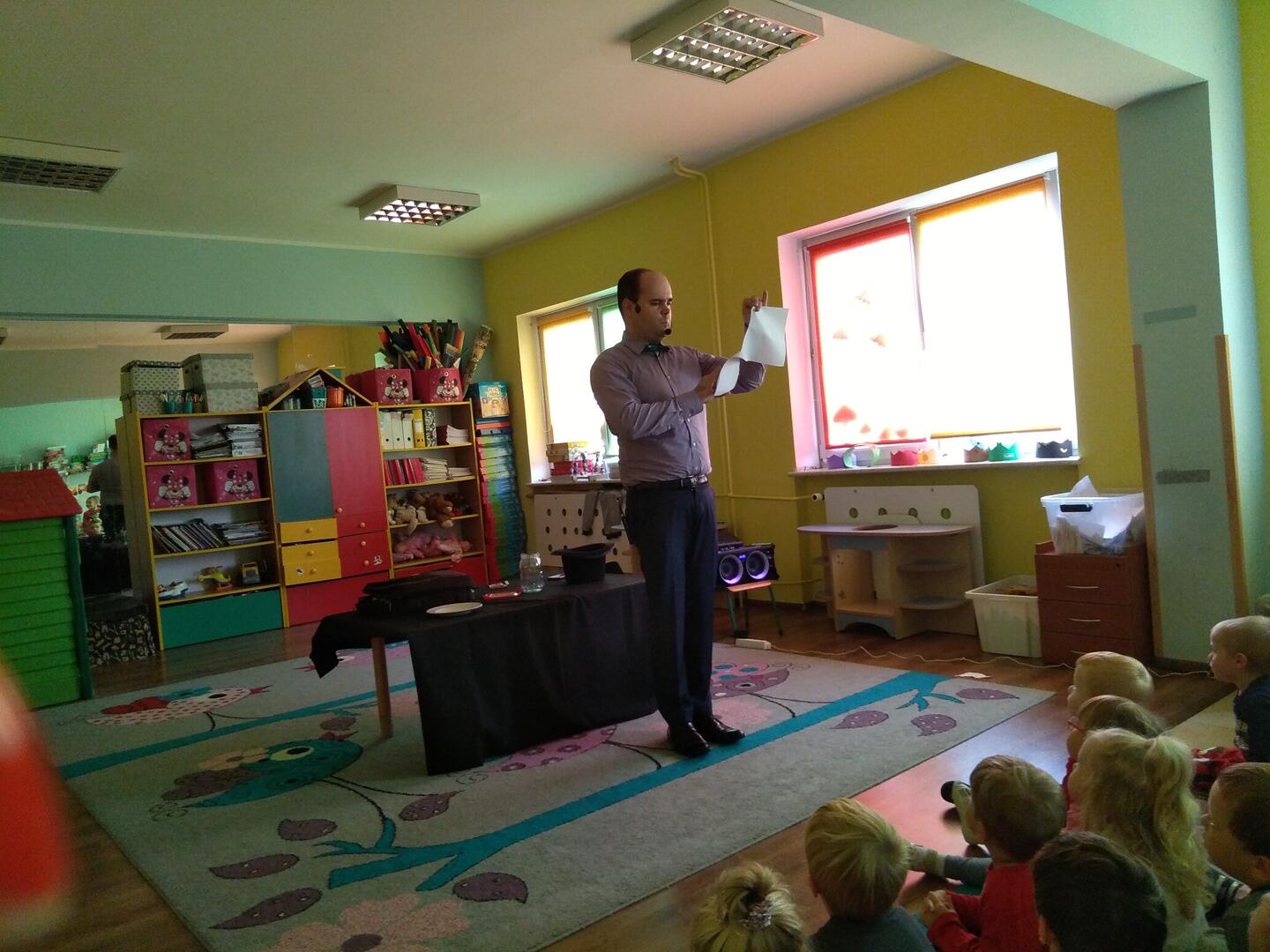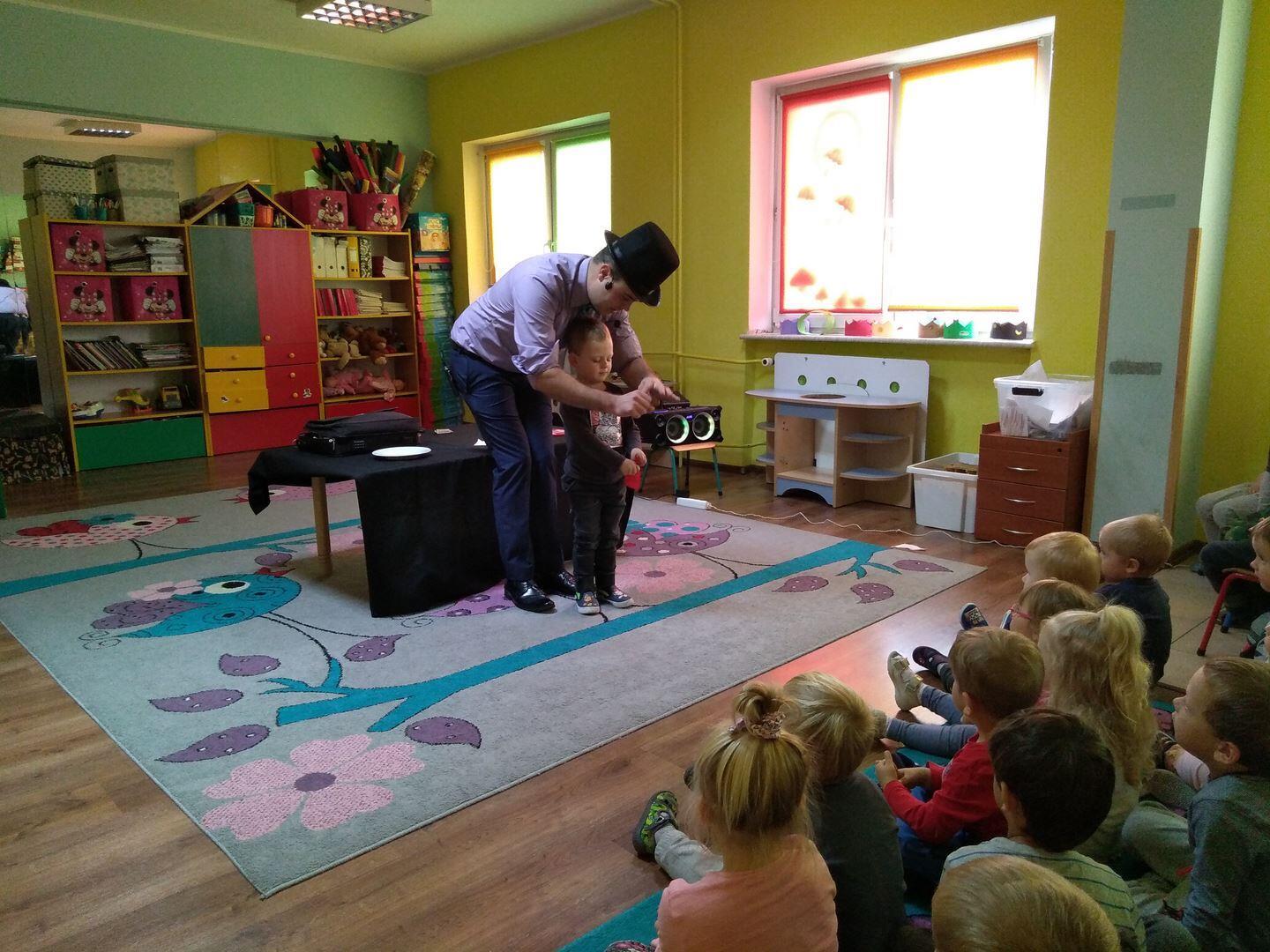 30 września mieliśmy okazję zapoznać się ze sztuką iluzji. Do naszego przedszkola został zaproszony prawdziwy magik. Oczarował nas wszystkich swoimi umiejętnościami. Zobaczyliśmy latającą kulkę papieru i pierścionek przesuwający się siłą umysłu. Magik pokazał nam jak pokroić nieobranego banana za pomocą różdżki oraz jak ukryć telefon w nadmuchanym balonie, który przy tym nie pęknie. Wszyscy byliśmy zachwyceni. A końcowa sztuczka z czerwonym światełkiem, które wydostawało się z każdej części naszego ciała, była po prostu niesamowita!