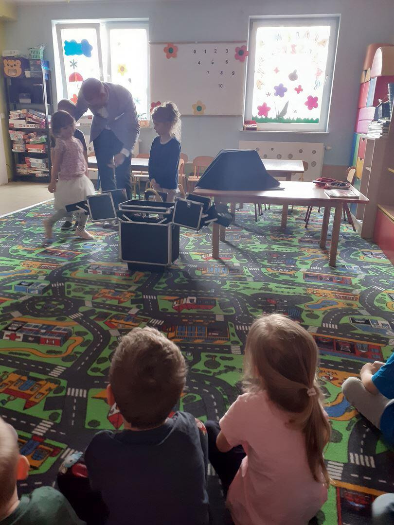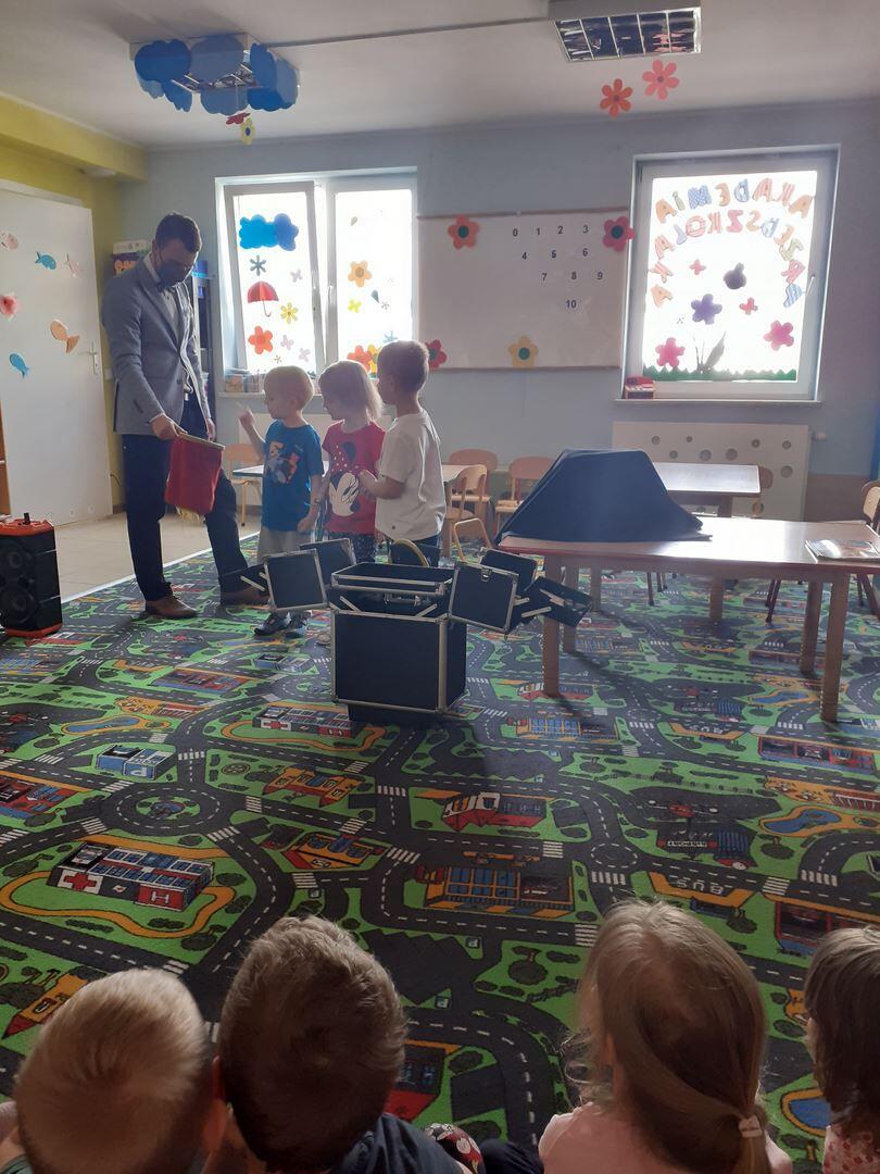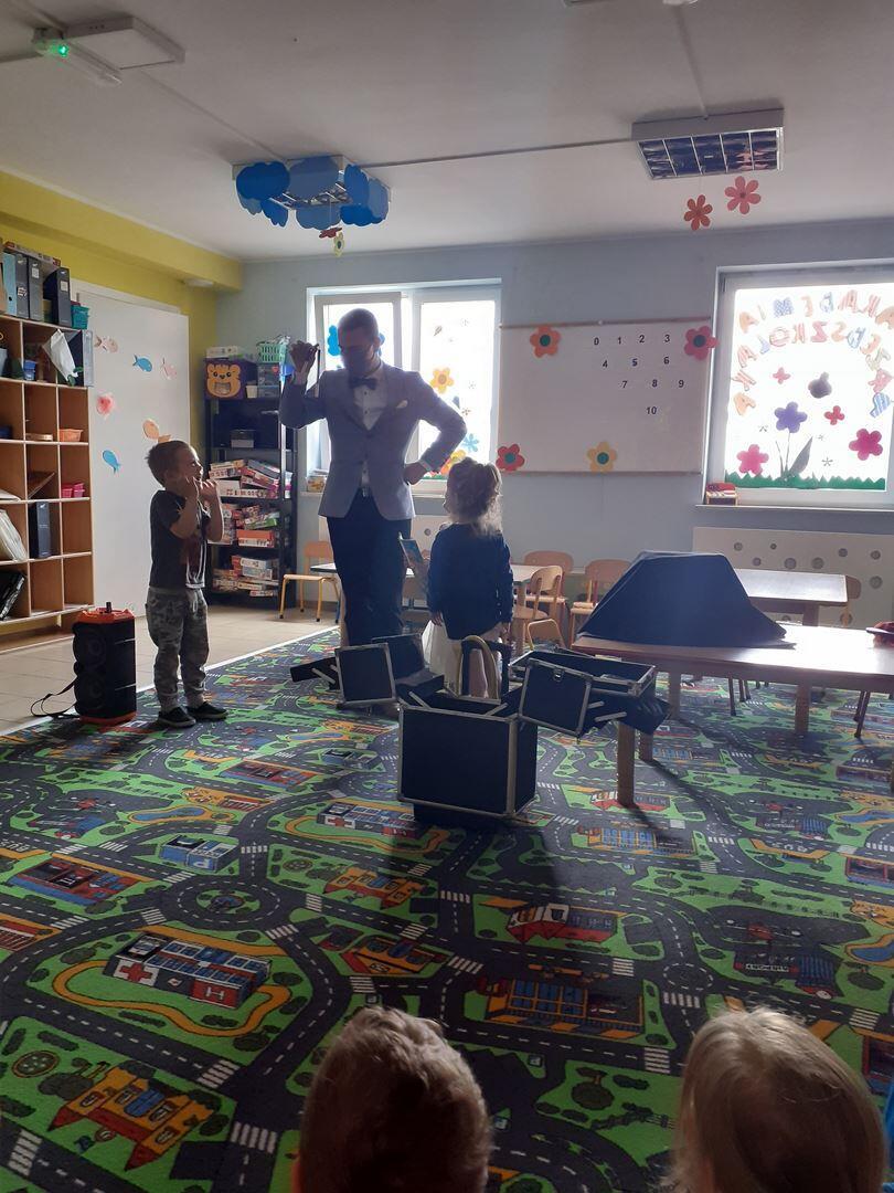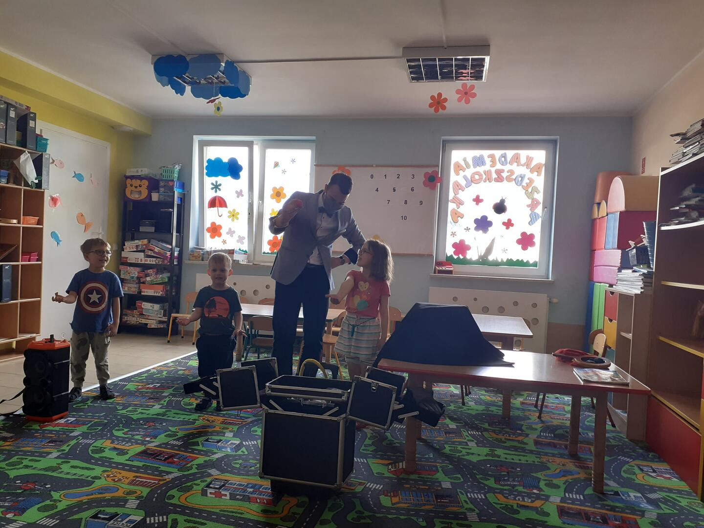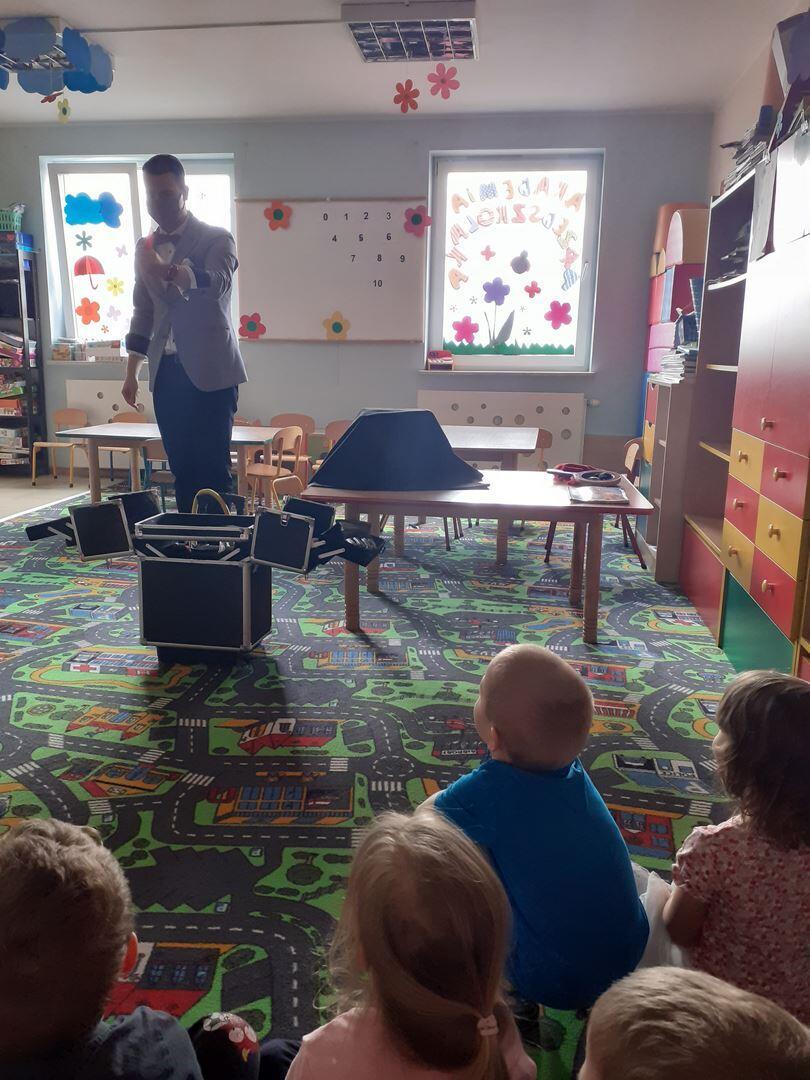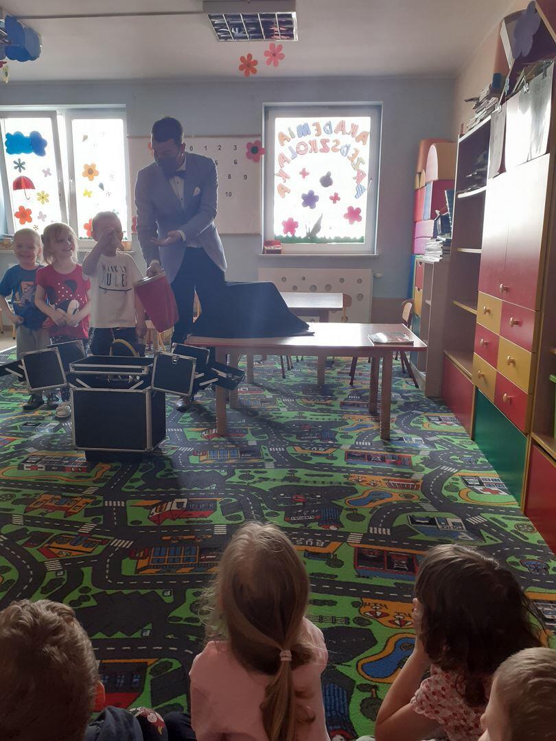 17.05.2021 w naszym przedszkolu zawitał Magik. Zainteresował dzieci poprzez pokazywanie inspirujących i ciekawych sztuczek. Dzieci brały udział w pokazie z dużym zainteresowaniem. Przez chwilę mogły się znaleść w świecie iluzji.