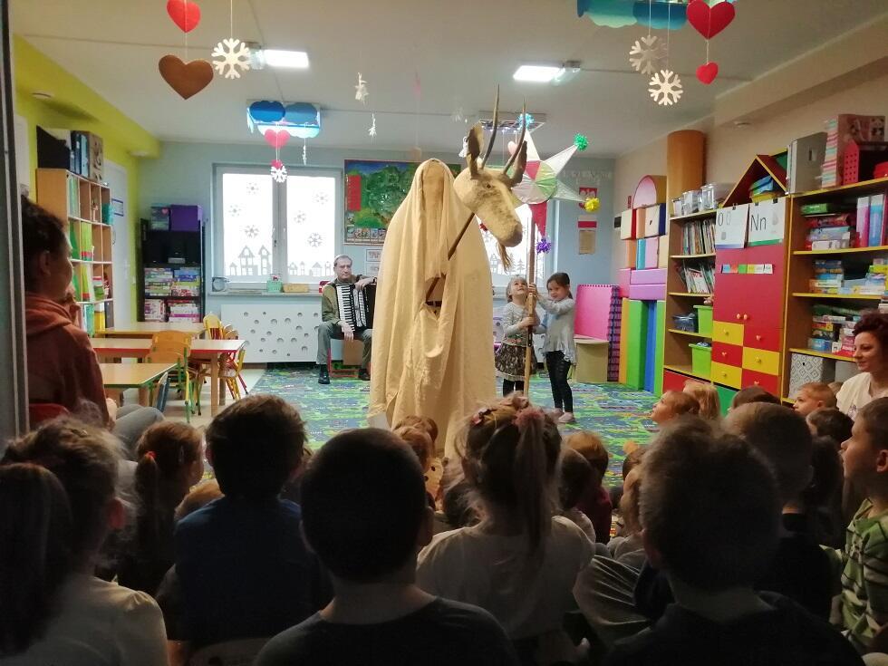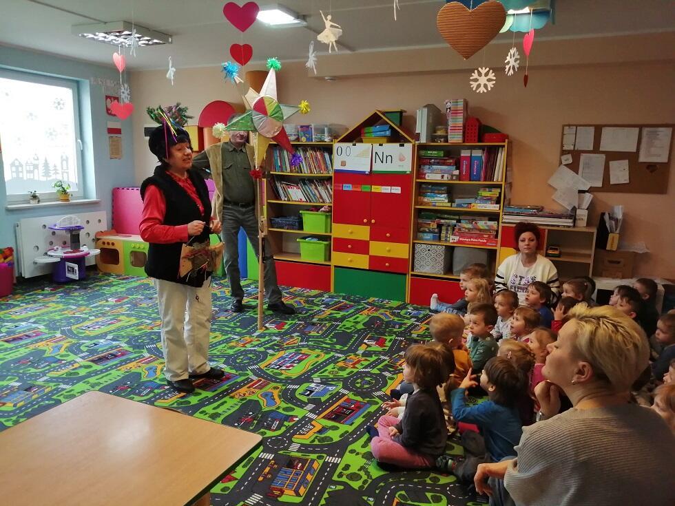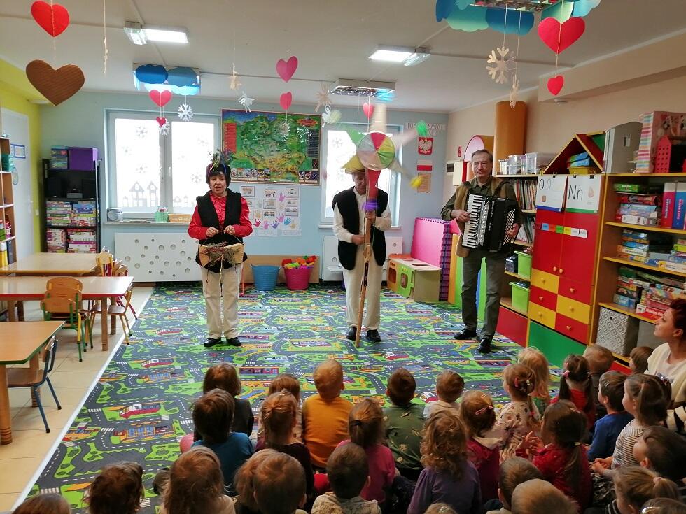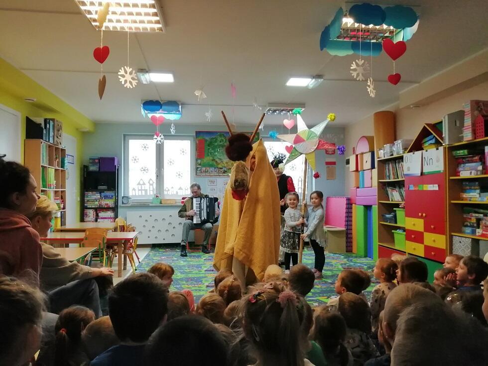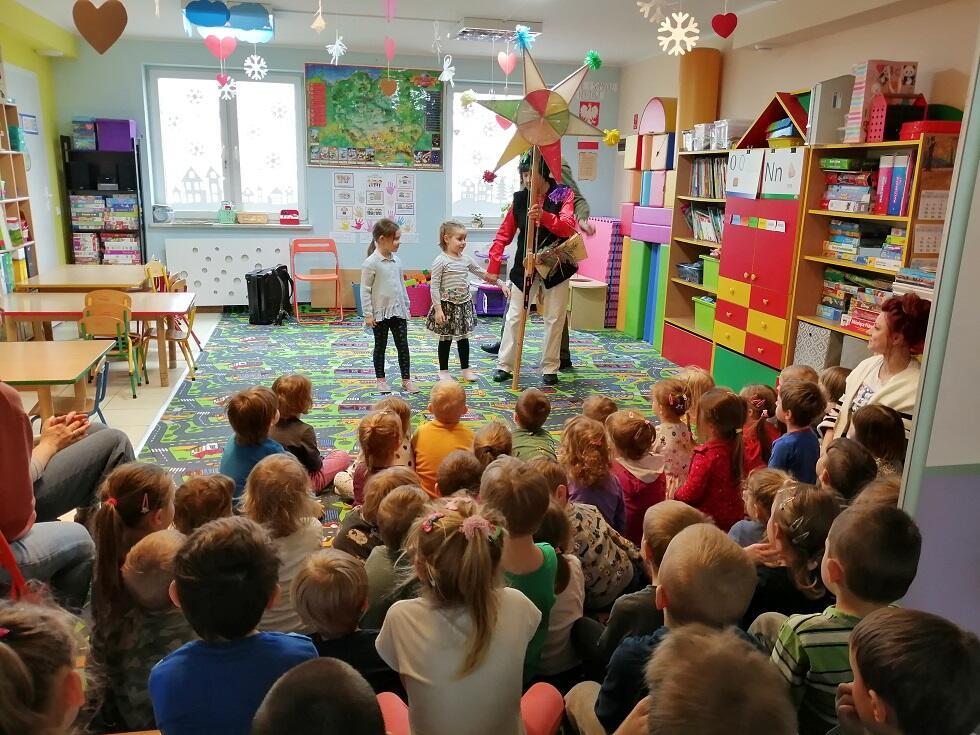 Dnia 17 lutego 2019 w naszym przedszkolu odbył się koncert przygotowany przez „PANIĄ MUZYKĘ", pt. "Zwyczaje kolędnicze w dawnej Polsce". Tematem spotkania były kolędy i zwyczaje zapustne. Na koncercie dzieci zabawiły się w kolędników. Zaśpiewały kolędy z gwiazdą, pomagały kolędować przebierańcom jak: turoń, bocian, dziady. Na zakończenie kolędowania odbyły się tańce.