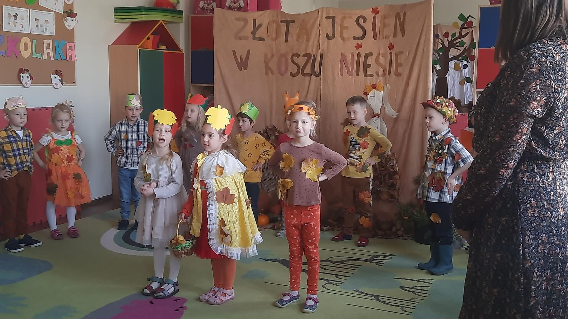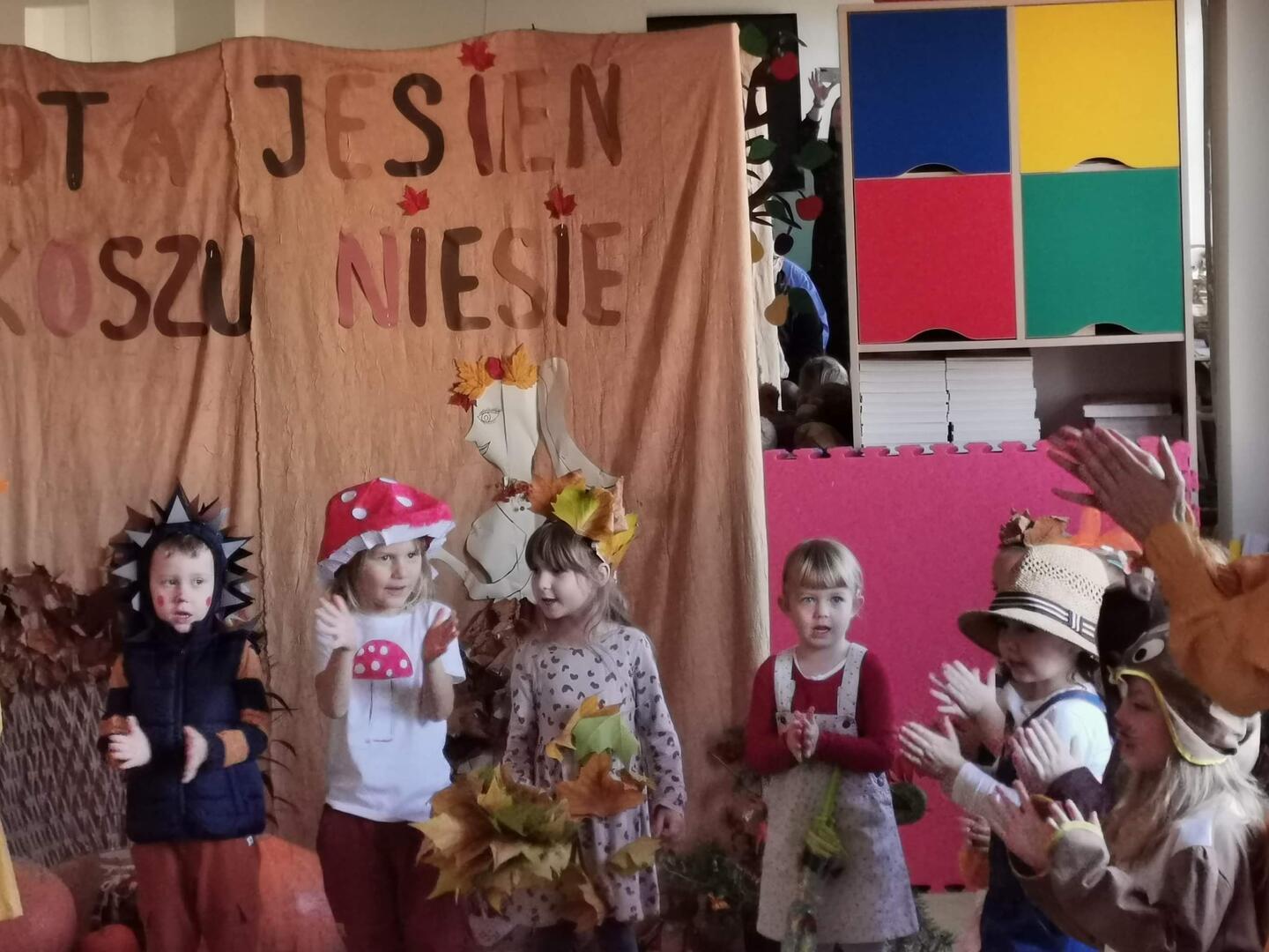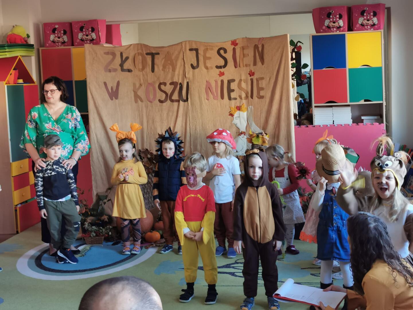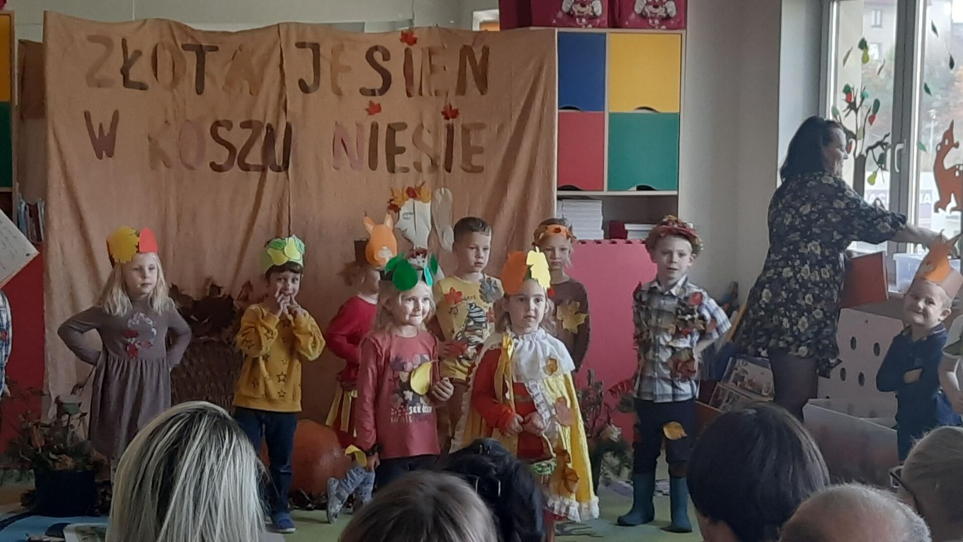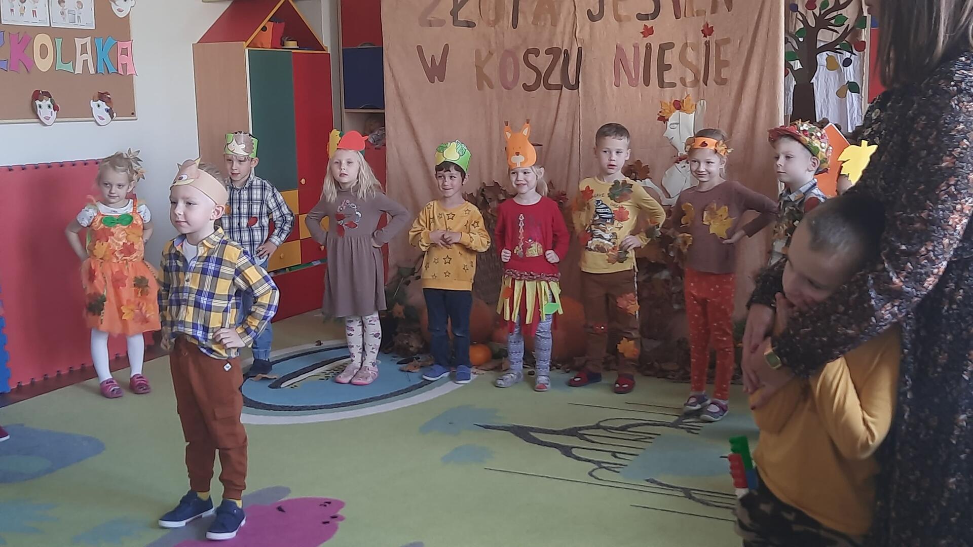 Dnia 26 października 2022r. odbyły się przedstawienia jesienne średniaków i starszaków. Nasi podopieczni przekazali nam cenną wiedzę o jesieni, jej darach i skarbach, pięknie recytując i śpiewając jesienne utwory. Dzieci podziękowały Pani Jesień za podarunki, ale też odniosły się do kolejnej pory roku - zimy, zwracając przy tym uwagę na robienie zapasów zawczasu. Grupy wspaniale wcieliły się w odgrywane role, pokazując przy tym jak hojna jest Pani Jesień i jakie cenne dary niesie dla ludzi, zwierząt, czyniąc przyrodę bogatszą, piękniejszą i wielobarwną. Po przedstawieniach każda z grup udała się na słodki poczęstunek. Dziękujemy rodzicom i bliskim za obecność, zaangażowanie i przygotowane stroje dla swoich pociech. ?