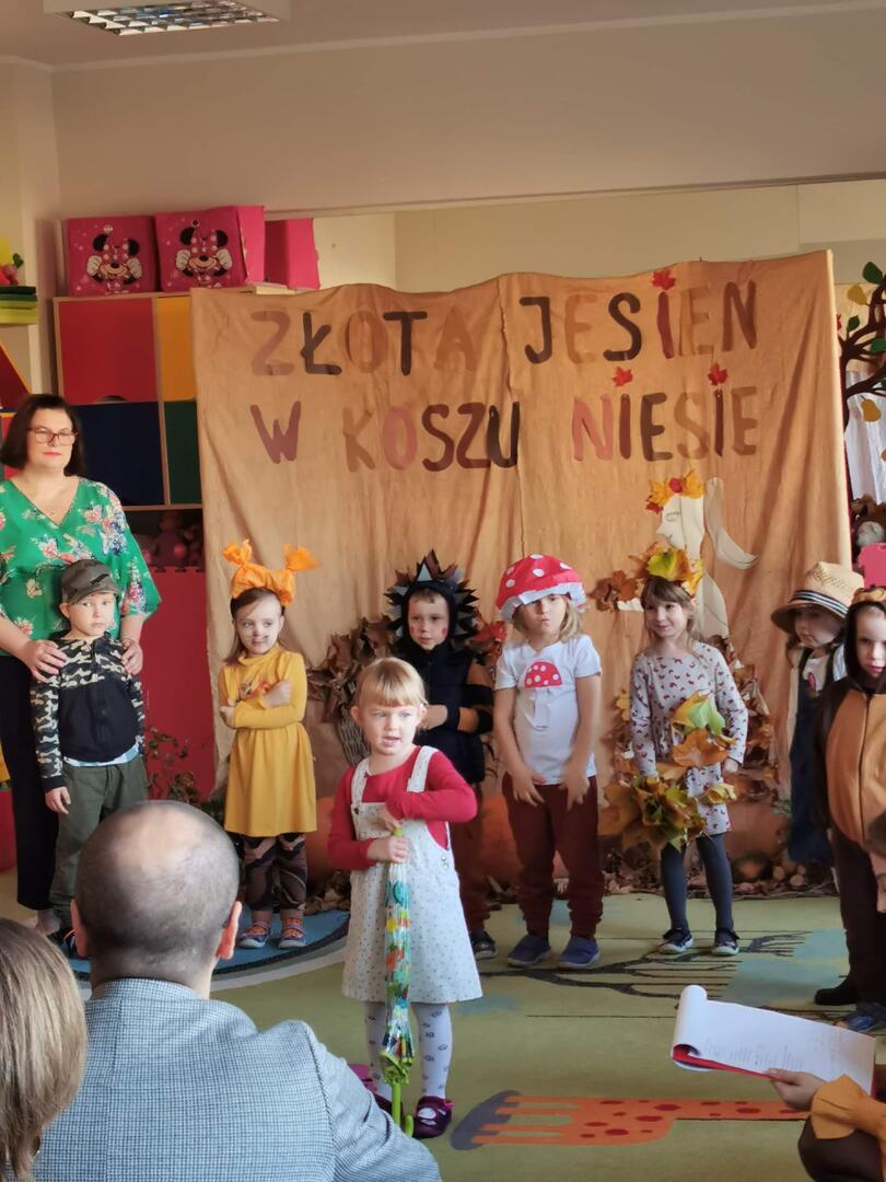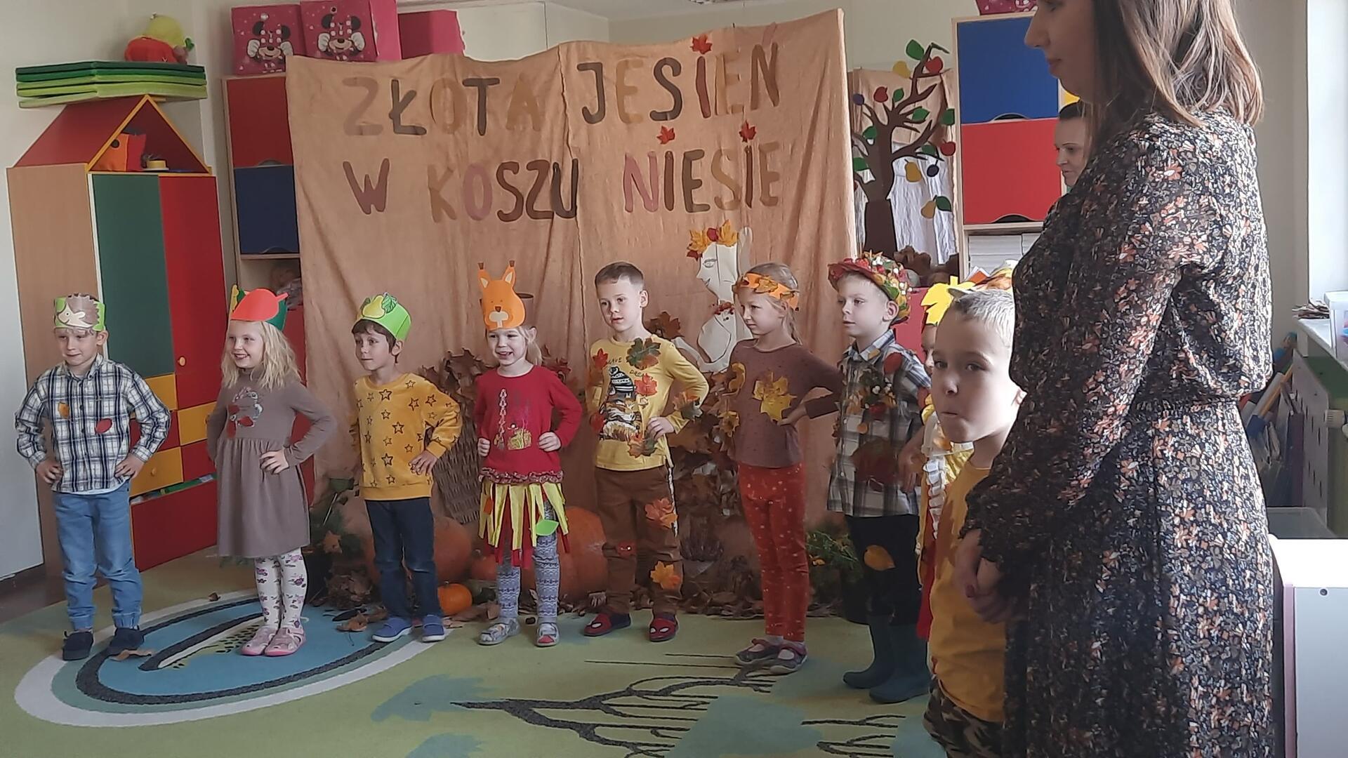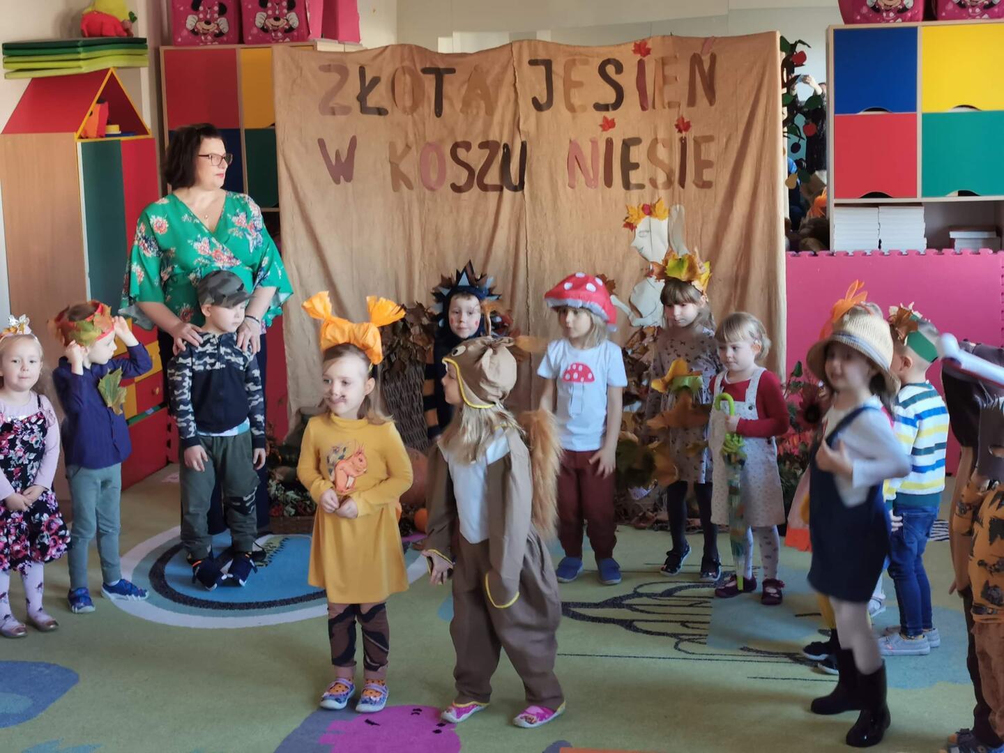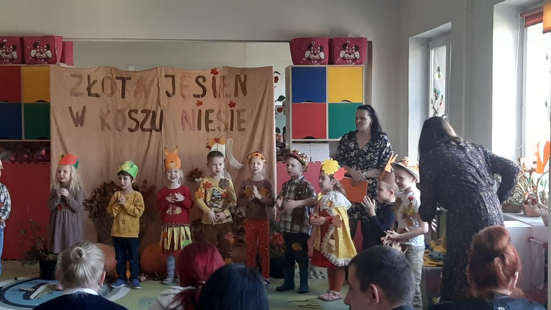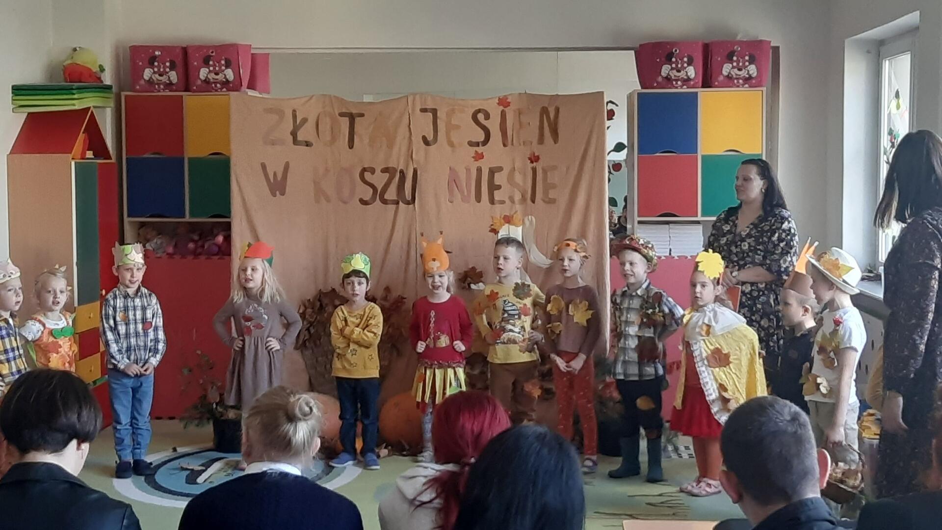 Dnia 26 października 2022r. odbyły się przedstawienia jesienne średniaków i starszaków. Nasi podopieczni przekazali nam cenną wiedzę o jesieni, jej darach i skarbach, pięknie recytując i śpiewając jesienne utwory. Dzieci podziękowały Pani Jesień za podarunki, ale też odniosły się do kolejnej pory roku - zimy, zwracając przy tym uwagę na robienie zapasów zawczasu. Grupy wspaniale wcieliły się w odgrywane role, pokazując przy tym jak hojna jest Pani Jesień i jakie cenne dary niesie dla ludzi, zwierząt, czyniąc przyrodę bogatszą, piękniejszą i wielobarwną. Po przedstawieniach każda z grup udała się na słodki poczęstunek. Dziękujemy rodzicom i bliskim za obecność, zaangażowanie i przygotowane stroje dla swoich pociech. ?
