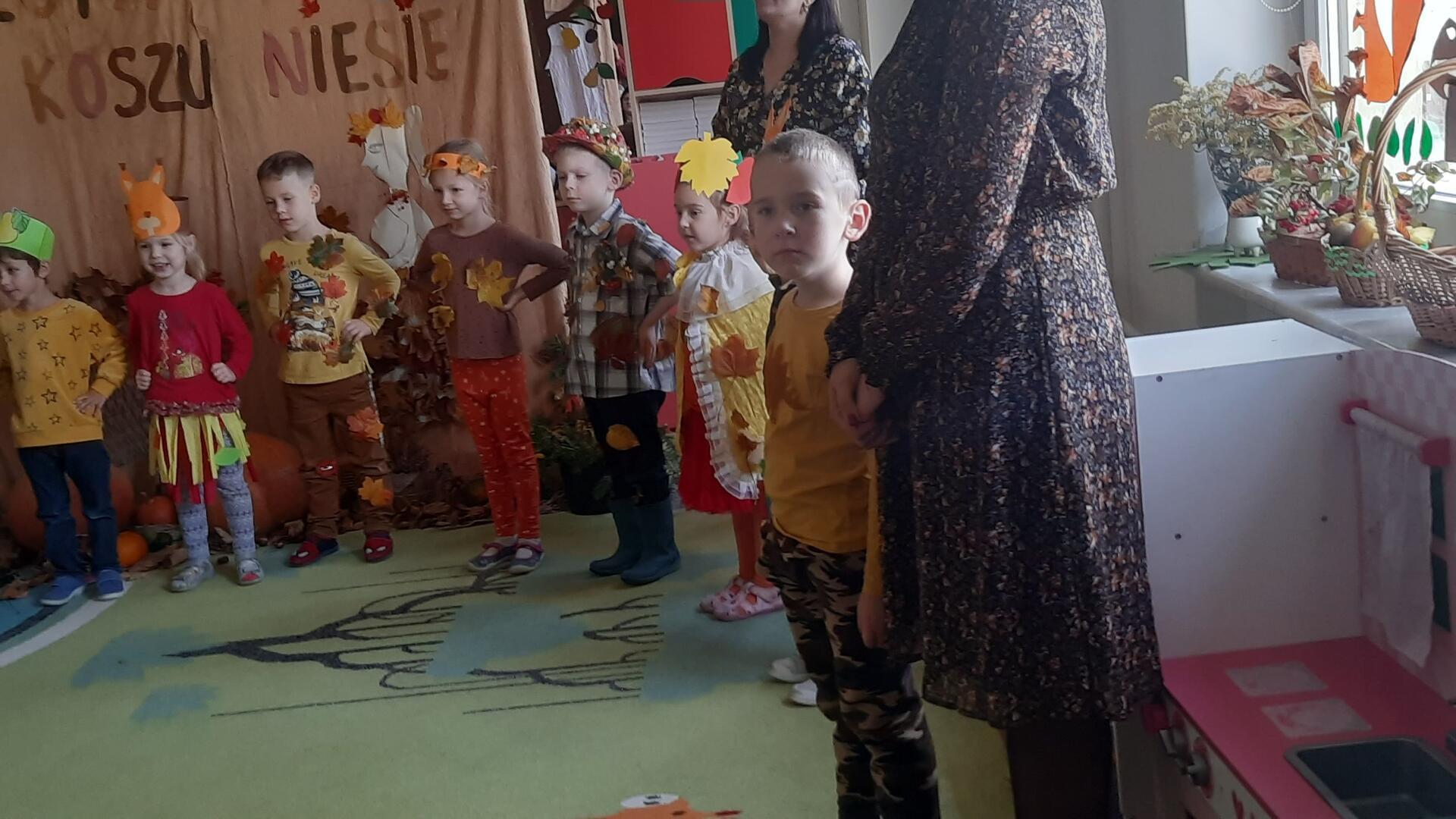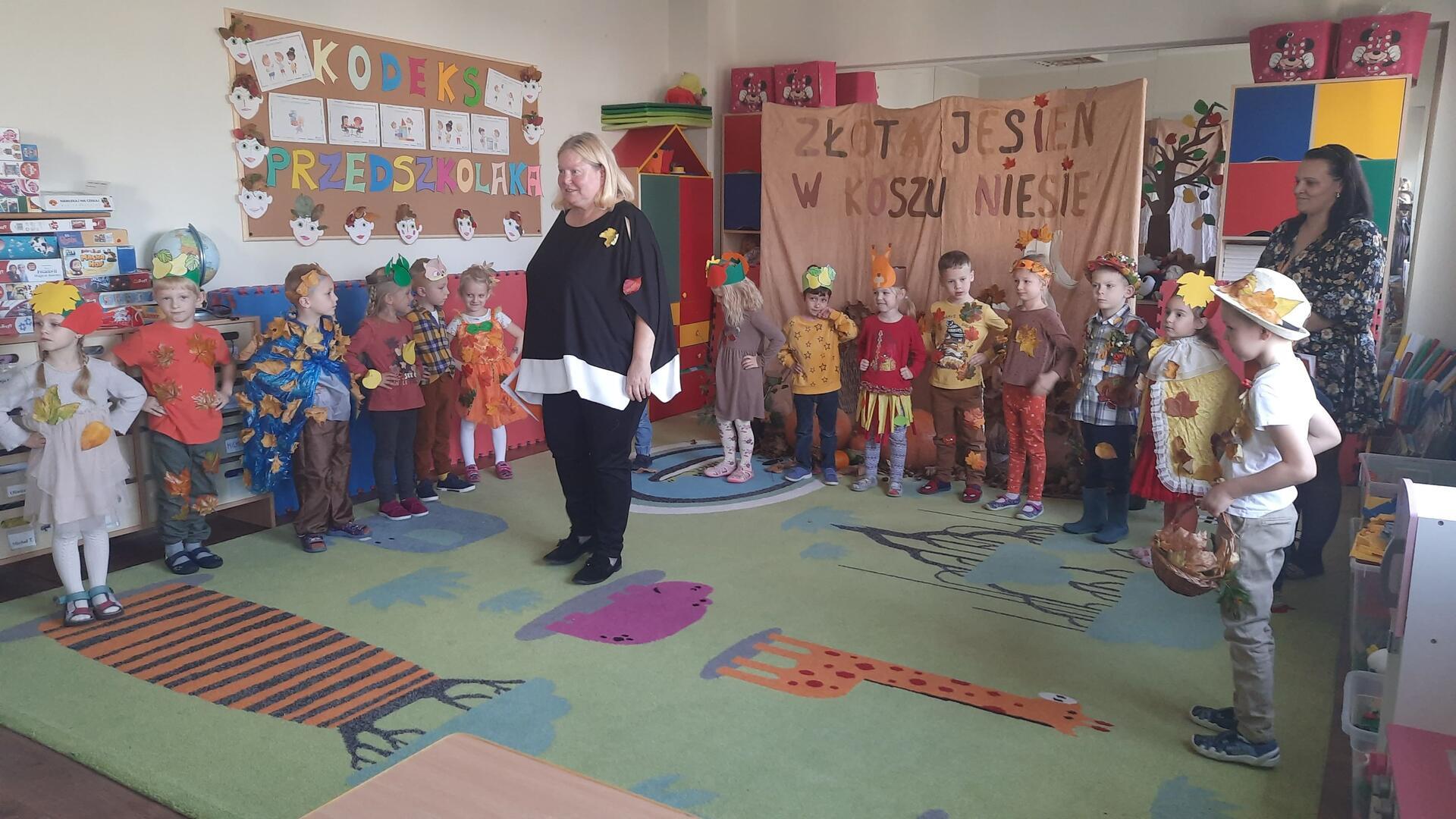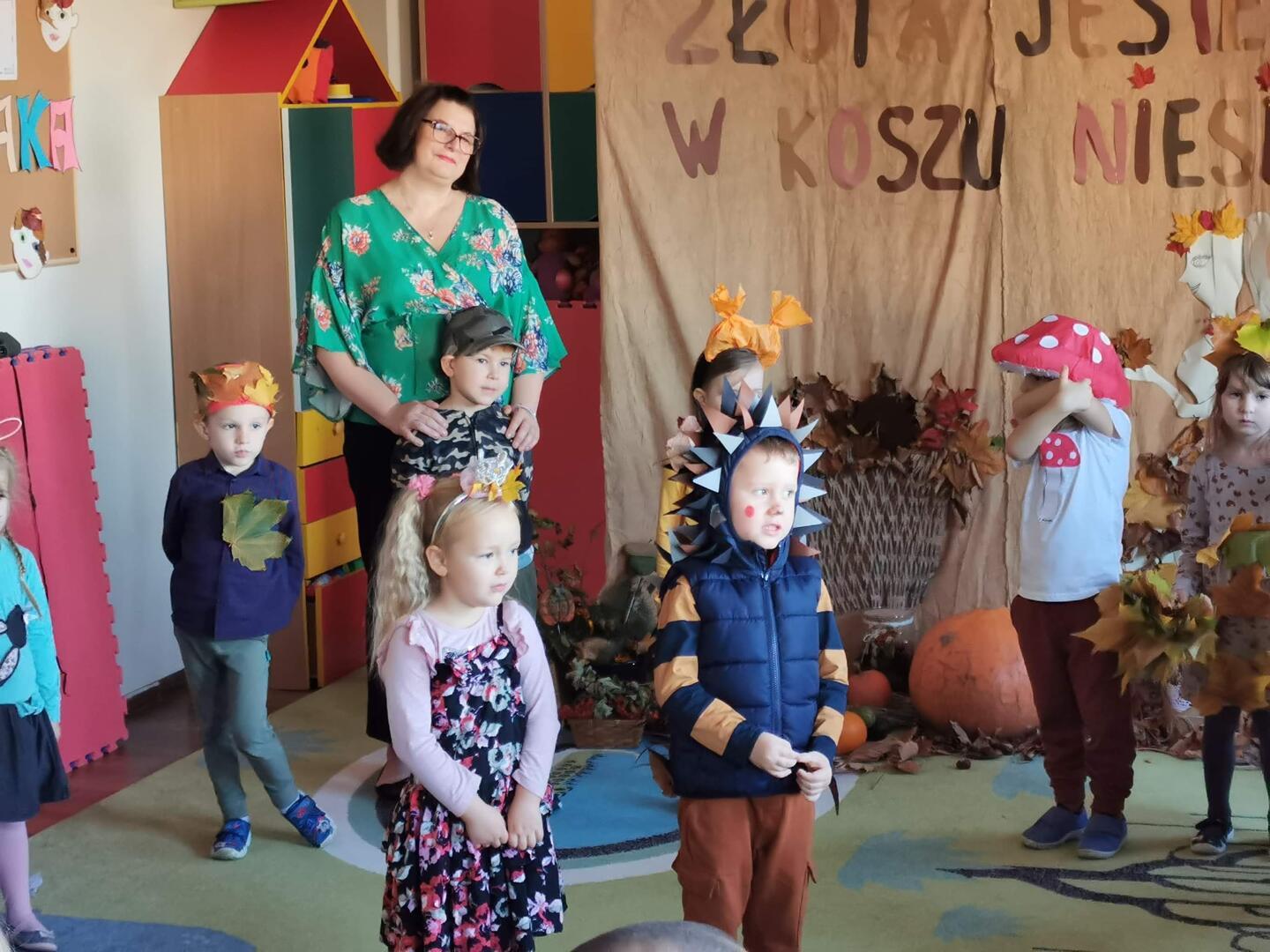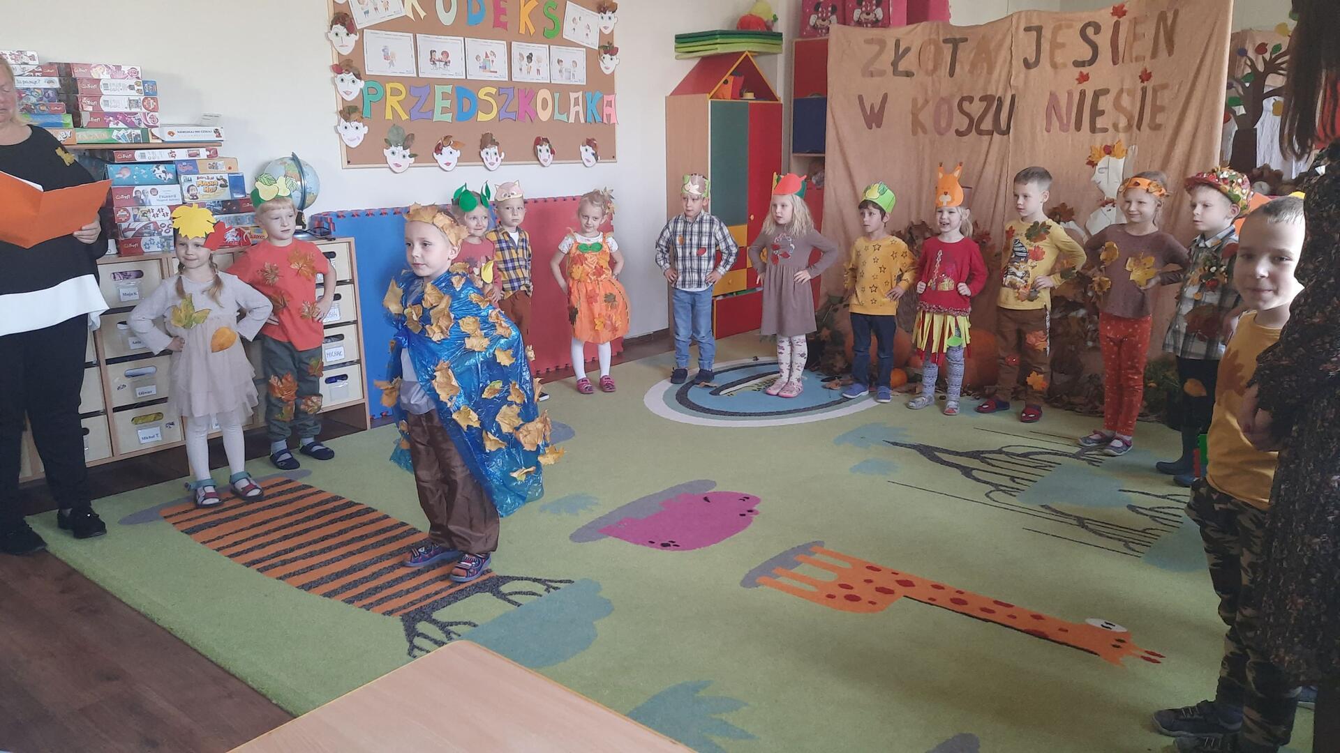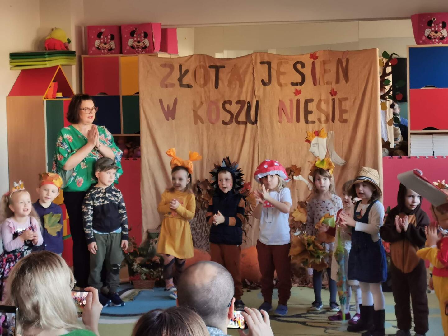 Dnia 26 października 2022r. odbyły się przedstawienia jesienne średniaków i starszaków. Nasi podopieczni przekazali nam cenną wiedzę o jesieni, jej darach i skarbach, pięknie recytując i śpiewając jesienne utwory. Dzieci podziękowały Pani Jesień za podarunki, ale też odniosły się do kolejnej pory roku - zimy, zwracając przy tym uwagę na robienie zapasów zawczasu. Grupy wspaniale wcieliły się w odgrywane role, pokazując przy tym jak hojna jest Pani Jesień i jakie cenne dary niesie dla ludzi, zwierząt, czyniąc przyrodę bogatszą, piękniejszą i wielobarwną. Po przedstawieniach każda z grup udała się na słodki poczęstunek. Dziękujemy rodzicom i bliskim za obecność, zaangażowanie i przygotowane stroje dla swoich pociech. ?