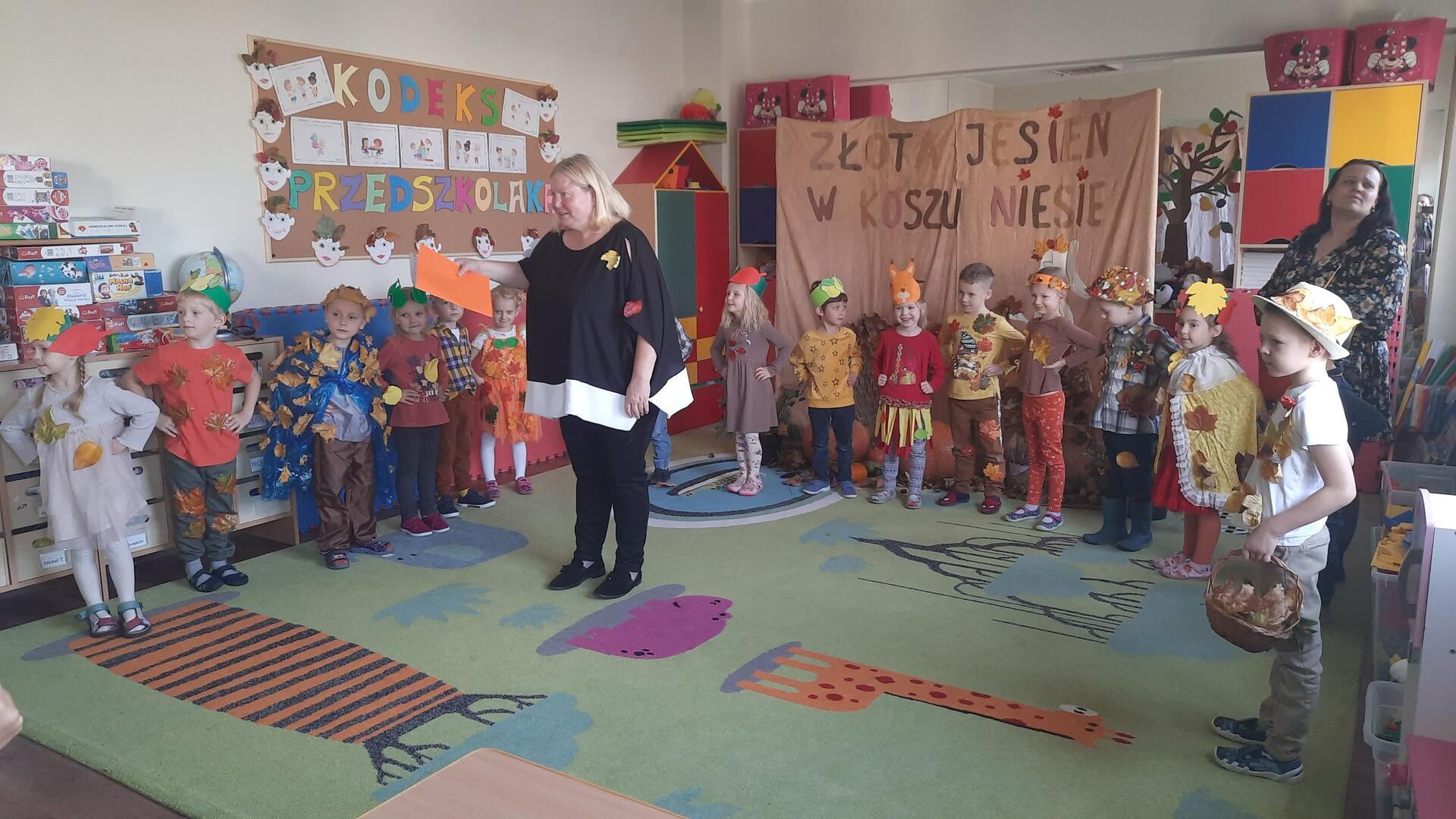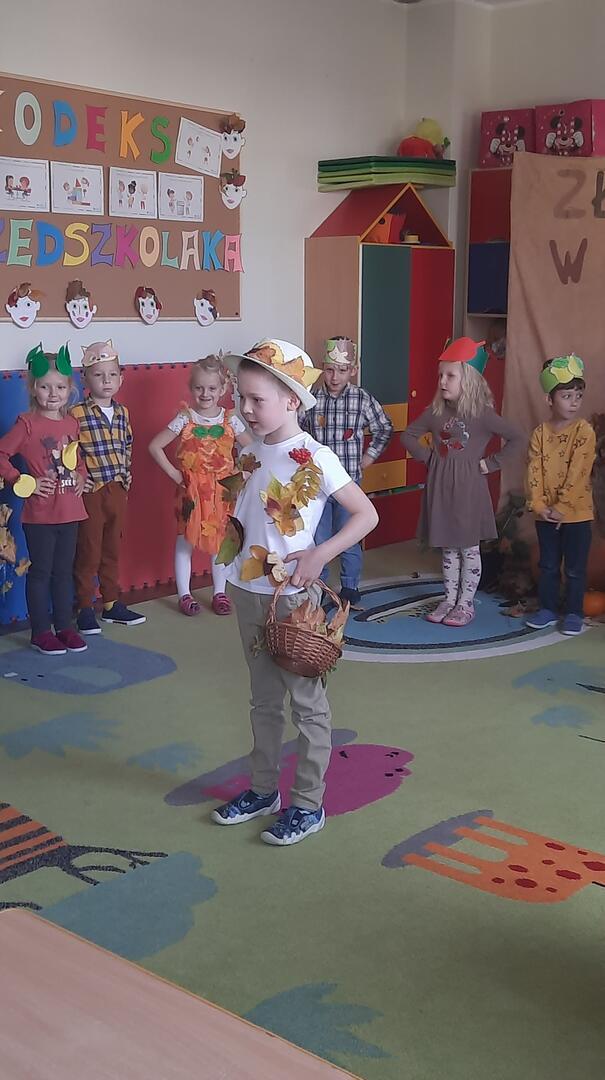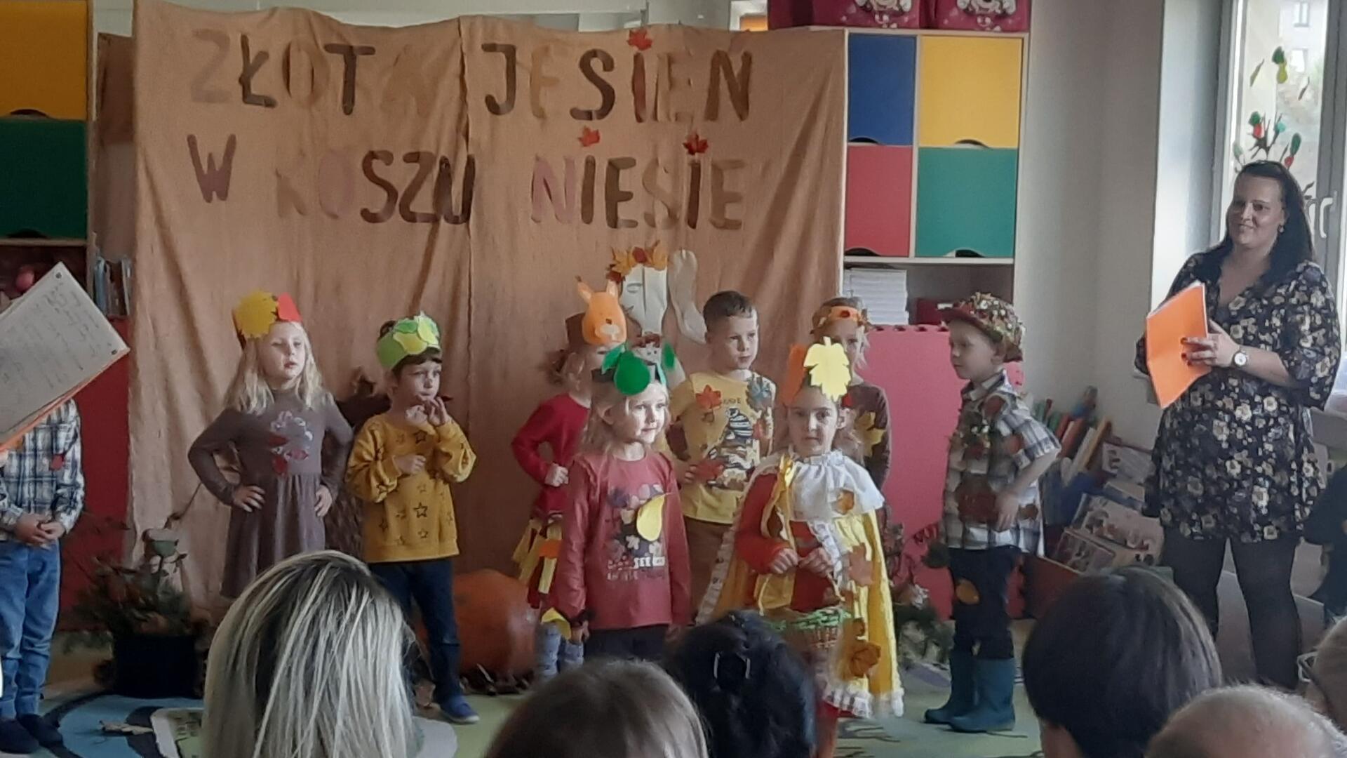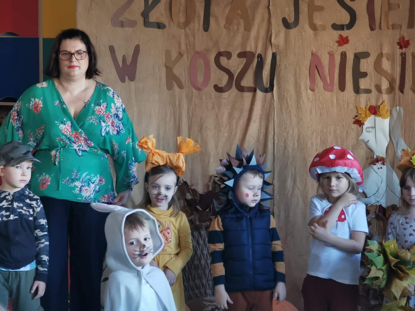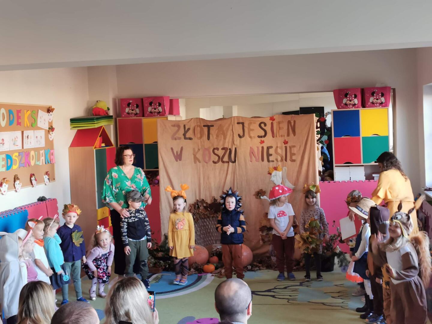 Dnia 26 października 2022r. odbyły się przedstawienia jesienne średniaków i starszaków. Nasi podopieczni przekazali nam cenną wiedzę o jesieni, jej darach i skarbach, pięknie recytując i śpiewając jesienne utwory. Dzieci podziękowały Pani Jesień za podarunki, ale też odniosły się do kolejnej pory roku - zimy, zwracając przy tym uwagę na robienie zapasów zawczasu. Grupy wspaniale wcieliły się w odgrywane role, pokazując przy tym jak hojna jest Pani Jesień i jakie cenne dary niesie dla ludzi, zwierząt, czyniąc przyrodę bogatszą, piękniejszą i wielobarwną. Po przedstawieniach każda z grup udała się na słodki poczęstunek. Dziękujemy rodzicom i bliskim za obecność, zaangażowanie i przygotowane stroje dla swoich pociech. ?