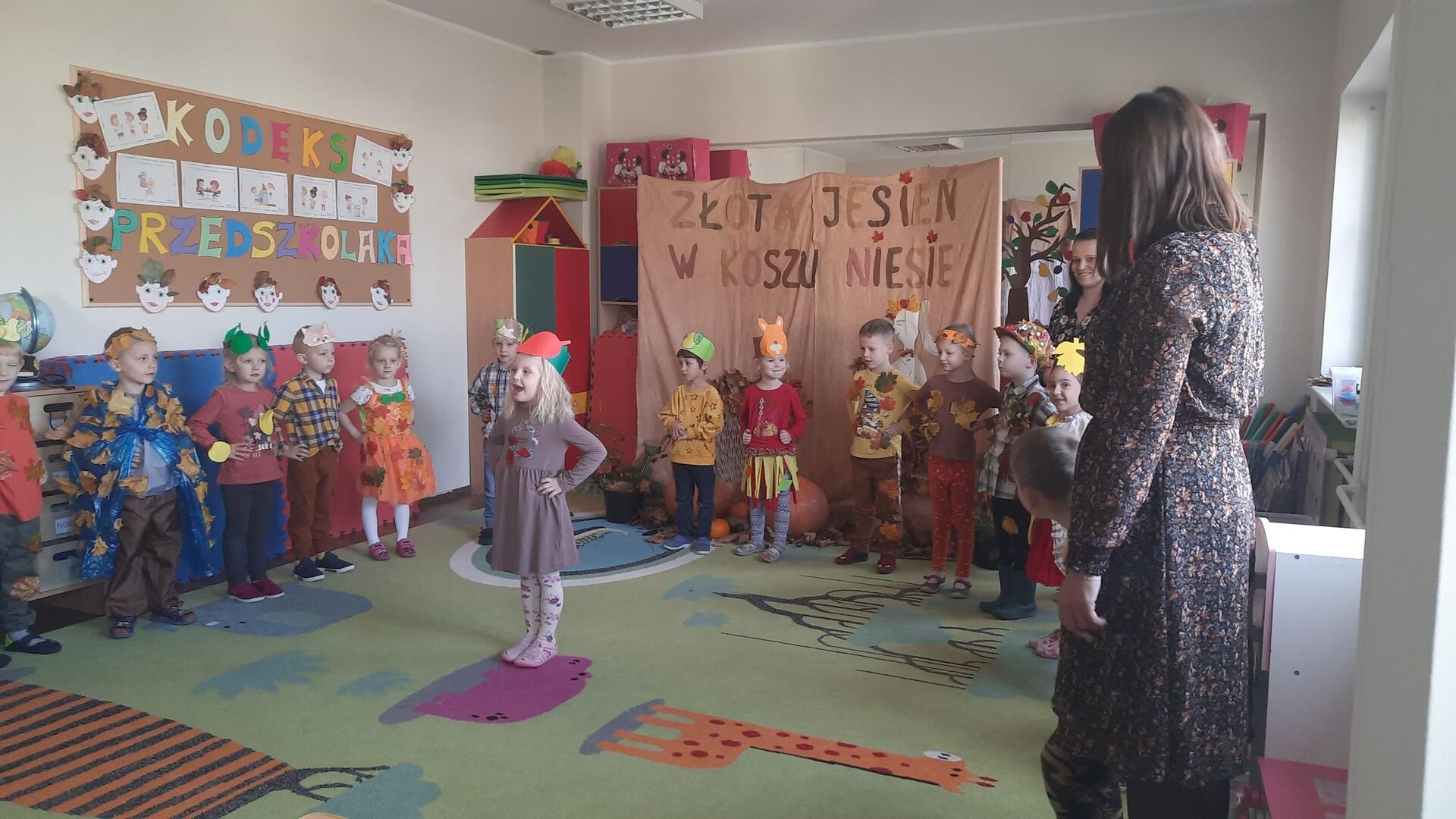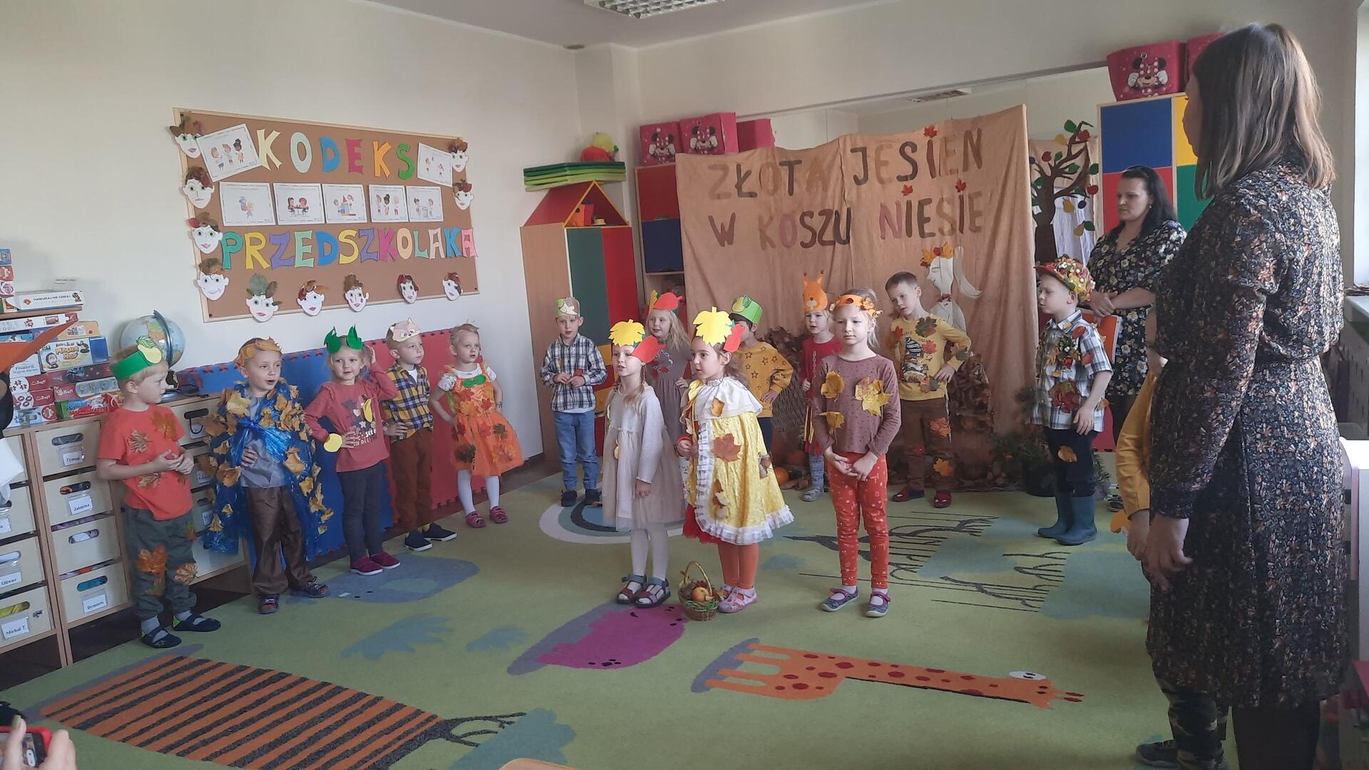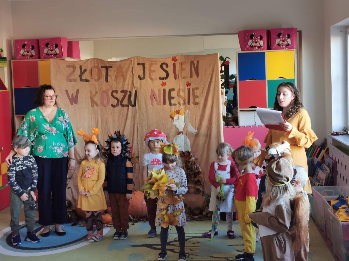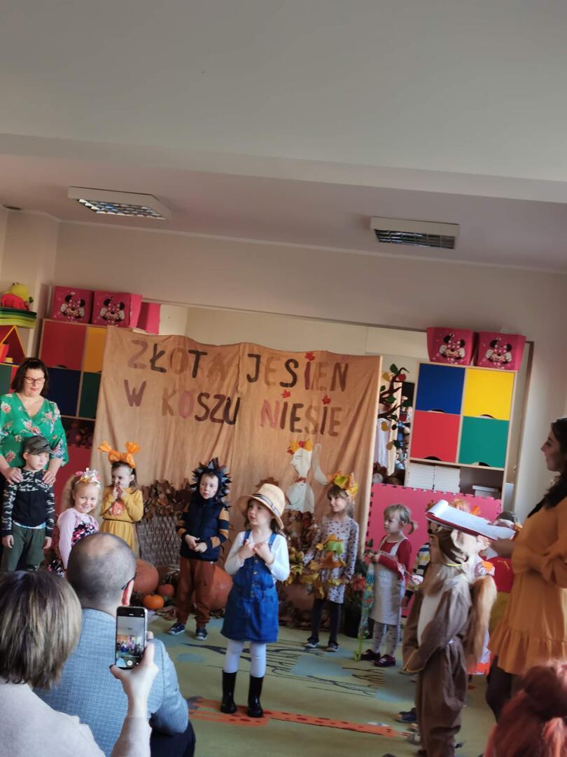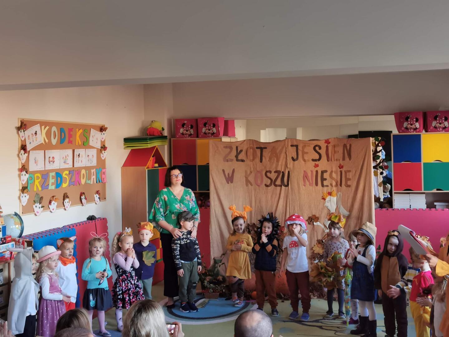 Dnia 26 października 2022r. odbyły się przedstawienia jesienne średniaków i starszaków. Nasi podopieczni przekazali nam cenną wiedzę o jesieni, jej darach i skarbach, pięknie recytując i śpiewając jesienne utwory. Dzieci podziękowały Pani Jesień za podarunki, ale też odniosły się do kolejnej pory roku - zimy, zwracając przy tym uwagę na robienie zapasów zawczasu. Grupy wspaniale wcieliły się w odgrywane role, pokazując przy tym jak hojna jest Pani Jesień i jakie cenne dary niesie dla ludzi, zwierząt, czyniąc przyrodę bogatszą, piękniejszą i wielobarwną. Po przedstawieniach każda z grup udała się na słodki poczęstunek. Dziękujemy rodzicom i bliskim za obecność, zaangażowanie i przygotowane stroje dla swoich pociech. ?