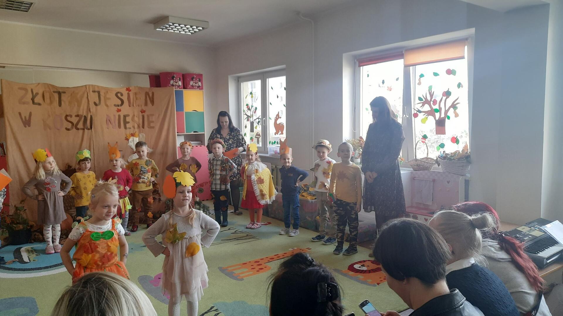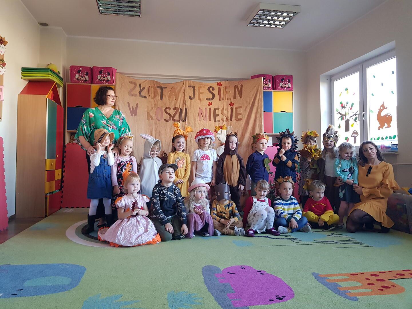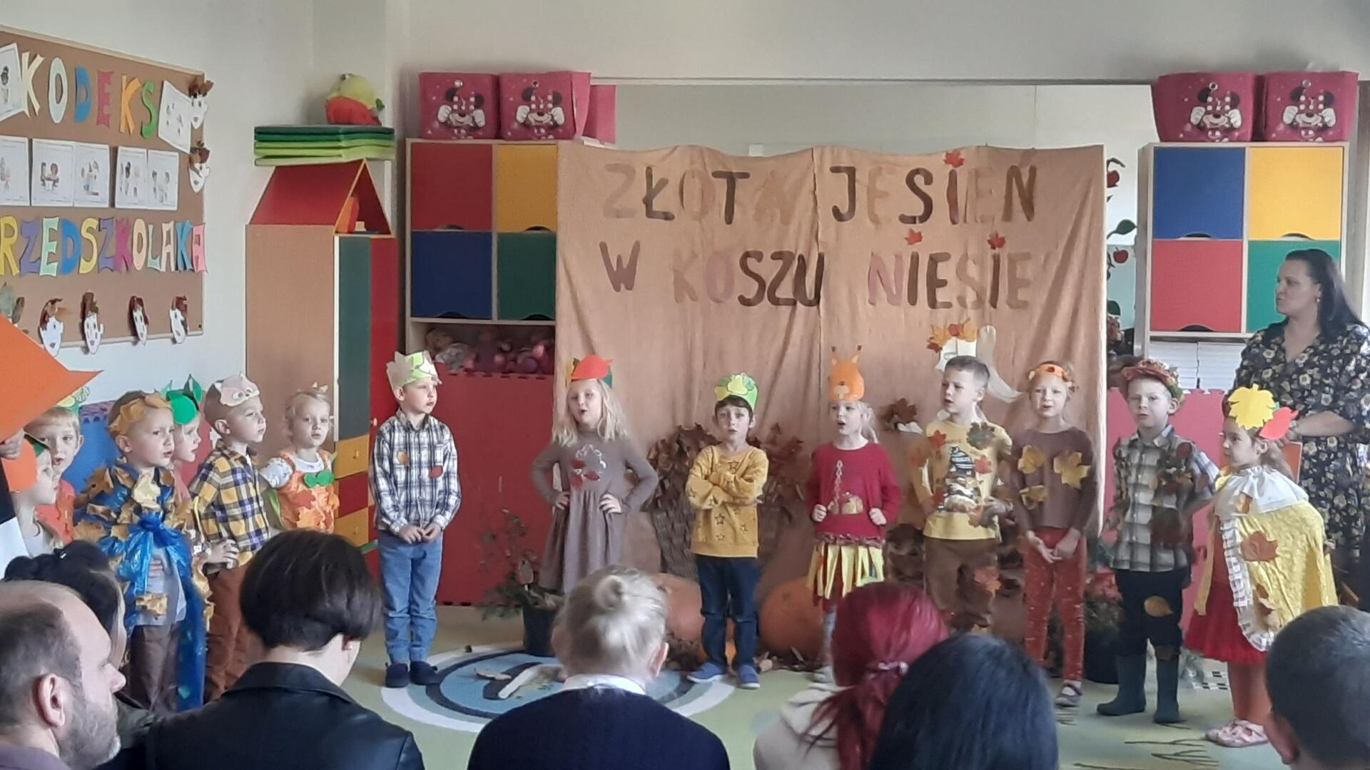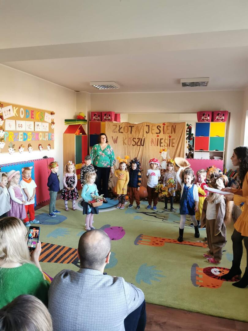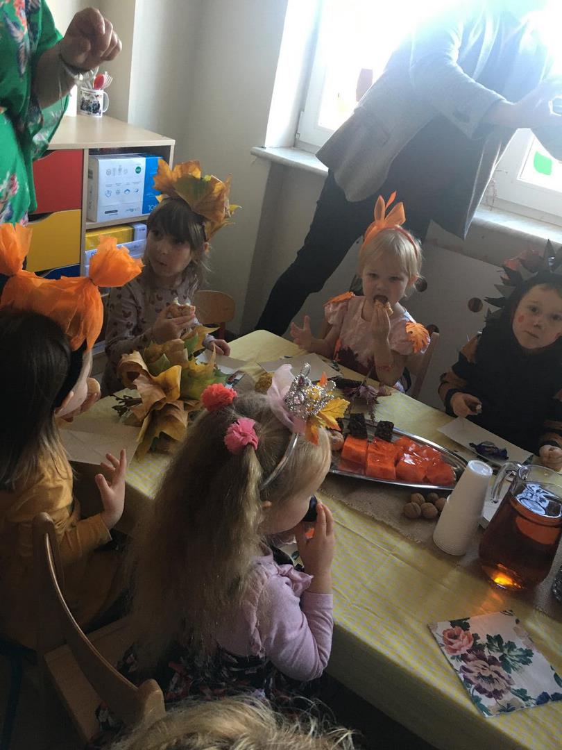 Dnia 26 października 2022r. odbyły się przedstawienia jesienne średniaków i starszaków. Nasi podopieczni przekazali nam cenną wiedzę o jesieni, jej darach i skarbach, pięknie recytując i śpiewając jesienne utwory. Dzieci podziękowały Pani Jesień za podarunki, ale też odniosły się do kolejnej pory roku - zimy, zwracając przy tym uwagę na robienie zapasów zawczasu. Grupy wspaniale wcieliły się w odgrywane role, pokazując przy tym jak hojna jest Pani Jesień i jakie cenne dary niesie dla ludzi, zwierząt, czyniąc przyrodę bogatszą, piękniejszą i wielobarwną. Po przedstawieniach każda z grup udała się na słodki poczęstunek. Dziękujemy rodzicom i bliskim za obecność, zaangażowanie i przygotowane stroje dla swoich pociech. ?