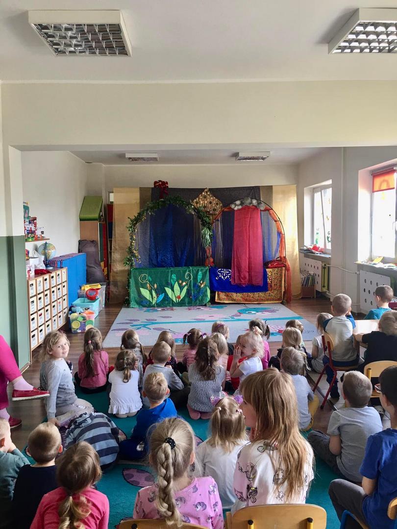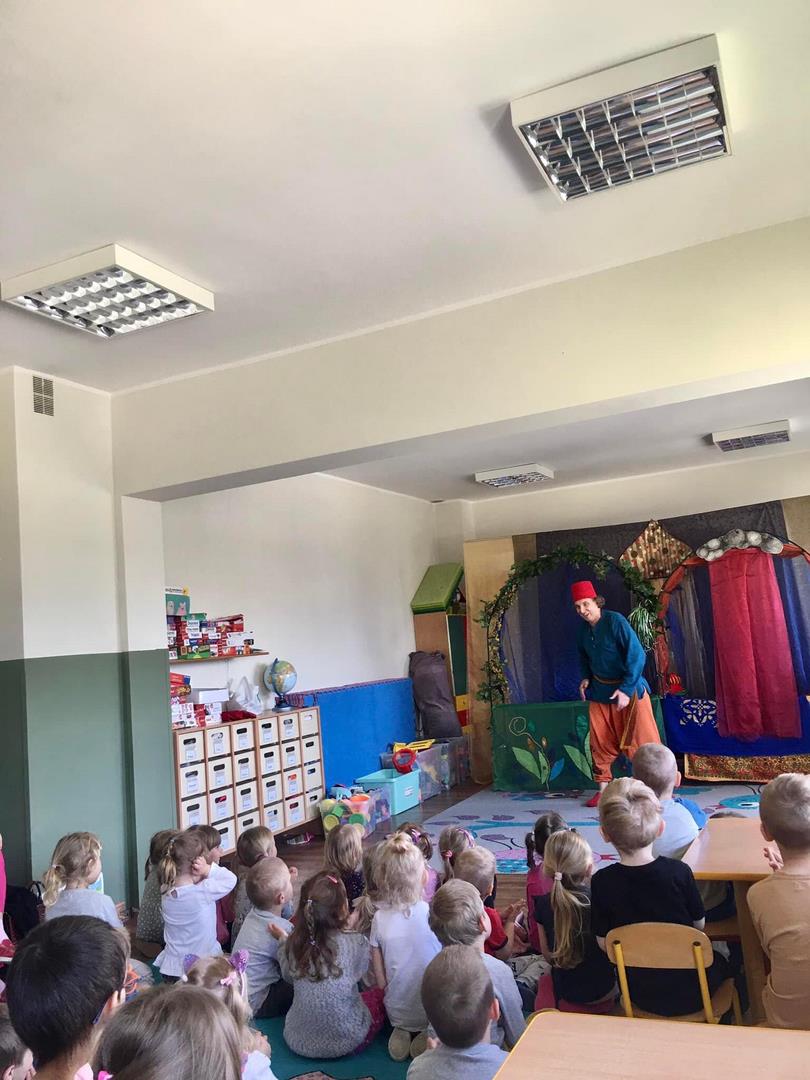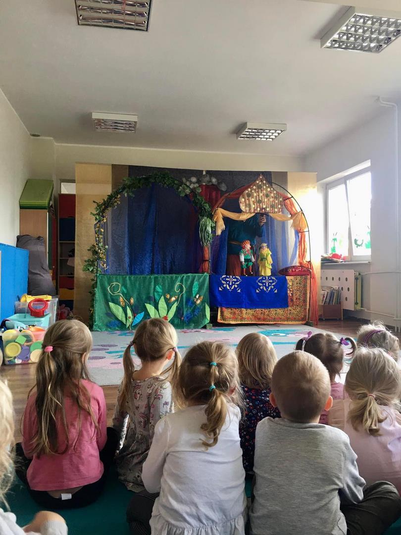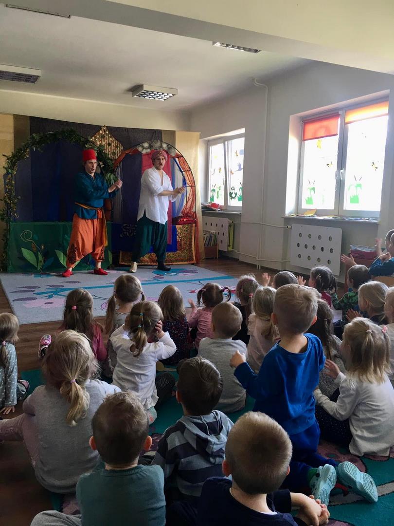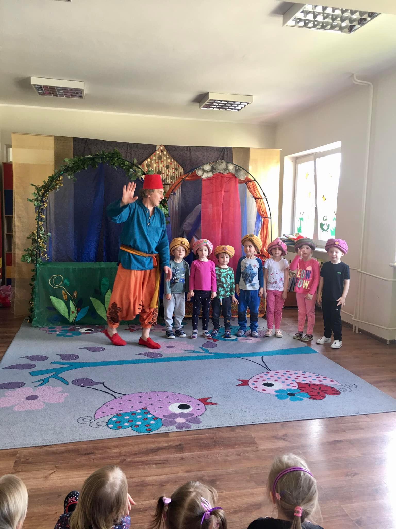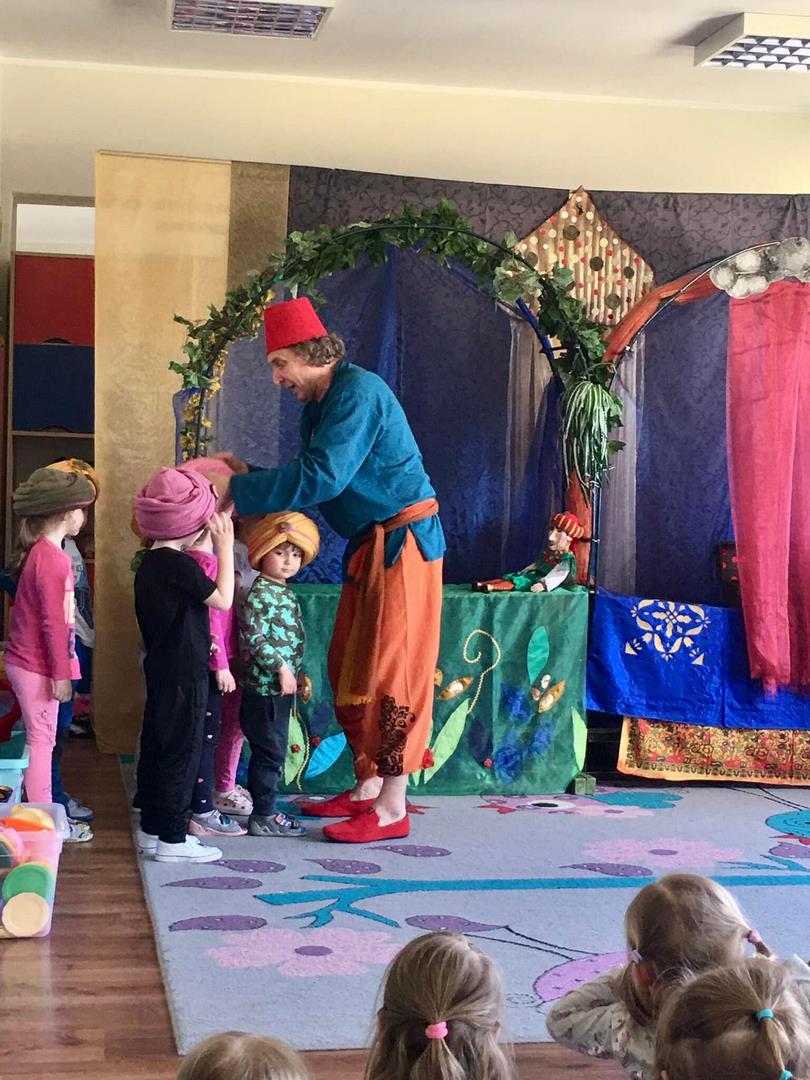 W ubiegły piątek zawitał do nas Teatr Qfer, który zaprezentował przedszkolakom dwie znane inscenizacje bajek ,,Alladyn” oraz ,,Alibaba i czterdziestu rozbójników”. Przedstawienie wywołało dużo radości i uśmiechu na twarzach naszych podopiecznych. Nie tylko mogli oni obejrzeć wspaniała grę aktorską z udziałem kukiełek, ale też zostały wciągnięte w wir opowieści o rozbójnikach, których głównym zadaniem było rabowanie i pilnowanie sezamu przepełnionego licznymi bogactwami. Pomocnicy perskiego przywódcy starali się zaatakować Alibabę, jednak zostali przechytrzeni przez służącą Alibaby.