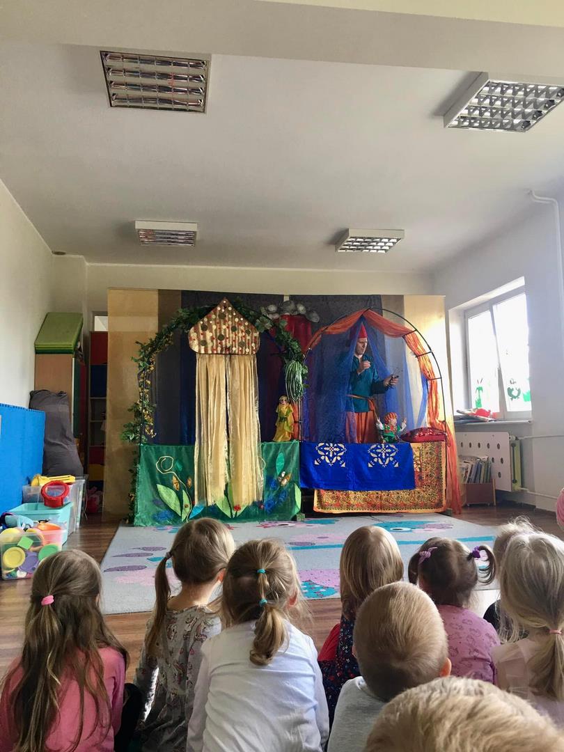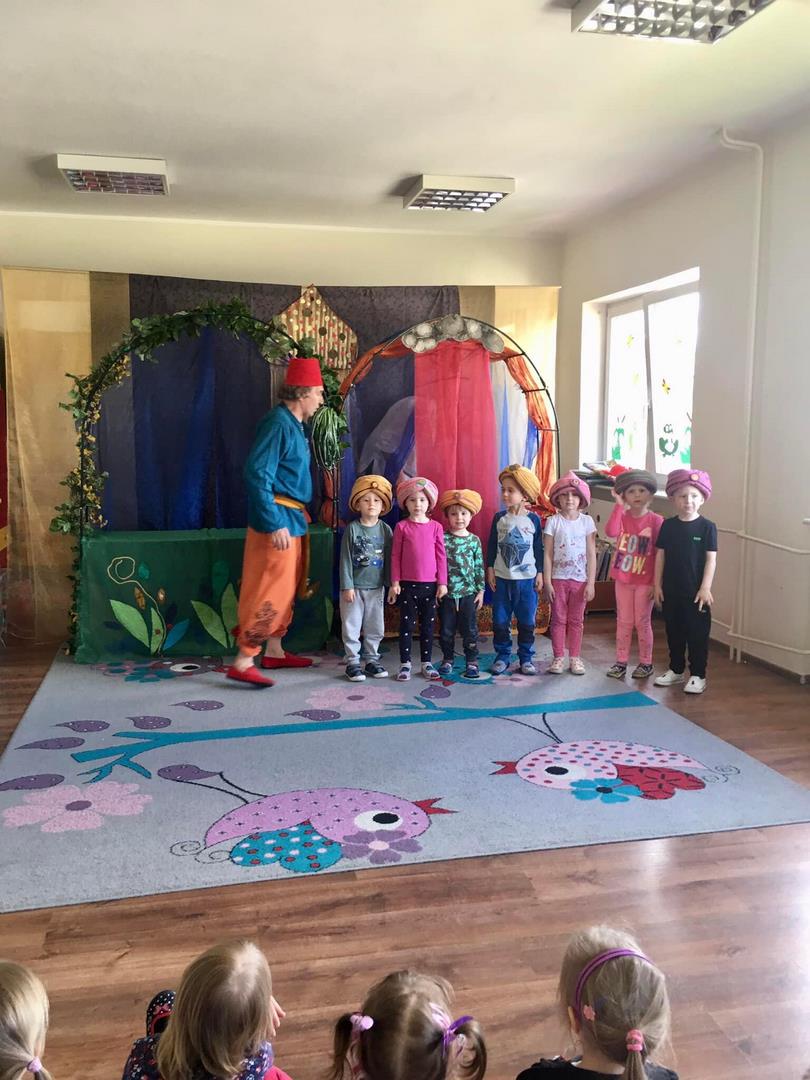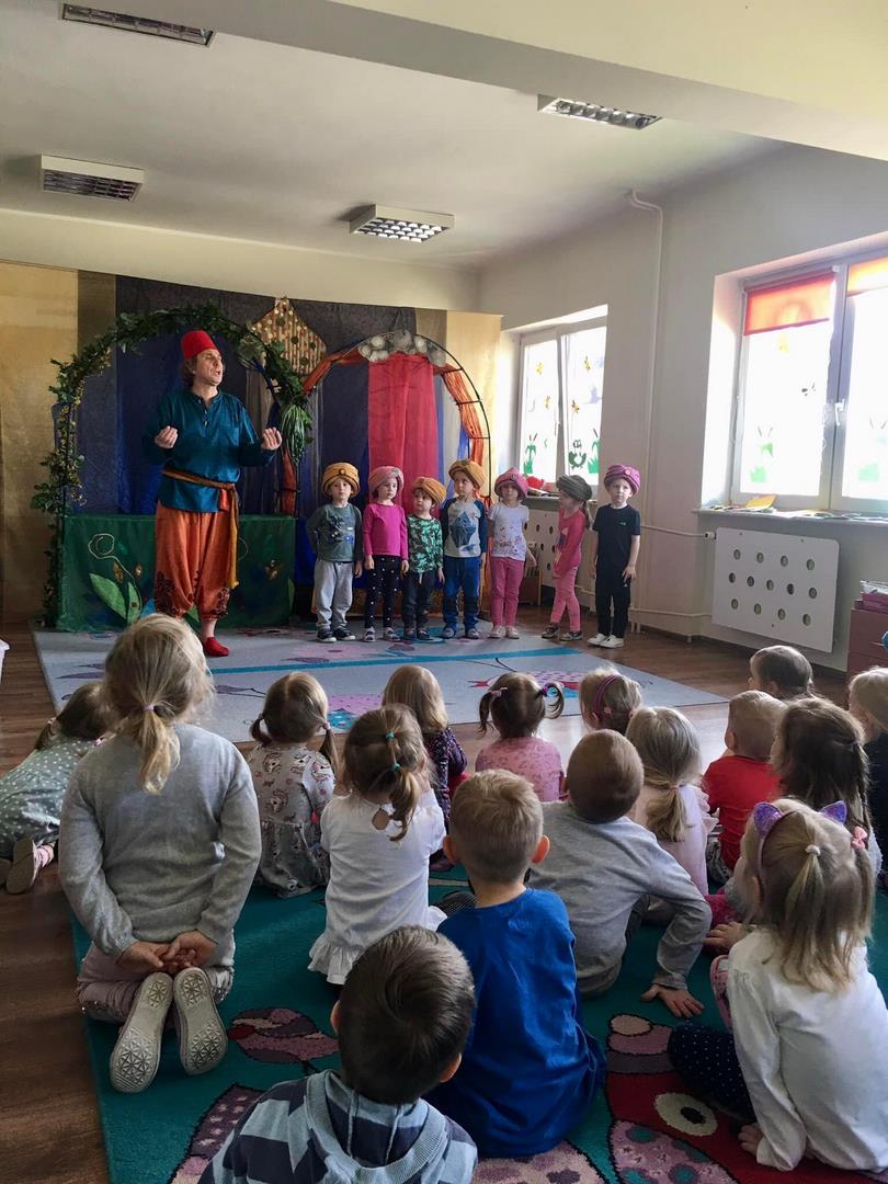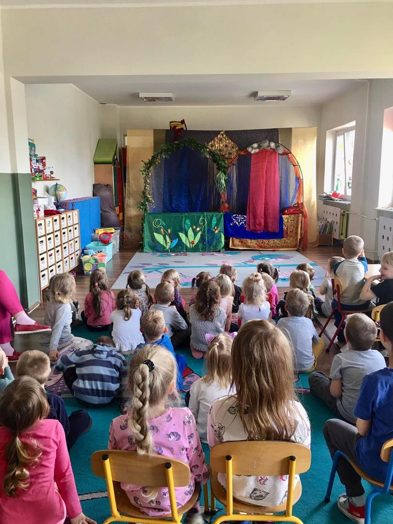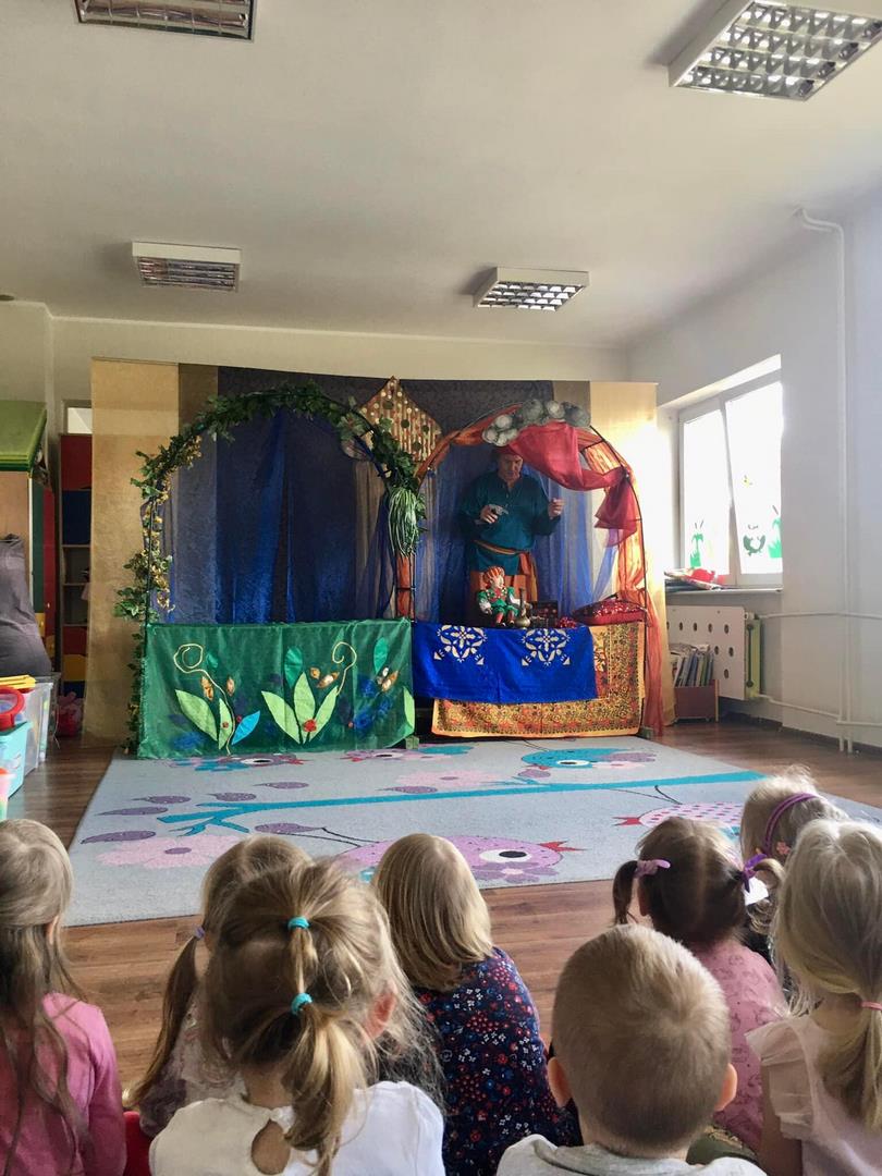 W ubiegły piątek zawitał do nas Teatr Qfer, który zaprezentował przedszkolakom dwie znane inscenizacje bajek ,,Alladyn” oraz ,,Alibaba i czterdziestu rozbójników”. Przedstawienie wywołało dużo radości i uśmiechu na twarzach naszych podopiecznych. Nie tylko mogli oni obejrzeć wspaniała grę aktorską z udziałem kukiełek, ale też zostały wciągnięte w wir opowieści o rozbójnikach, których głównym zadaniem było rabowanie i pilnowanie sezamu przepełnionego licznymi bogactwami. Pomocnicy perskiego przywódcy starali się zaatakować Alibabę, jednak zostali przechytrzeni przez służącą Alibaby.