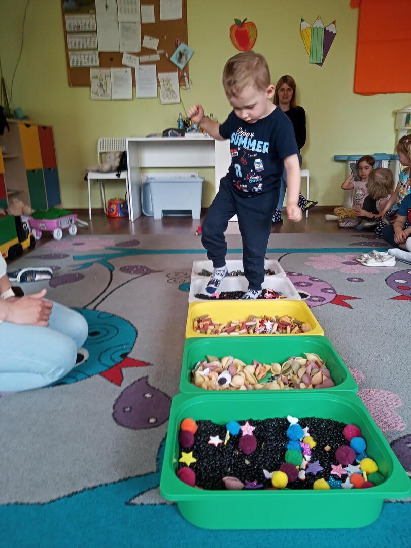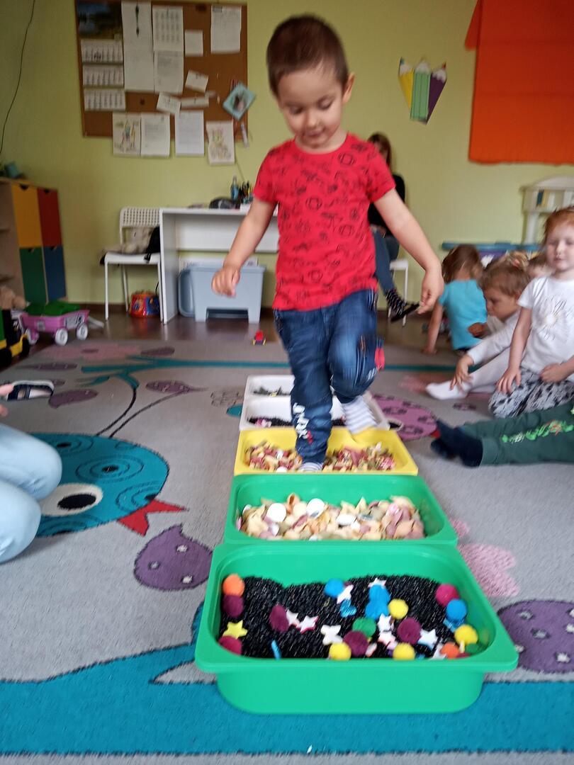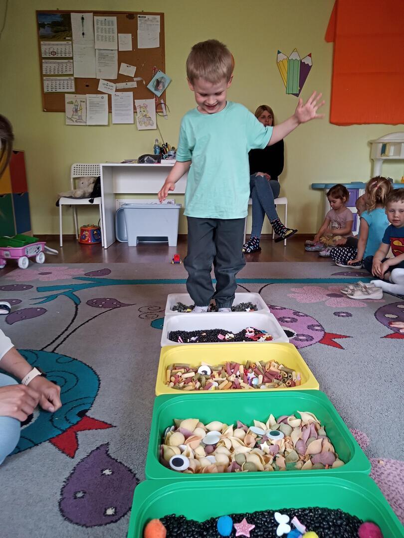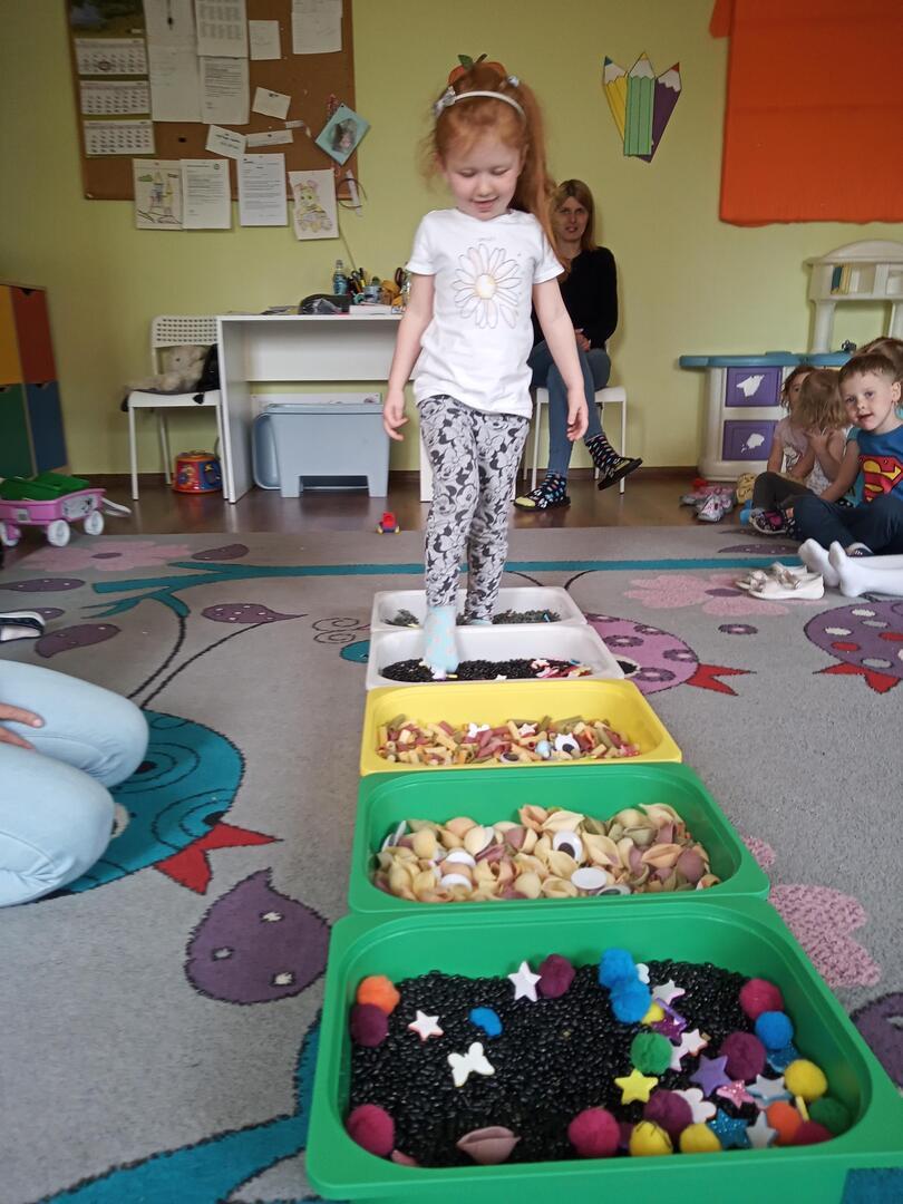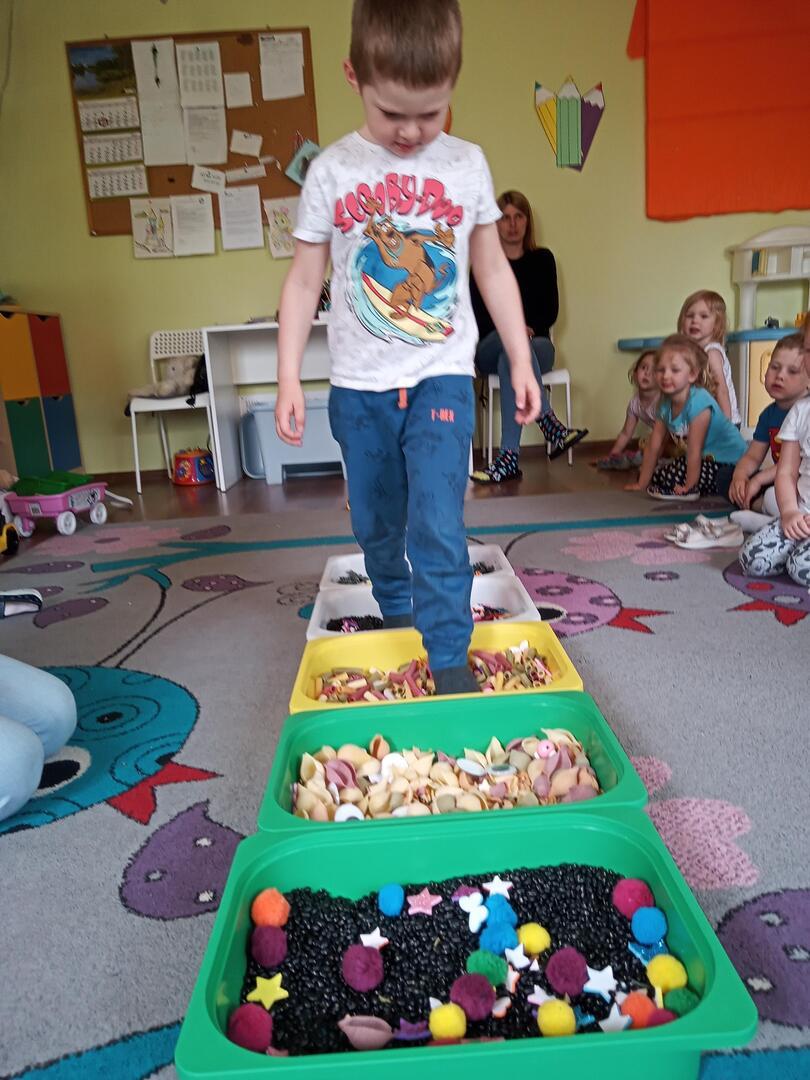 W piątek dnia 21.05.2021r. odbyły się zajęcia z Teatralii. Dzieci brały udział w zabawach sensorycznych, dzięki którym dzieci mogły poznawać  I doświadczać uważnie korzystać z różnych zmysłów, rozwijając wzrok , i dotyk. Dzieci  ćwiczyły sensorykę  także  zabawach ruchowych. Zorganizowany został tor przeszkód na którym dzieci zapoznały się z różnymi fakturami tj: miękki, szorstki, gładki i wypukły. Następnie dzieci mogły zbadać je swoimi stopami, chodząc po różnych powierzchniach.