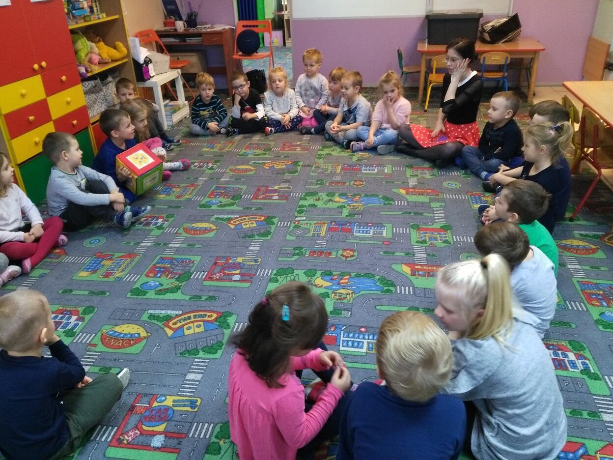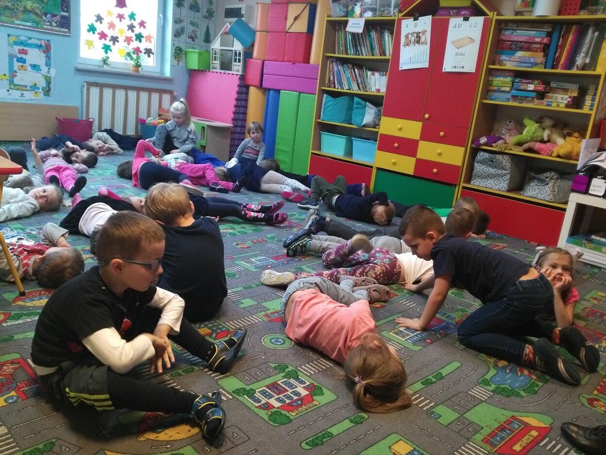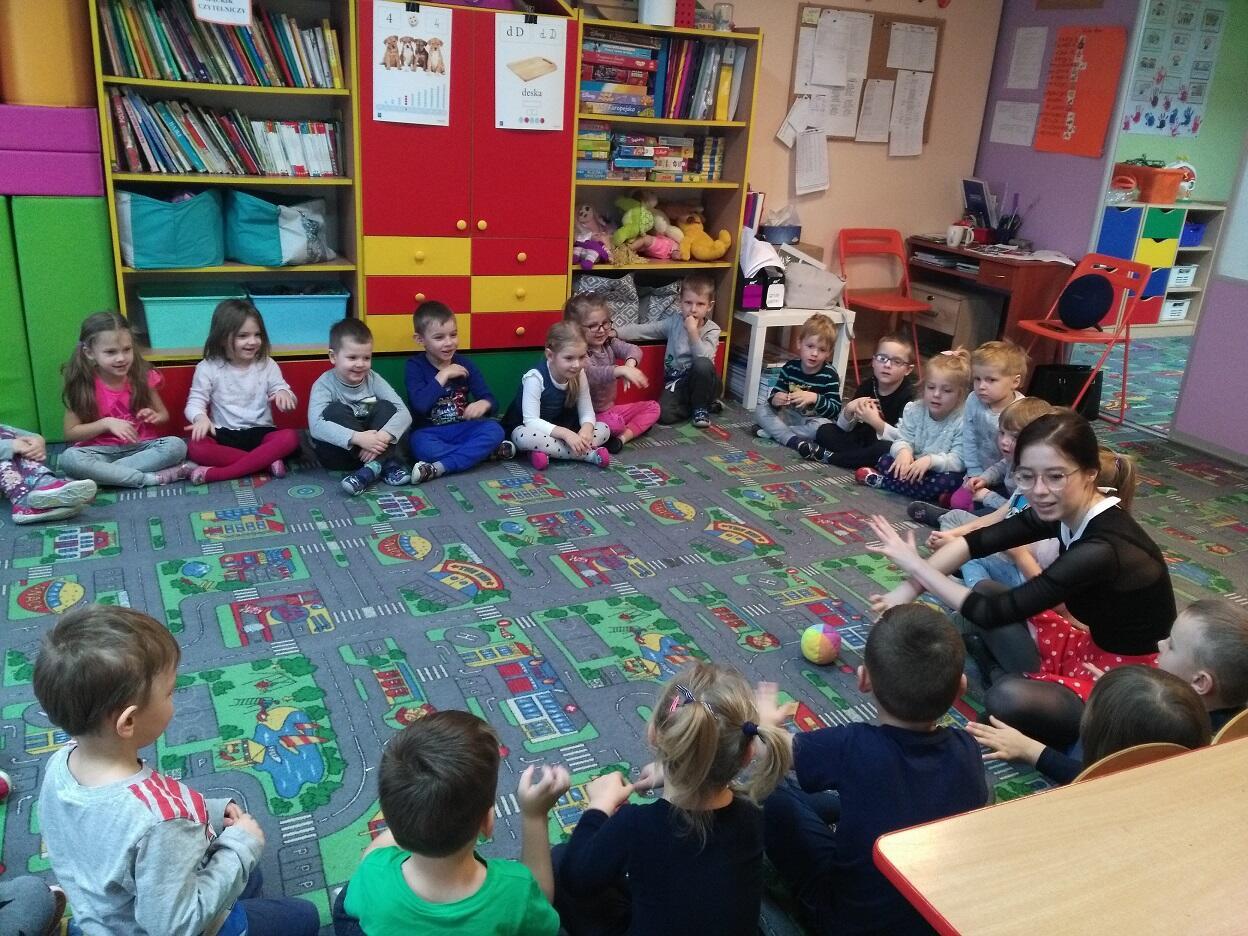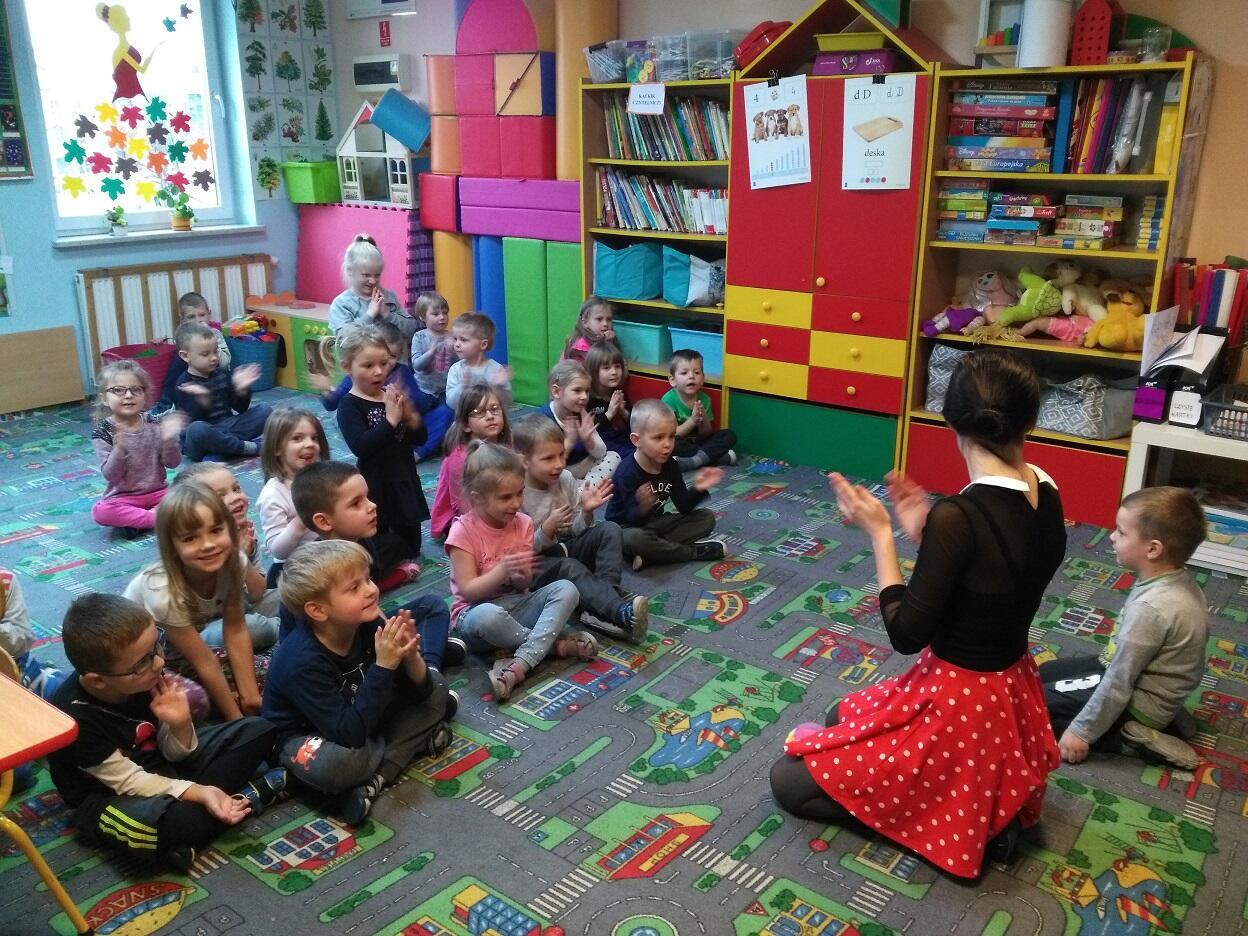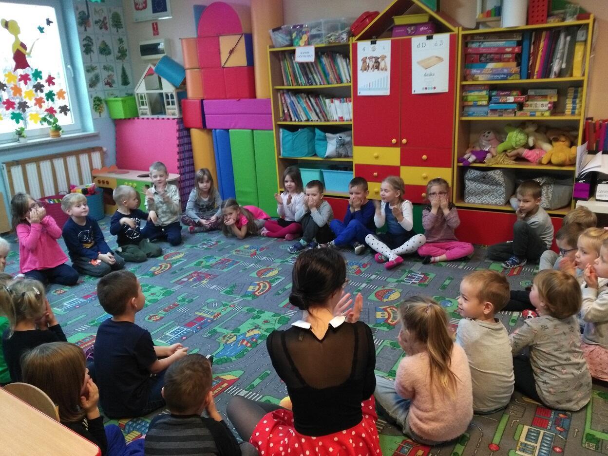 Prowadząca przygotowała dla dzieci wspaniałe zabawy mające na celu kształtowanie umiejętności panowania nad własnymi emocjami oraz nad swobodnym ich wyrażaniem. Ponadto dzieci miały okazję wykazać się swoimi zdolnościami teatralnymi przed widownią, nie zabrakło również zabaw ruchowych, relaksacyjnych przy muzyce.