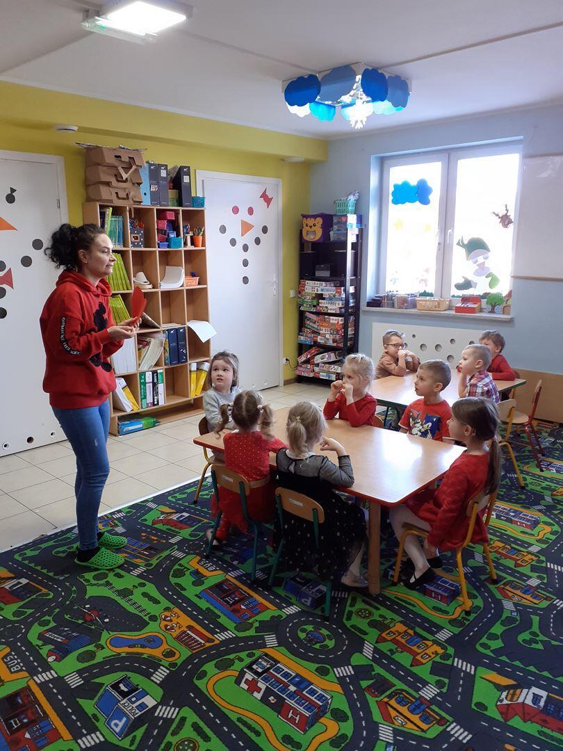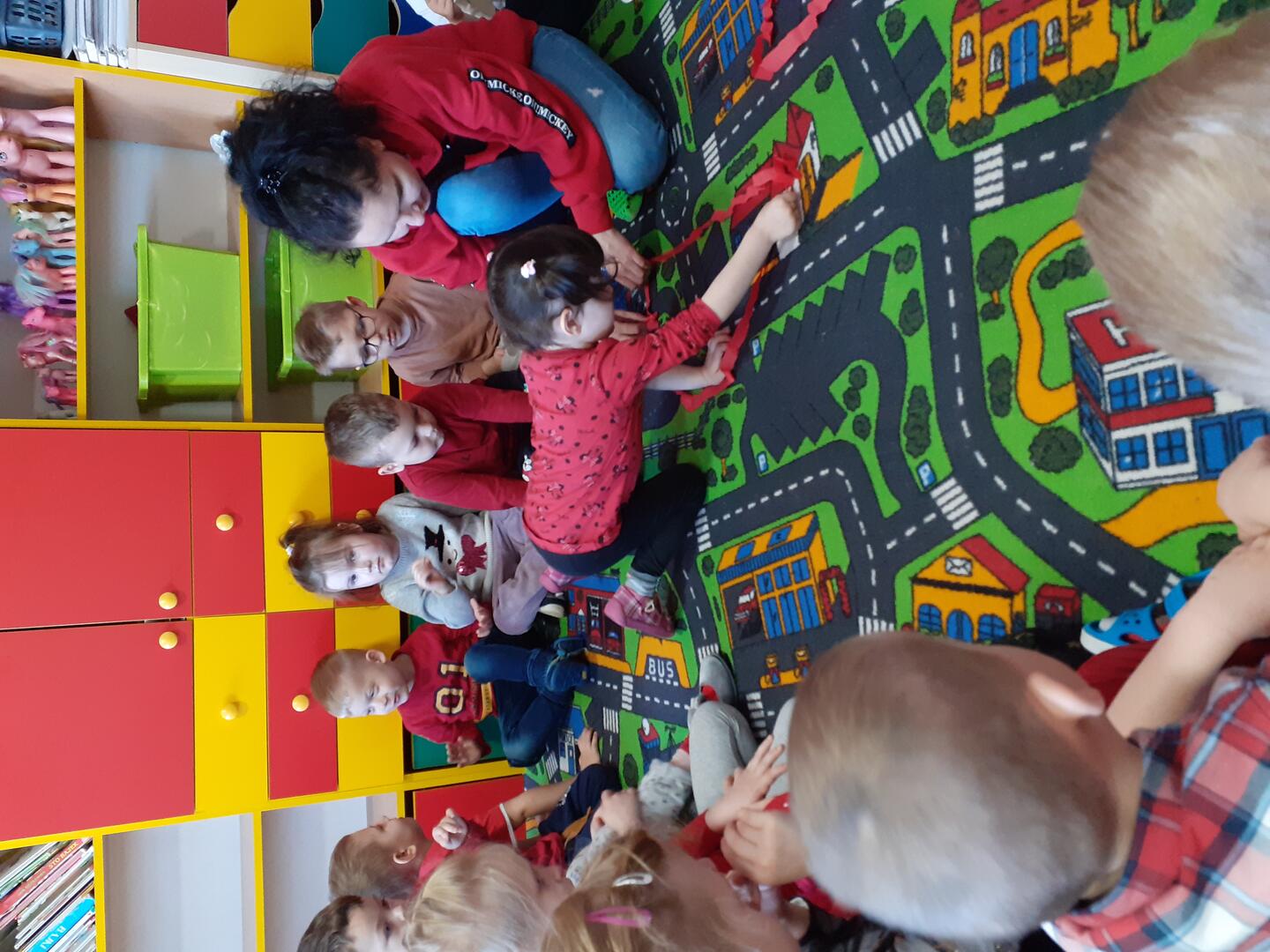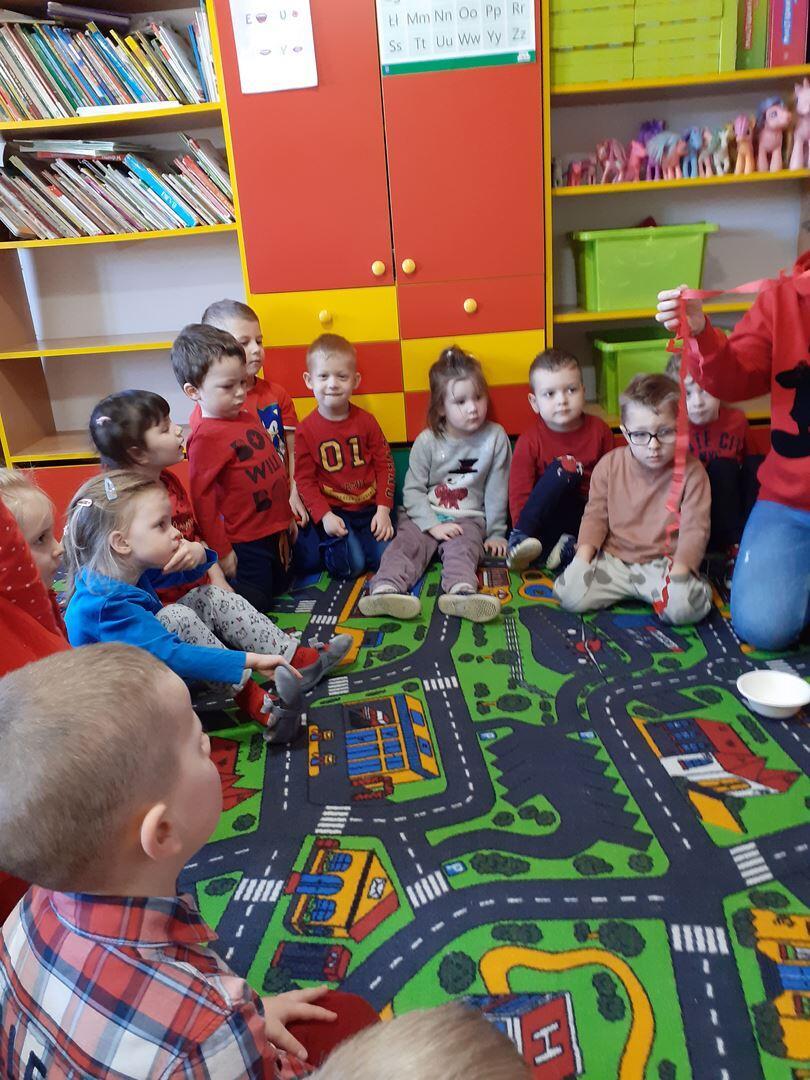 DZIŚ W PRZEDSZJOLU GRUPA MALUSZKÓW I ŚREDNIAKÓW OBCHODZIŁA DZIEŃ ŚWIĘTEGO WALENTEGO. WSPÓLNE ZABAWY NAŚLADOWCZO- RUCHOWE ORAZ PRZYPOMINANIE OMAWIANYCH KOLORÓW.