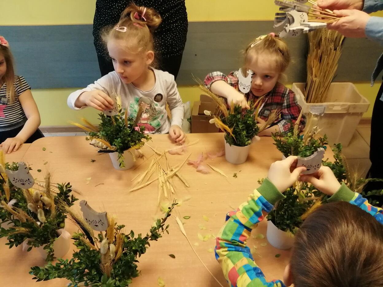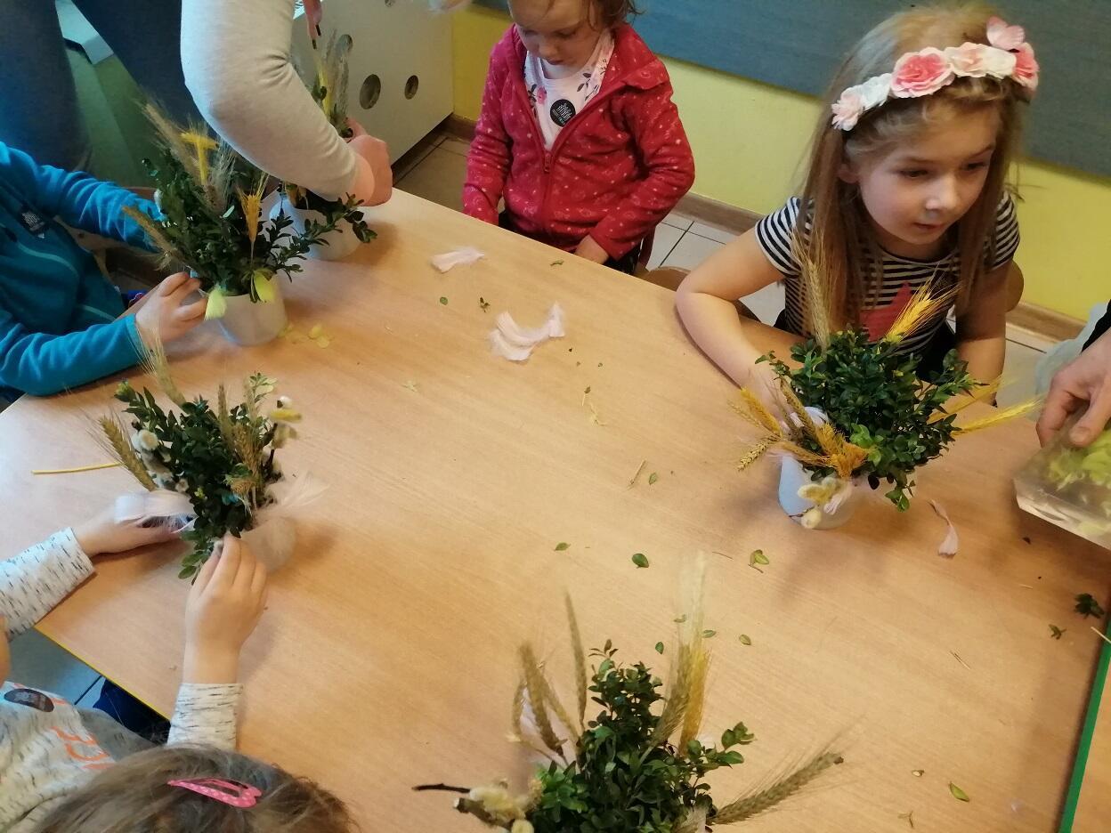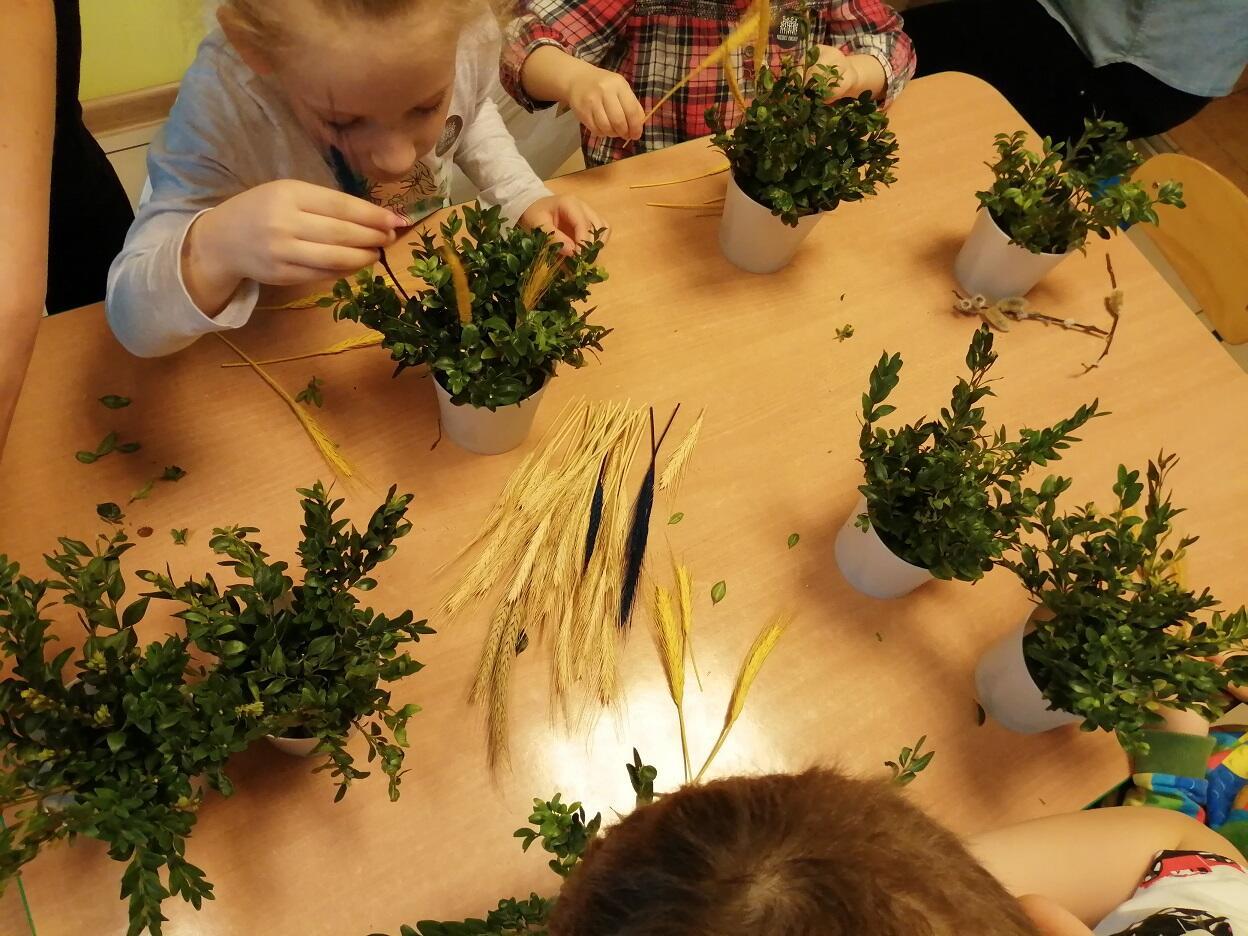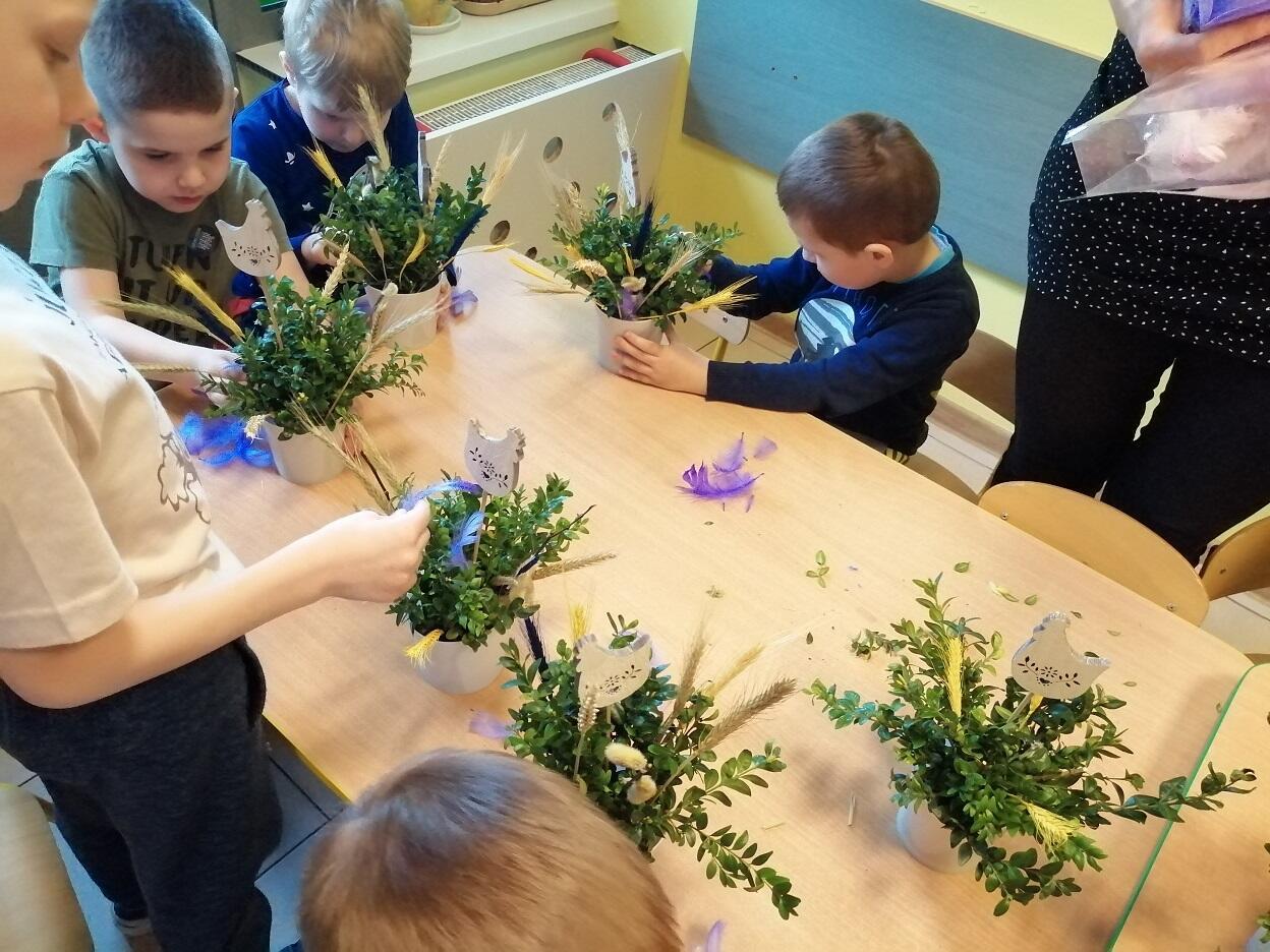 Dnia 11.04.2019 roku w naszym przedszkolu Pani Agnieszka z Panią Ewą po raz kolejny przygotowały wspaniałe warsztaty florystyczne dla naszych podopiecznych. Dzieci miały okazję zapoznać się z zawodem florysty oraz sposobami uprawy roślin i kwiatów. Dzieci bardzo chętnie uczestniczyły w zajęciach, odpowiadały na zadawane pytania, wykonując przy tym powierzone im przez Panie zadania. W dalszej części warsztatów, nasze przedszkolaki, pod czujnym okiem pań florystek, krok po kroku same wykonały kompozycje wiosenne z takich roślin jak bukszpan, zboże ozdobne, styropianowe jajka czy też kolorowe piórka. Wspaniale się przy tym bawiąc.