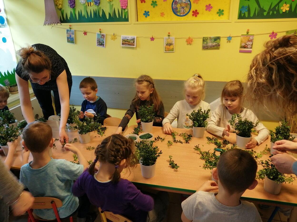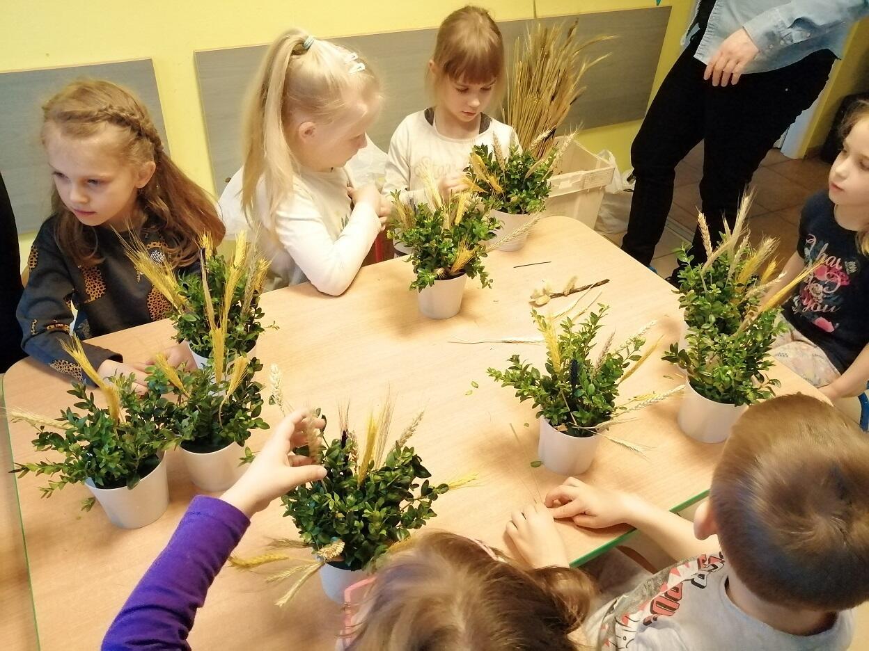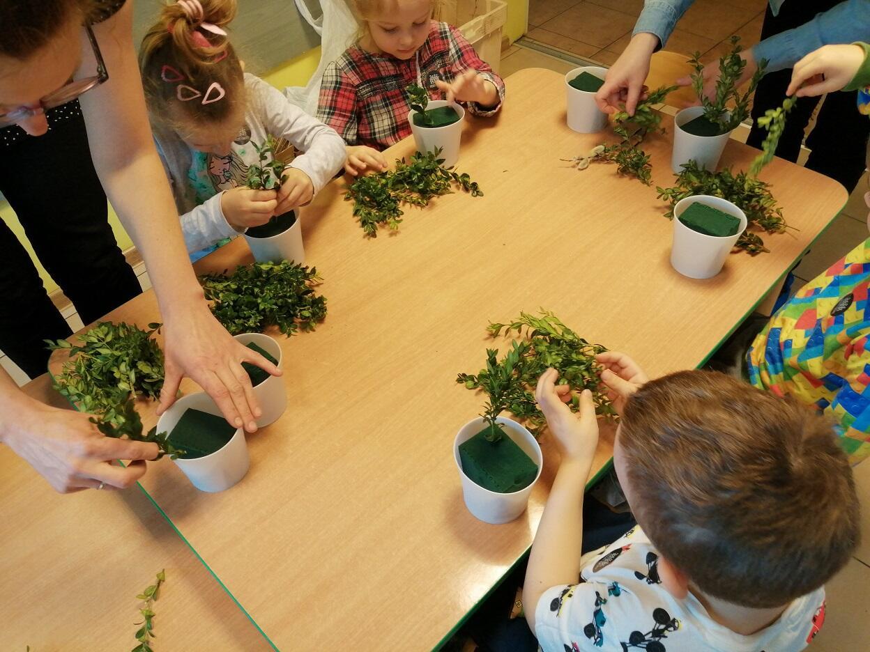 Dnia 11.04.2019 roku w naszym przedszkolu Pani Agnieszka z Panią Ewą po raz kolejny przygotowały wspaniałe warsztaty florystyczne dla naszych podopiecznych. Dzieci miały okazję zapoznać się z zawodem florysty oraz sposobami uprawy roślin i kwiatów. Dzieci bardzo chętnie uczestniczyły w zajęciach, odpowiadały na zadawane pytania, wykonując przy tym powierzone im przez Panie zadania. W dalszej części warsztatów, nasze przedszkolaki, pod czujnym okiem pań florystek, krok po kroku same wykonały kompozycje wiosenne z takich roślin jak bukszpan, zboże ozdobne, styropianowe jajka czy też kolorowe piórka. Wspaniale się przy tym bawiąc.