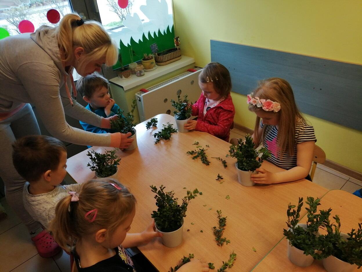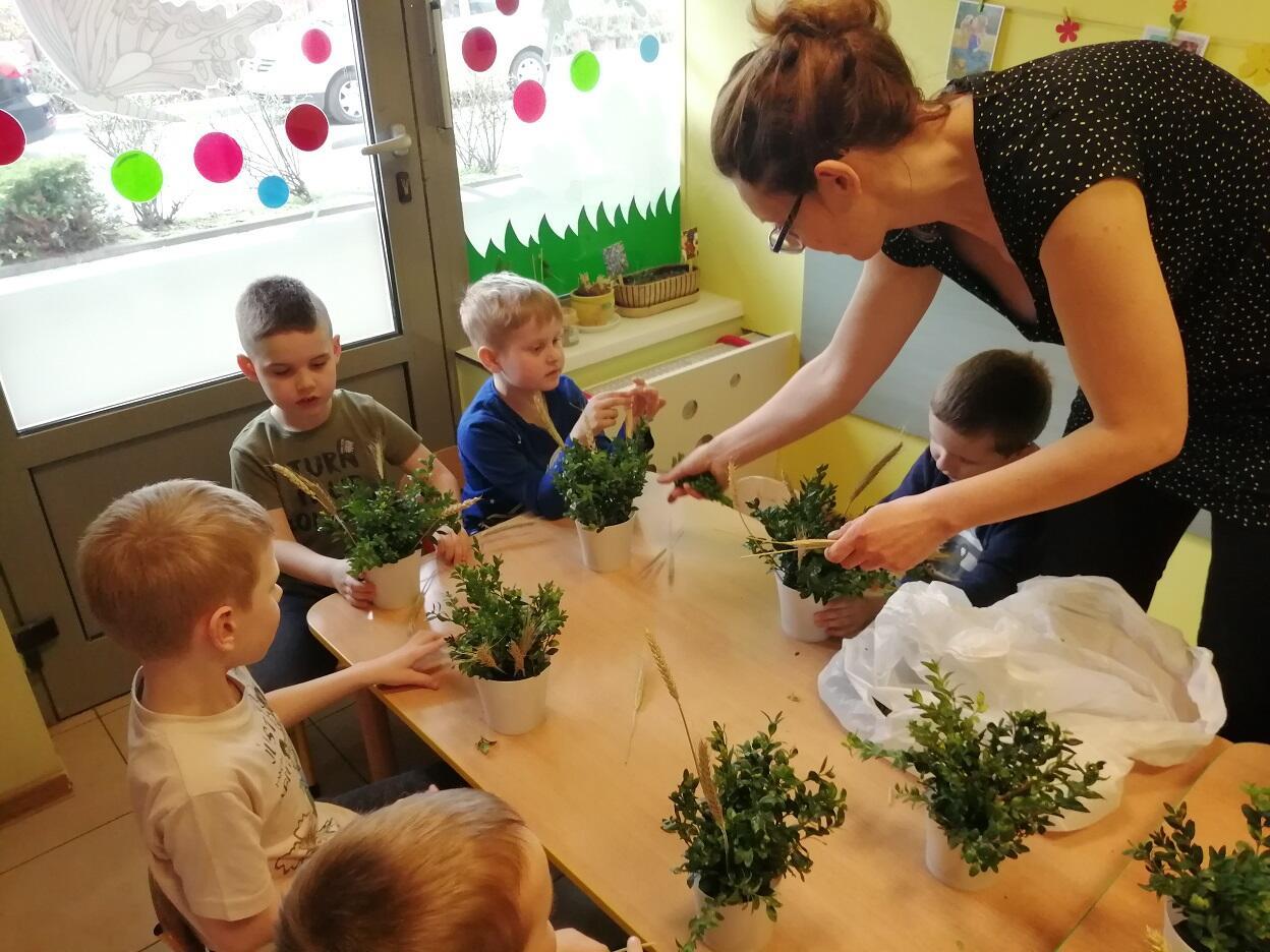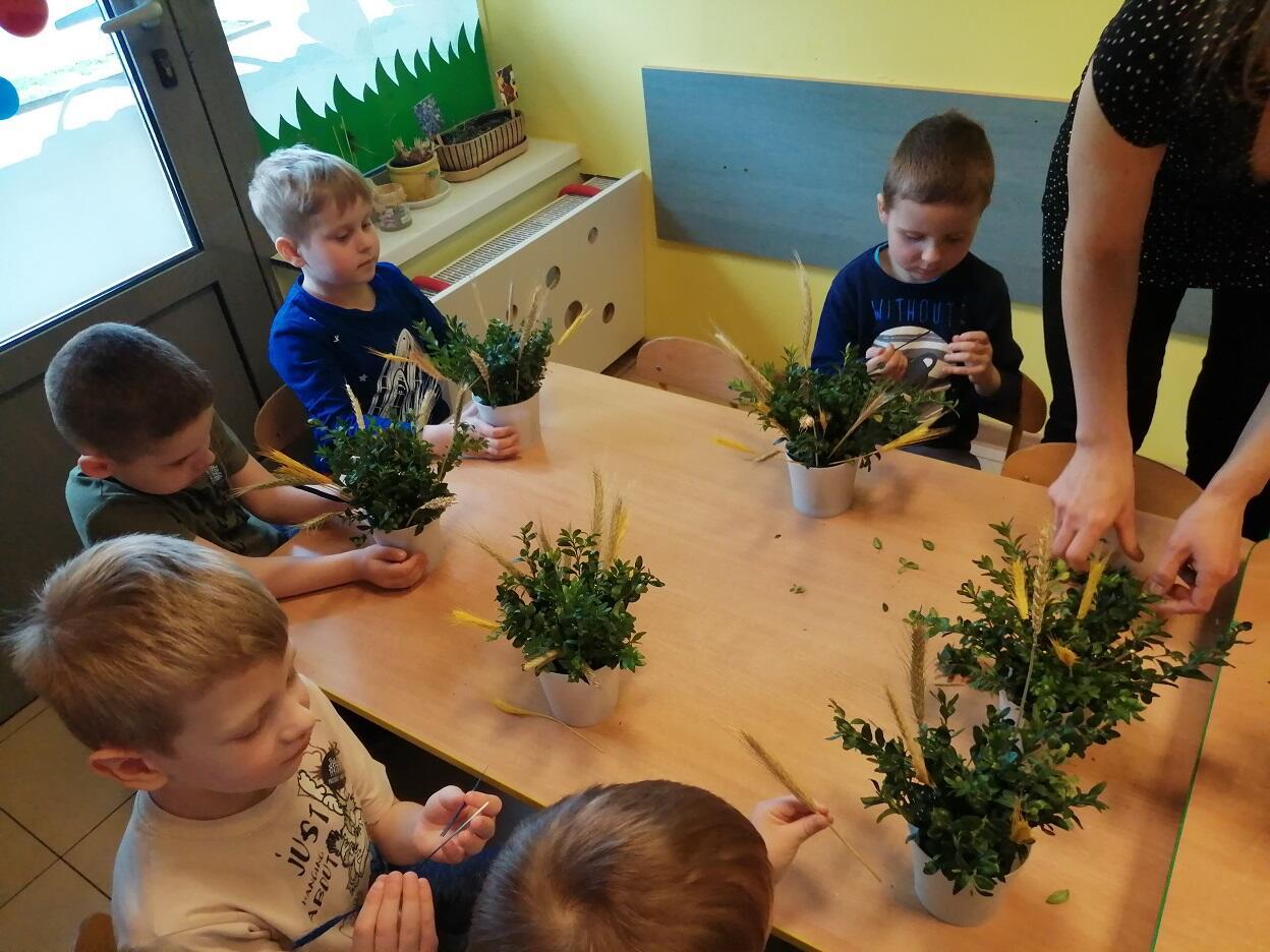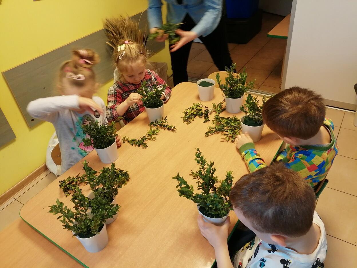 Dnia 11.04.2019 roku w naszym przedszkolu Pani Agnieszka z Panią Ewą po raz kolejny przygotowały wspaniałe warsztaty florystyczne dla naszych podopiecznych. Dzieci miały okazję zapoznać się z zawodem florysty oraz sposobami uprawy roślin i kwiatów. Dzieci bardzo chętnie uczestniczyły w zajęciach, odpowiadały na zadawane pytania, wykonując przy tym powierzone im przez Panie zadania. W dalszej części warsztatów, nasze przedszkolaki, pod czujnym okiem pań florystek, krok po kroku same wykonały kompozycje wiosenne z takich roślin jak bukszpan, zboże ozdobne, styropianowe jajka czy też kolorowe piórka. Wspaniale się przy tym bawiąc.