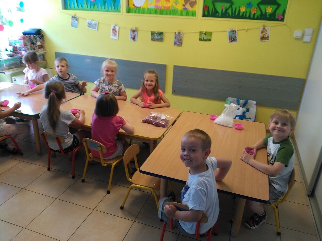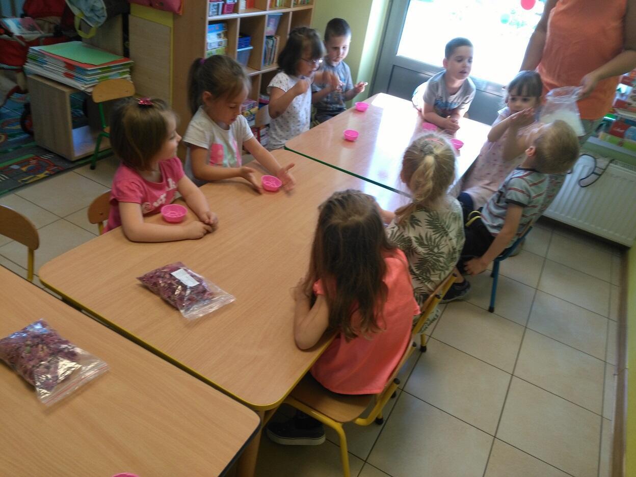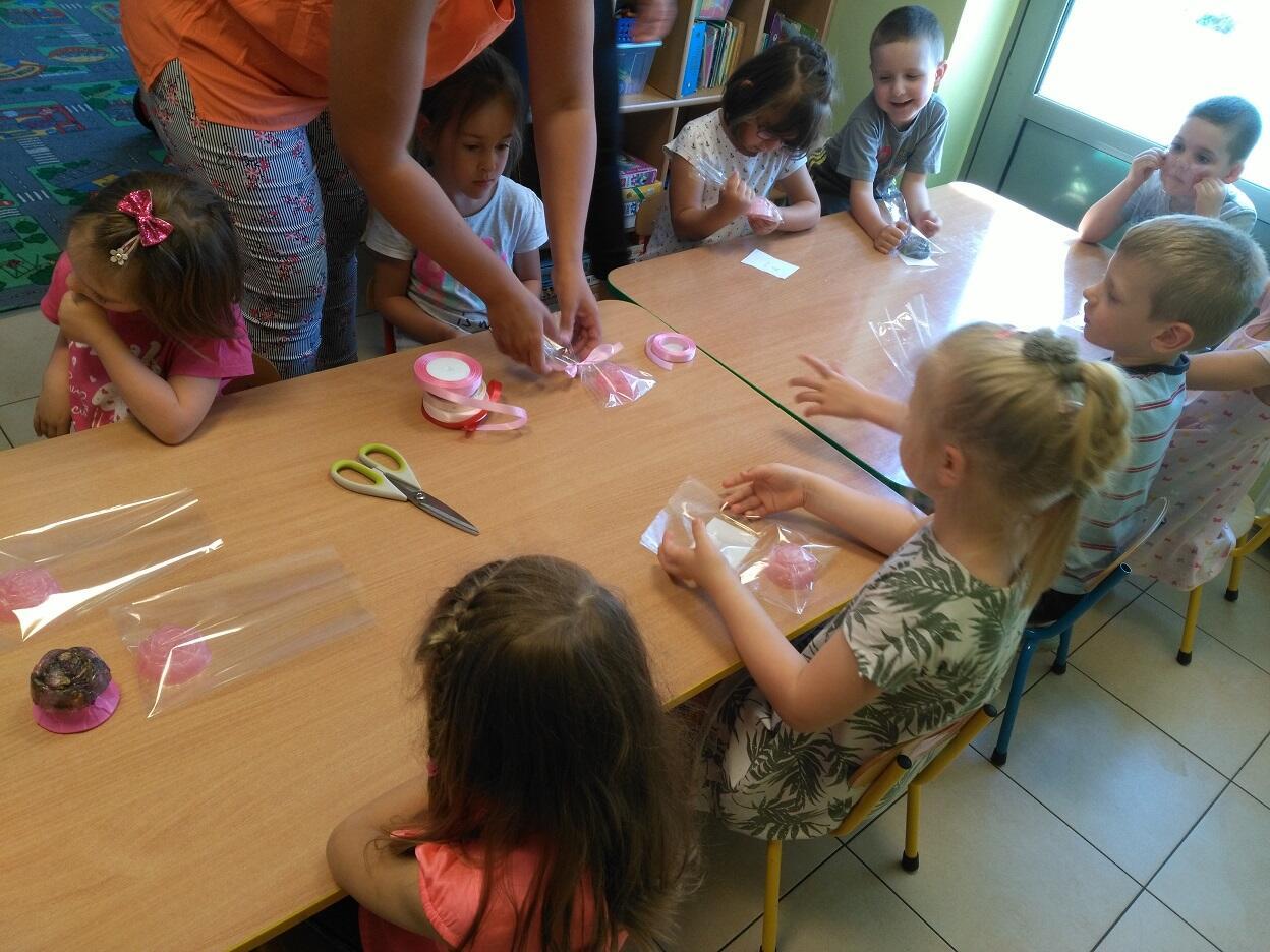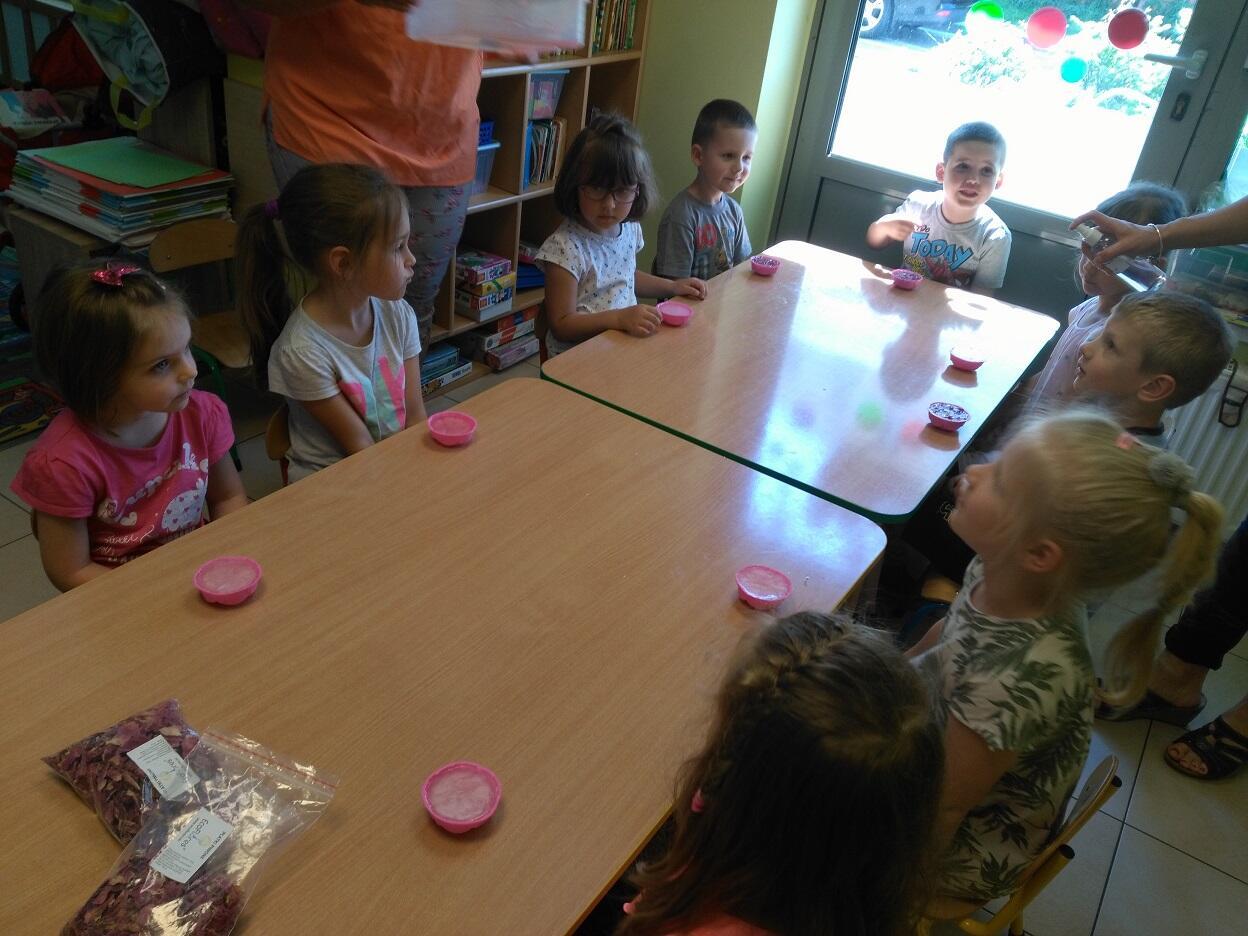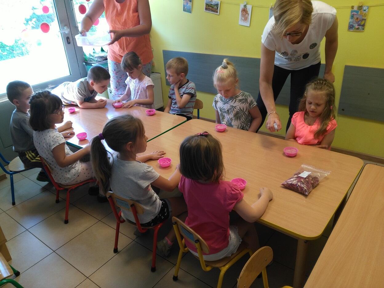 Dnia 14.05.2018 roku, w naszym przedszkolu odbyły się warsztaty mydlarskie, na których dzieci miały okazję zapoznać się z etapami i elementami niezbędnymi do tworzenia mydła. Z gliceryny tworzyły mydełka w wybranym przez siebie kształcie, kolorze i zapachu. Mogły zatopić w nich różne składniki wzbogacające wygląd i jakość mydełka tj. płatki piwonii. Po wykonaniu i zastygnięciu mydełka, dzieci zapakowały je w celofanowe torebki oraz ozdobiły wybraną przez siebie kolorową tasiemką.