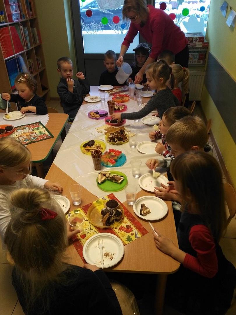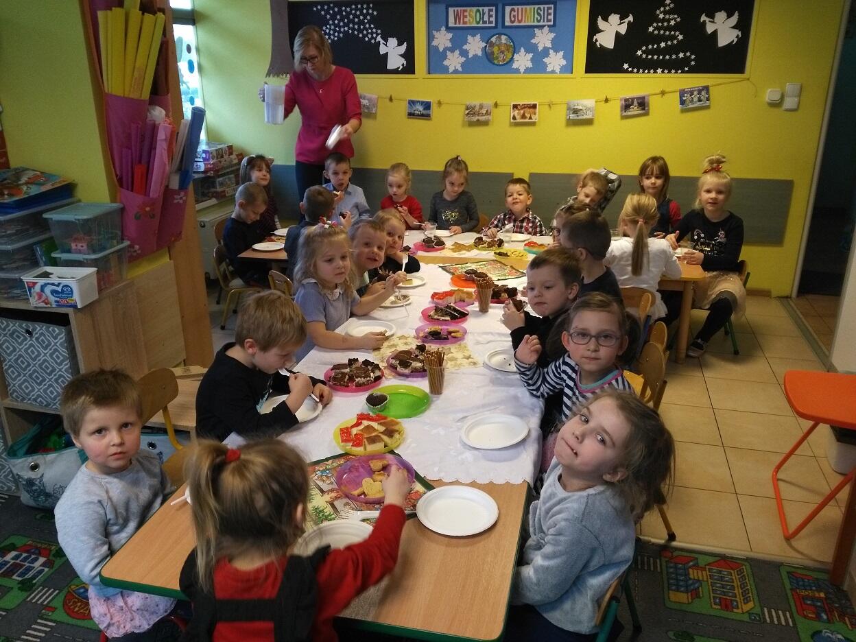 Dnia 21.12.18 roku dzieci w odświętnych strojach, po uprzednim podzieleniu się opłatkiem oraz złożeniu sobie świątecznych życzeń, zasiadły przy wigilijnym stole. Nie zabrakło również wspólnego śpiewania kolęd. Uroczystość zakończyła się słodkim poczęstunekiem przygotowanym przez rodziców. Dziękujemy rodzicom za zaangażowanie.
