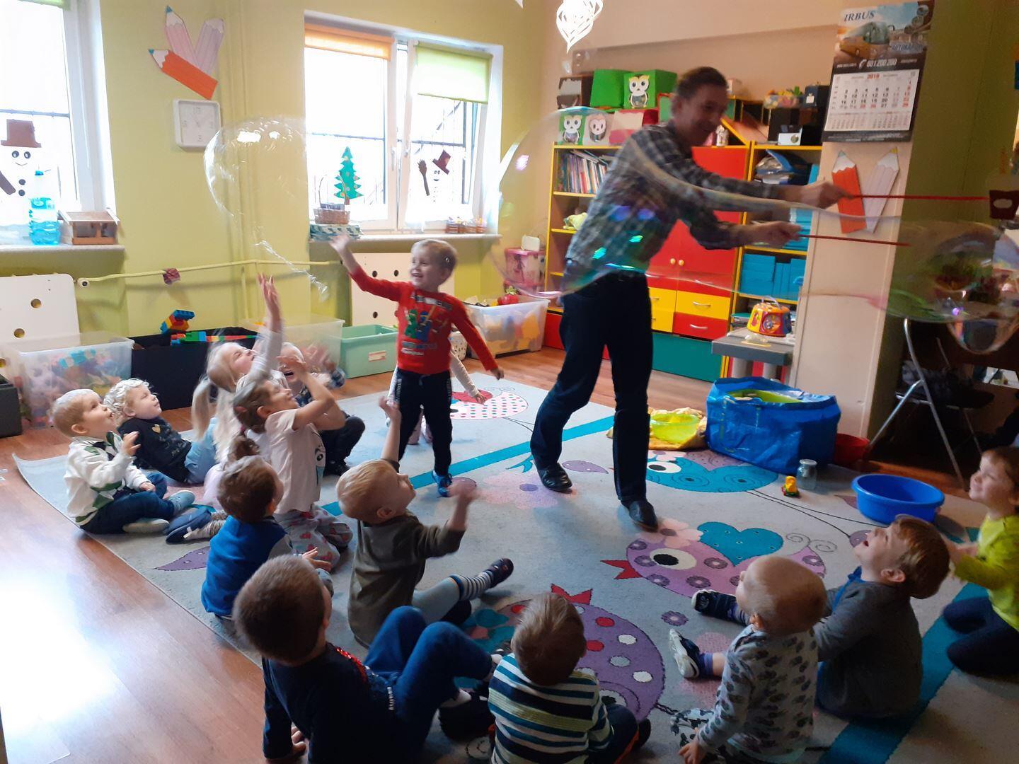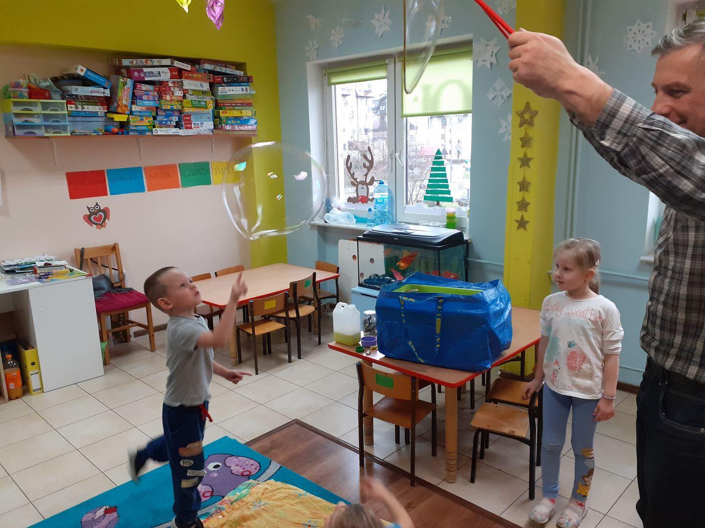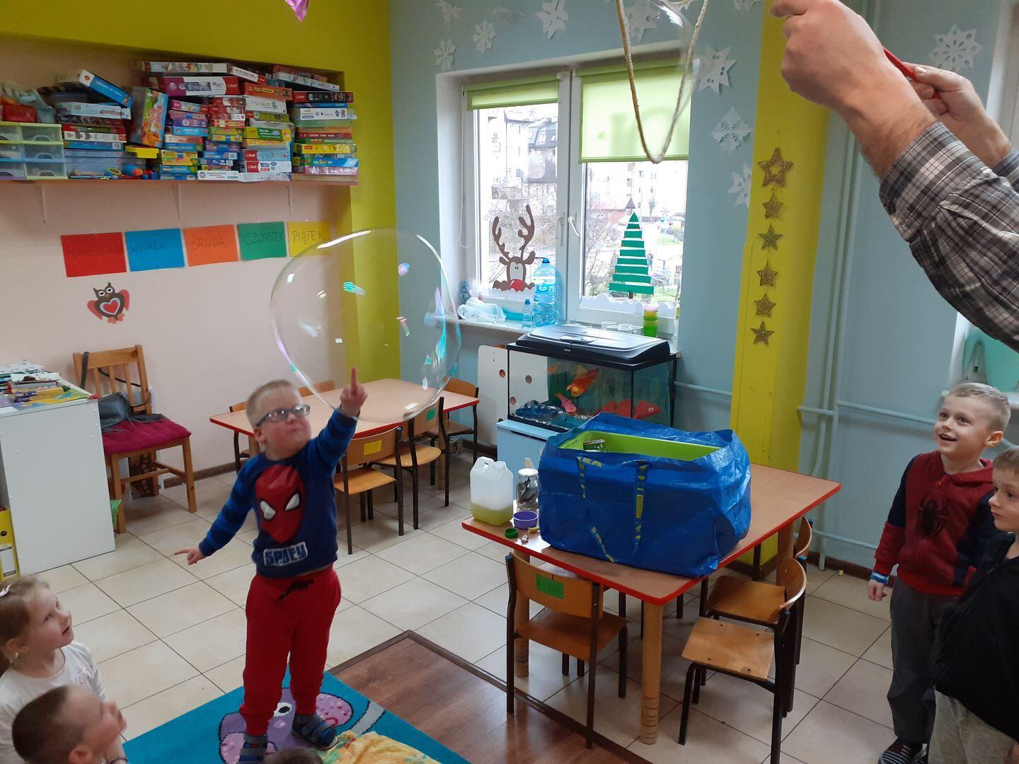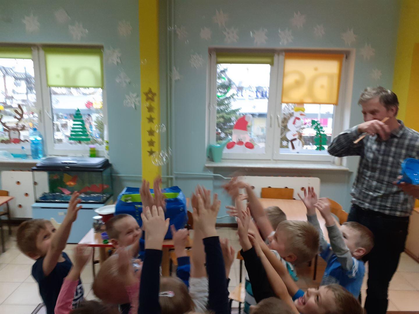 Dzisiaj zawitał do nas niespodziewany gość - Pan fizyk. Pan przedstawił nam jak działa cząsteczkowy świat  wody w połączeniu z detergentami.  Mieliśmy okazję dotykać gigantyczne bańki oraz zobaczyć dziurę w wodzie. To były niesamowite doświadczenia!