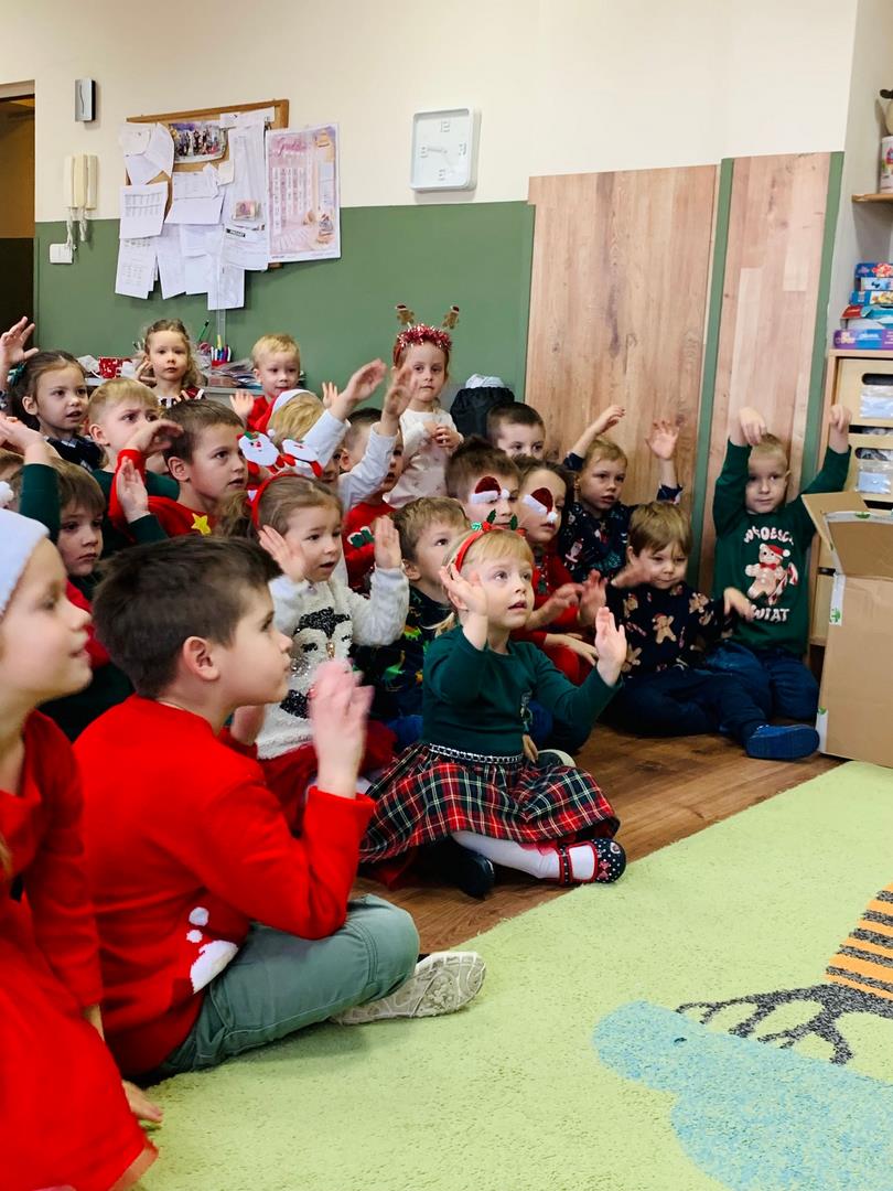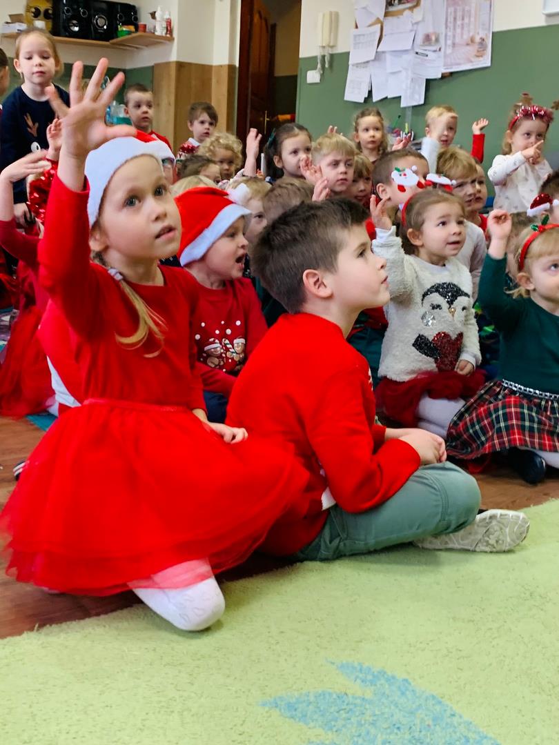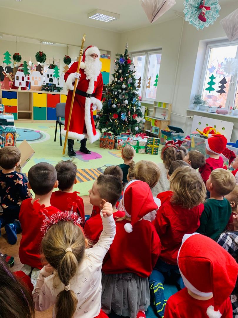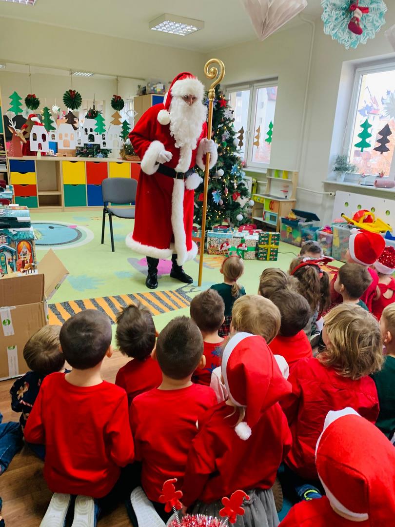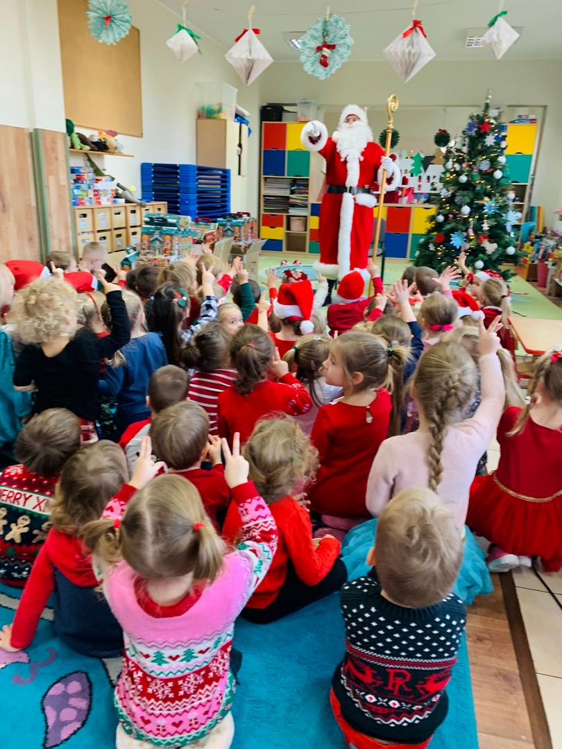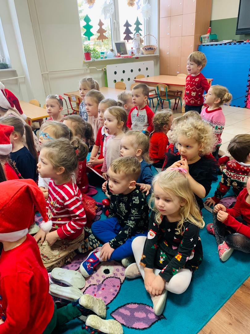 Co to by były za emocje!  Odwiedził nas dzisiaj Mikołaj, opowiedział nam o swojej pracy, tańczył z nami wesoło, pokazując różne gesty. Cała sala poczuła magię świąt.