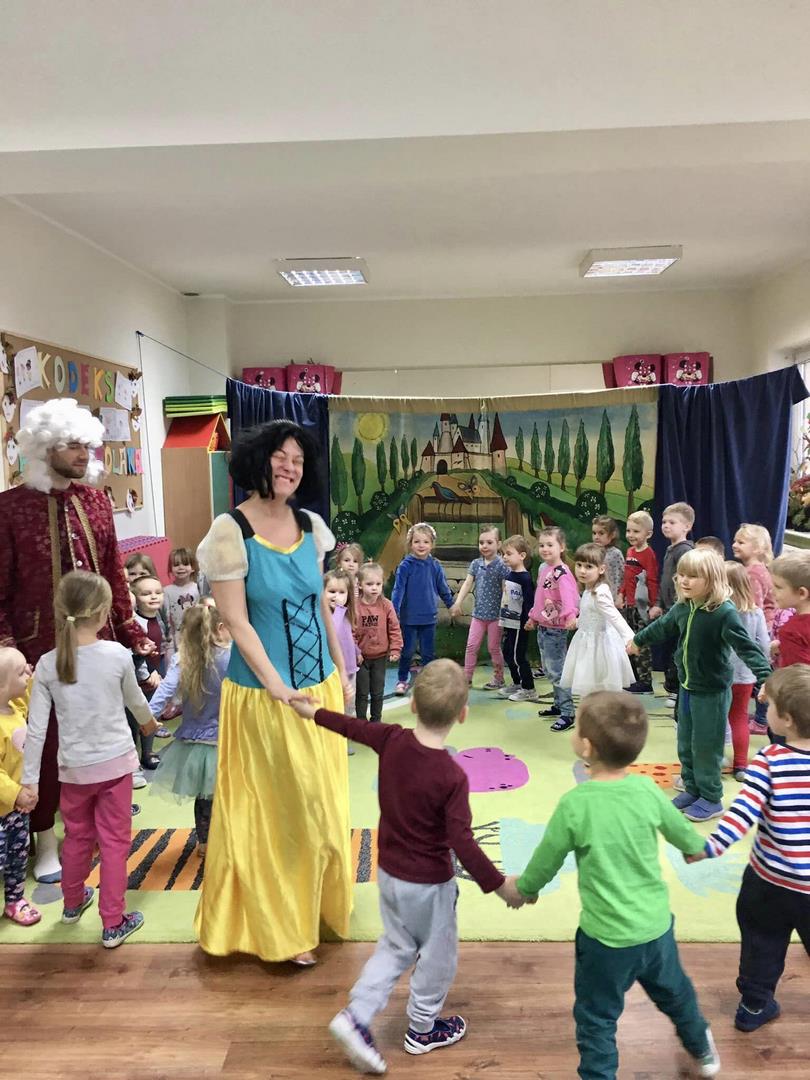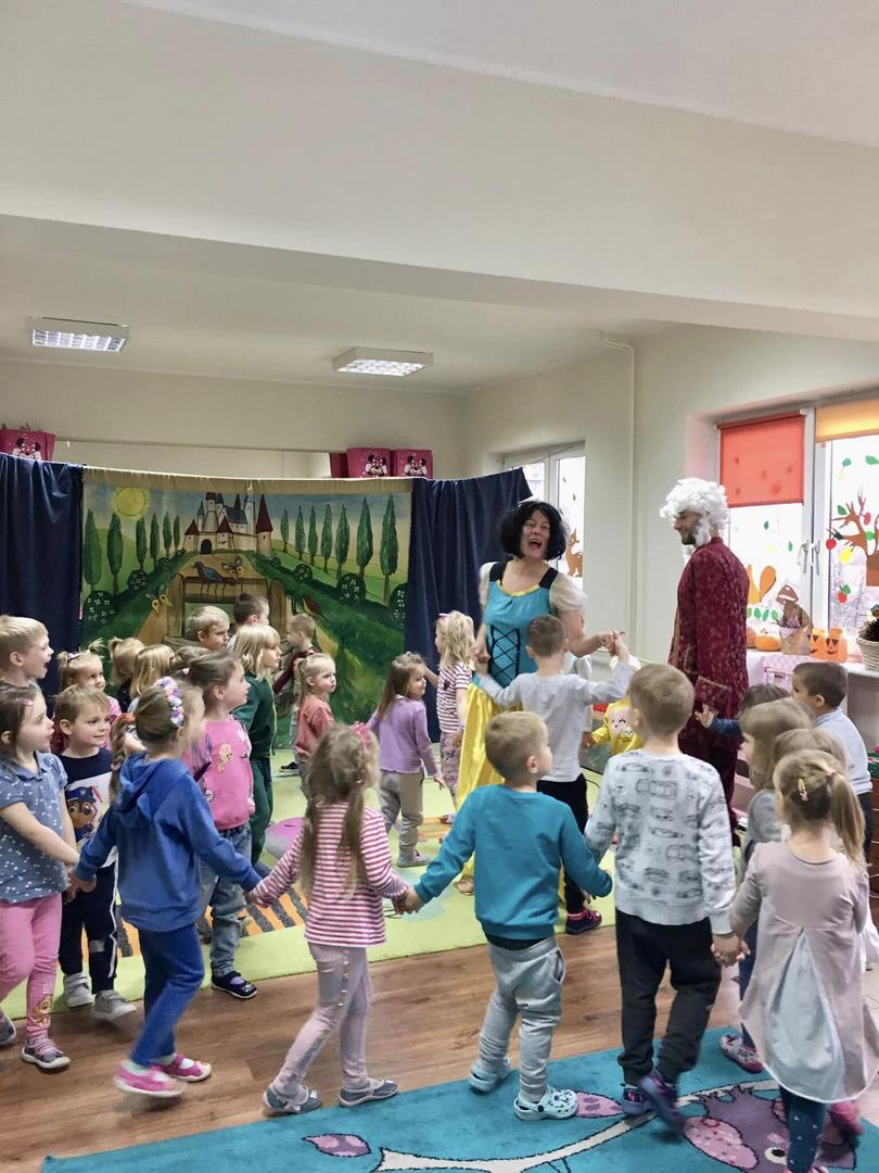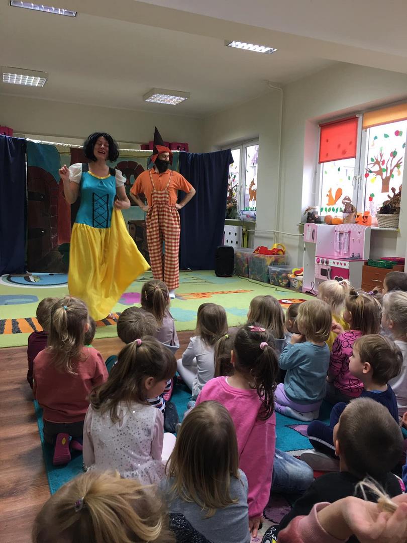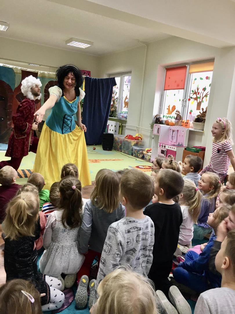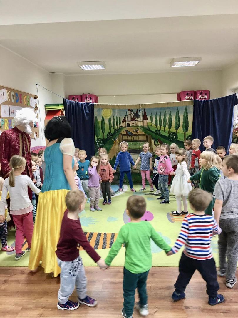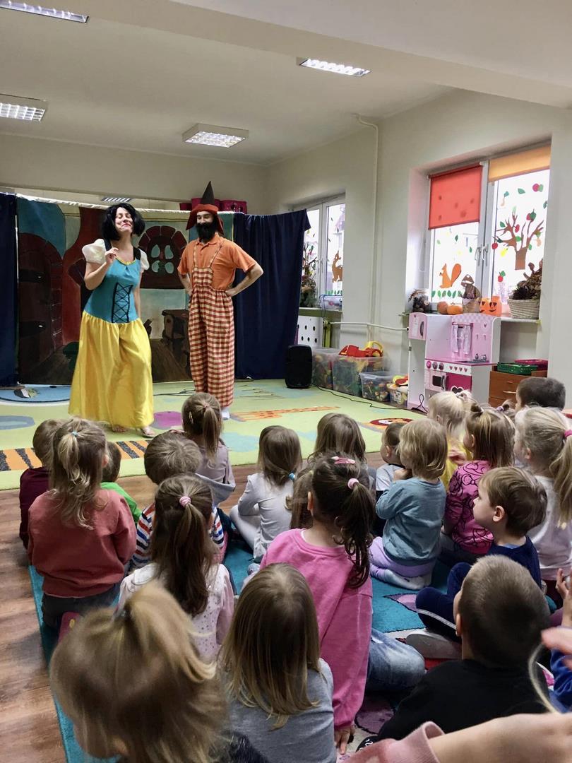 Teatr Krak-Art odwiedził nas 23 listopada, przedstawiając historię Królewny Śnieżki. ?Aktorzy pokazali dzieciom jak cenne w życiu potrafią być wartości, do których zaliczamy: miłość, przyjaźń i troskę, w przeciwieństwie do urody i władzy, które mogą doprowadzić do zguby i szaleństwa. Śnieżka, która została wygnana przez złą macochę z zamku swojego ojca, znajduje w lesie schronienie, w domku siedmiu krasnoludków. Nieopodal chatki poznaje młodego księcia, który informuje ją o bezlitosnych rządach i czynach obecnej królowej. Śnieżka spotyka też na swojej drodze biedną staruszkę, która obdarowuje dziewczynę zatrutym jabłkiem. Natychmiast po spróbowaniu owocu, Śnieżka traci przytomność, a wszyscy jej przyjaciele myślą, że Królewna umarła. Książę stara się złamać zaklęcie rzucone przez królową i przy współpracy z krasnoludkami udaje mu się wybudzić Śnieżkę. Zakochany Książę prosi dziewczynę o rękę i zaprasza wszystkich do świętowania zaręczyn, wspólnie bawiąc się i tańcząc. ??❤️