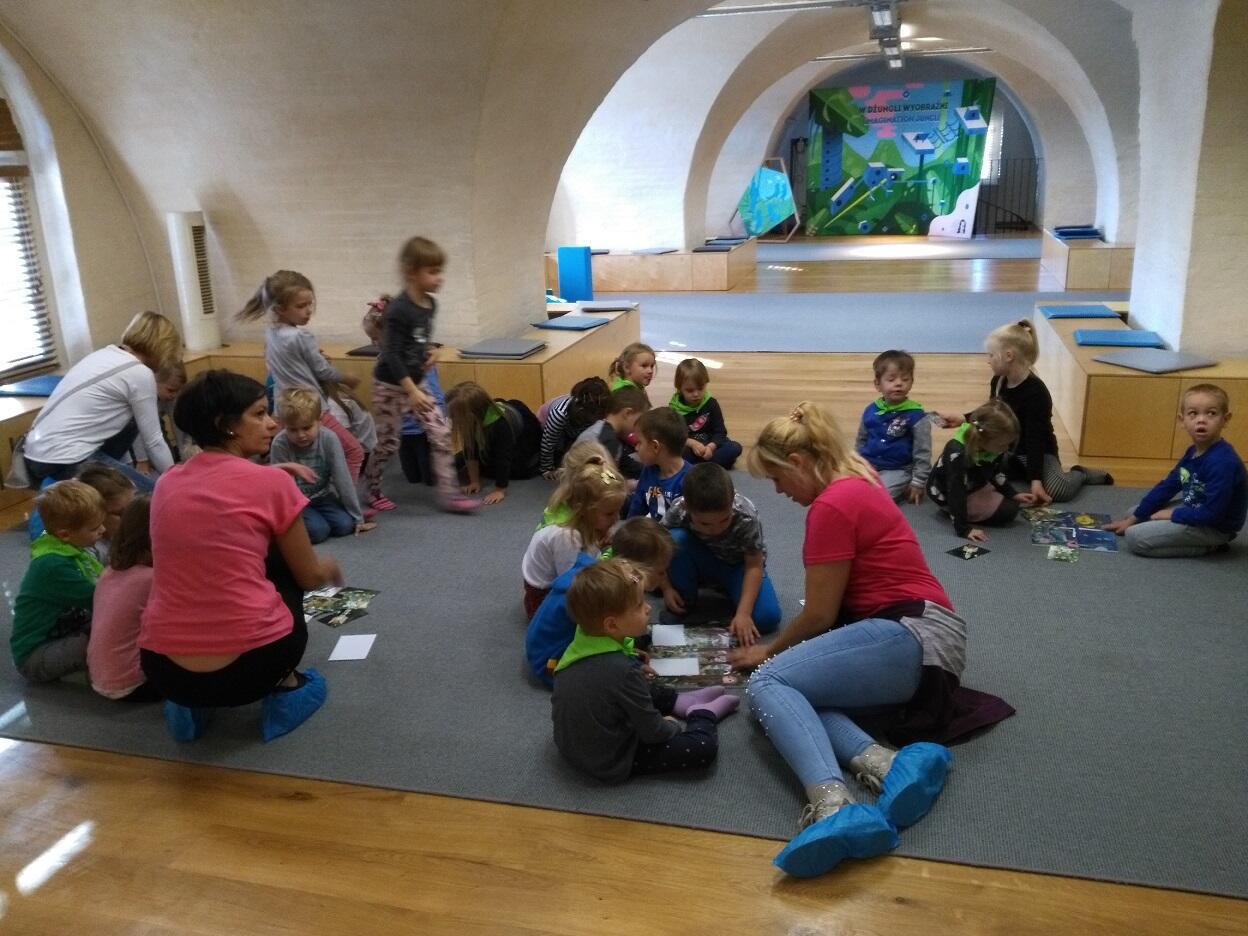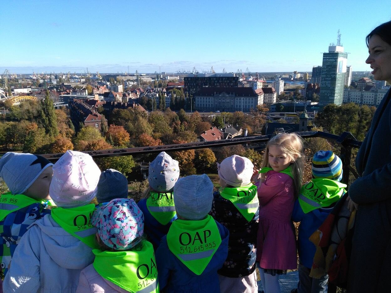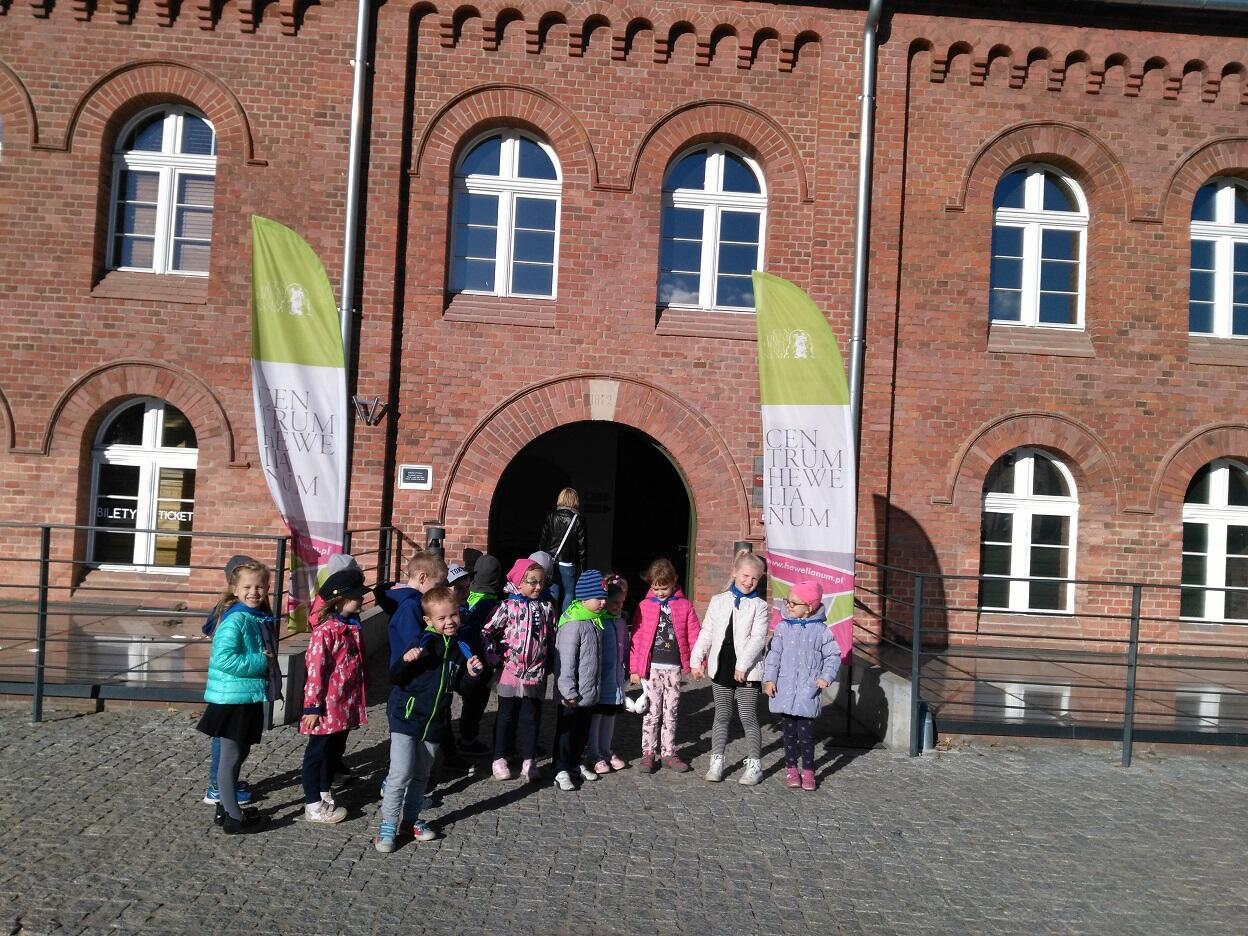 Dnia 19 października przedszkolaki miały okazję odwiedzić „Centrum Hewelianum” w Gdańsku. W pierwszym etapie wycieczki zostaliśmy zaproszeni do udziału w zadaniach przygotowanych przez animatora na interaktywnym placu zabaw; dzieci rozwiązywały zagadki, uzupełniały obrazki o brakujące części oraz miały okazję przy pomocy pracy zespołowej stworzyć budowle z klocków według własnego pomysłu. W końcowym etapie odwiedziliśmy dwie bajkowe krainy składające się na kolorowe „Laboratorium Pana Kleksa”. W pierwszej kolejności dzieci w wyjątkowej scenerii poszukiwały bohaterów wierszy Jana Brzechwy. Następnie Pani animator zabrała dzieci w podróż „na księżyc”, w związku z czym ubraliśmy bezpieczne kombinezony, wsiedliśmy do statku i wyruszyliśmy w drogę. Na zakończenie wycieczki zwiedzilismi wspólnie "Górę Gradową", z której podziwialiśmy panoramę Gdańska.