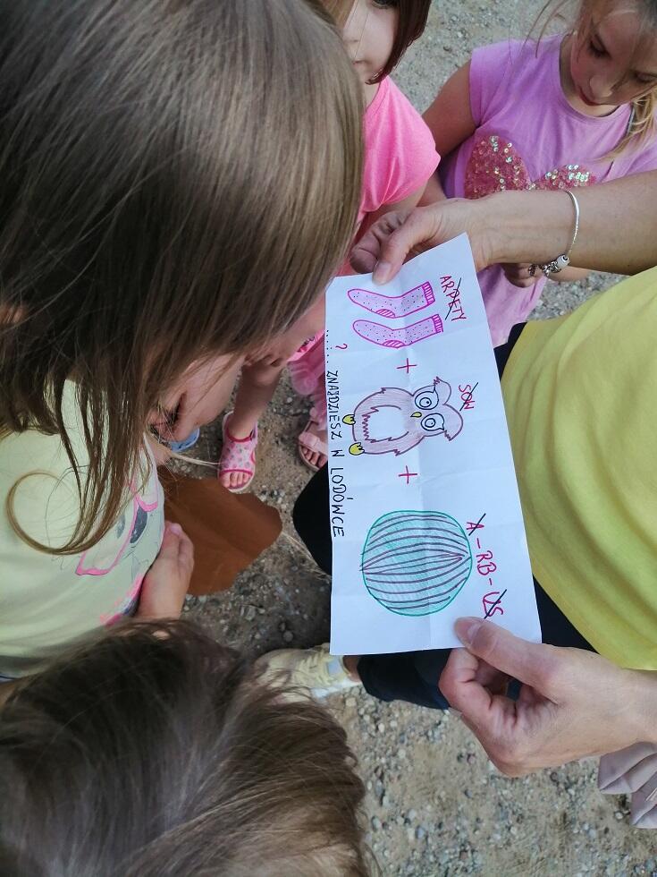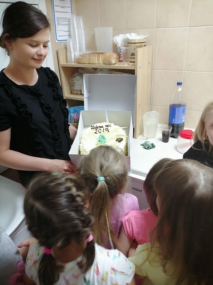 Ten wyjątkowy dzień rozpoczeliśmy od zabaw dowolnych w naszym przedszkolu. Gdy zaczął zapadać zmrok zaczęły się przygotowania do wyprawy po skarb. Dzieci wyposażone w znalezioną mapę skarbów, wybrały się w wędrówke po okolicy przedszkola w poszukiwaniu wskazówki do jego odnalezienia. Po tym trudnym zadaniu, z którym nasze starszaki poradziły sobie wspaniale, za słowami  odnalezionej wskazówki, które brzmiały "SKARB ZNAJDZIESZ W LODÓWCE" udaliśmy się w drogę powrotną do naszego przedszkola. Ku naszemu zaskoczeniu odnalezionym skarbem okazał się pyszny tort, który dzieci spożyły ze smakiem. Po wędrówce pełnej wrażeń wybraliśmy się do "kina", w którym dzieci obejrzały bajkę pt. "Dzieciak rządzi", podczas seansu nie mogło zabraknąc popcornu. Dzień pełen wrażeń zakończyła kolacja, na której dzieci zjadły pizze oraz wypily pyszną lemoniade cytrusową. Każdy z uczestników ZIELONEJ NOCY wykazał się wielką odwagą, gdyż wytrwał do samego rana. To była dla wszystkich niezwykła noc, która na długo pozostanie w pamięci każdego z nas.